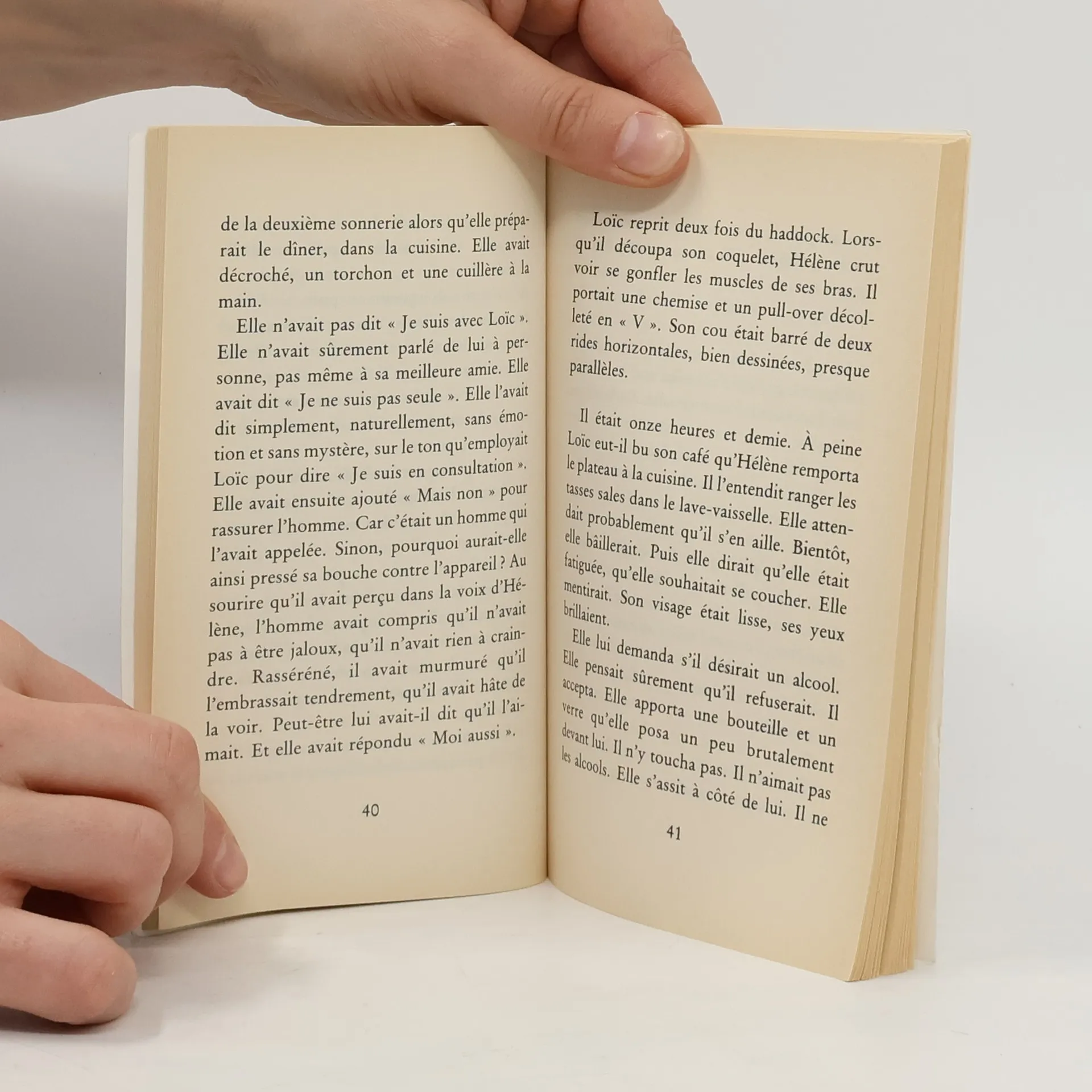 "Ils se revirent quelques jours plus tard. Loïc sonna à la porte d'Hélène. Il l'entendit marcher sans hâte. Elle ne courait pas pour venir lui ouvrir. Elle n'avait pas guetté son arrivée, feuilletant un journal sans pouvoir le lire. Elle l'embrassa sur les joues. Elle était particulièrement maquillée. Il distingua des particules scintillantes dans sa poudre. Loïc n'avait jamais vu Hélène d'aussi près. Il ne l'avait jamais touchée, jamais effleurée. Il disait bonjour ou bonsoir sans lui serrer la main, sans même s'approcher d'elle."