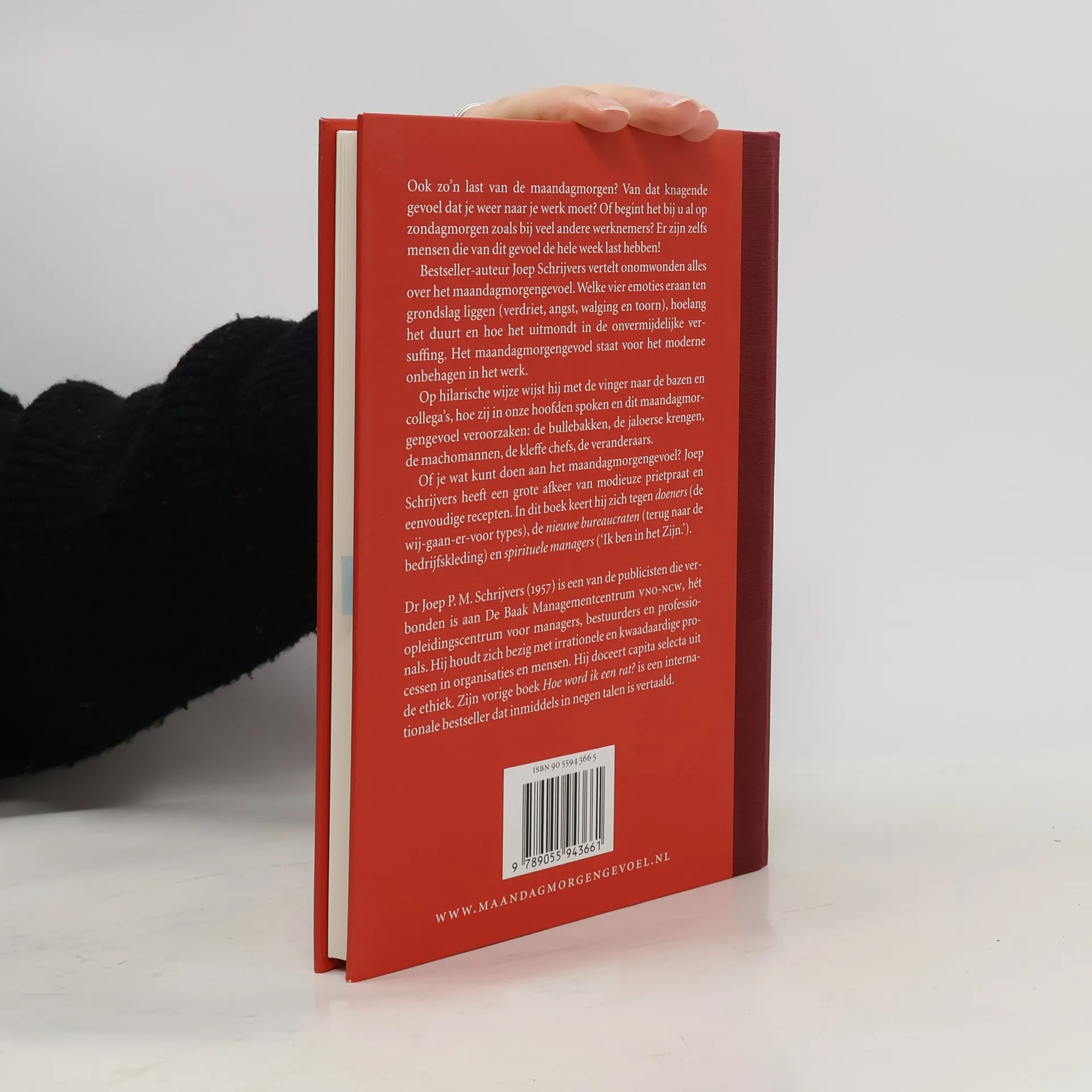 Ook zo'n last van de maandagmorgen? Van dat knagende gevoel dat je weer naar je werk moet? Of begint het bij u al op zondagmorgen zoals bij veel andere werknemers? Er zijn zelfs mensen die van dit gevoel de hele week last hebben! Bestseller-auteur Joep Schrijvers vertelt onomwonden alles over het maandagmorgengevoel. Welke vier emoties eraan ten grondslag liggen (verdriet, angst, walging en toorn), hoelang het duurt en hoe het uitmondt in de onvermijdelijke versuffing. Het maandagmorgenvoel staat voor het moderne onbehagen in het werk. Op hilarische wijze wijst hij met de vinger naar de bazen en collega's, hoe zij in onze hoofden spoken en dit maandgmorgengevoel veroorzaken: de bullebakken, de jaloerse krengen, de machomannen, de kleffe chefs, de veranderaars. Of je wat kunt doen aan het maandagmorgengevoel? Joep Schrijvers heeft een grote afkeer van modieuze prietpraat en eenvoudige recepten. In dit boek keert hij zich tegen doeners (de wij-gaan-er-voor-types), de nieuwe bureaucraten (terug naar de bedrijfskleding) en spirituele managers ('Ik ben in het Zijn.').