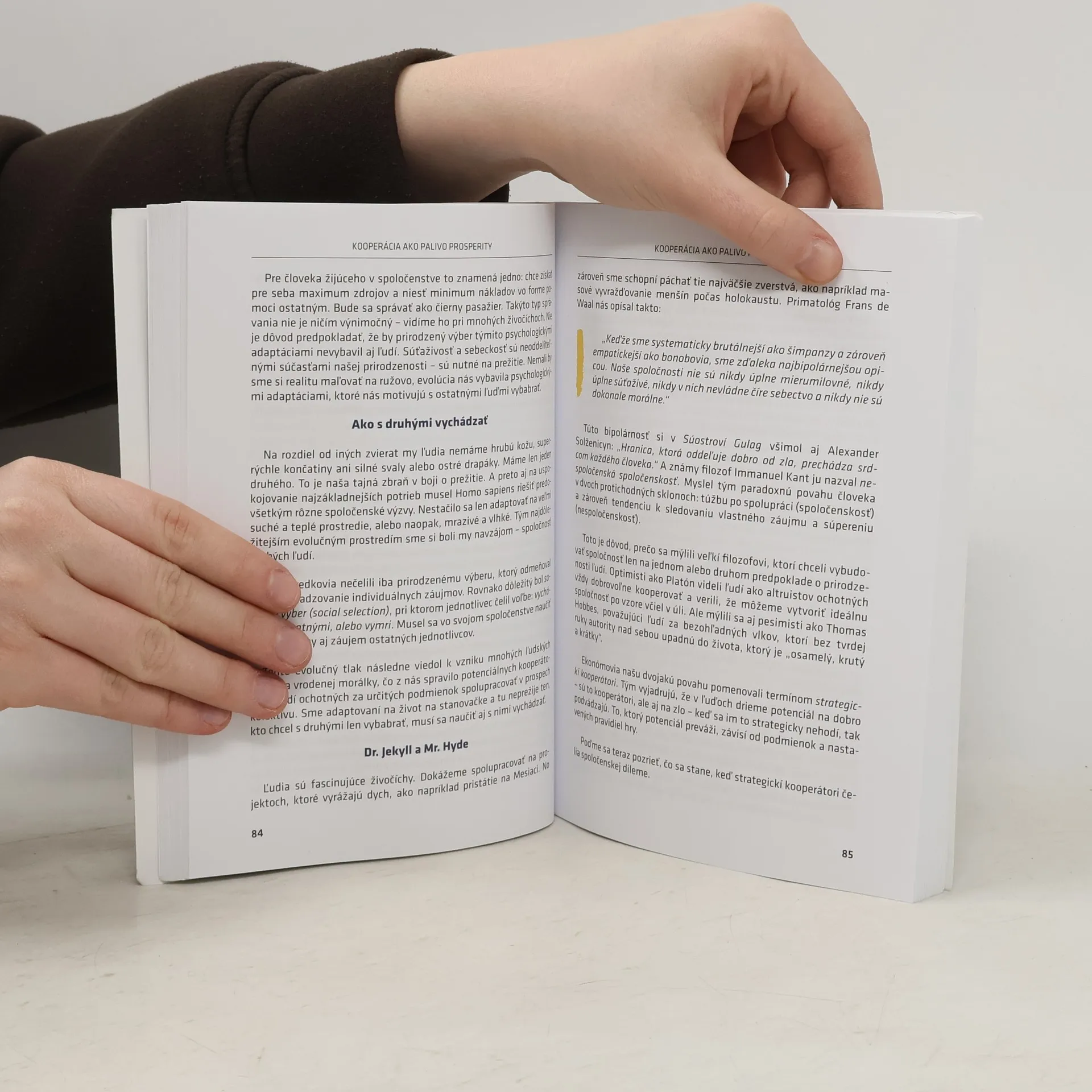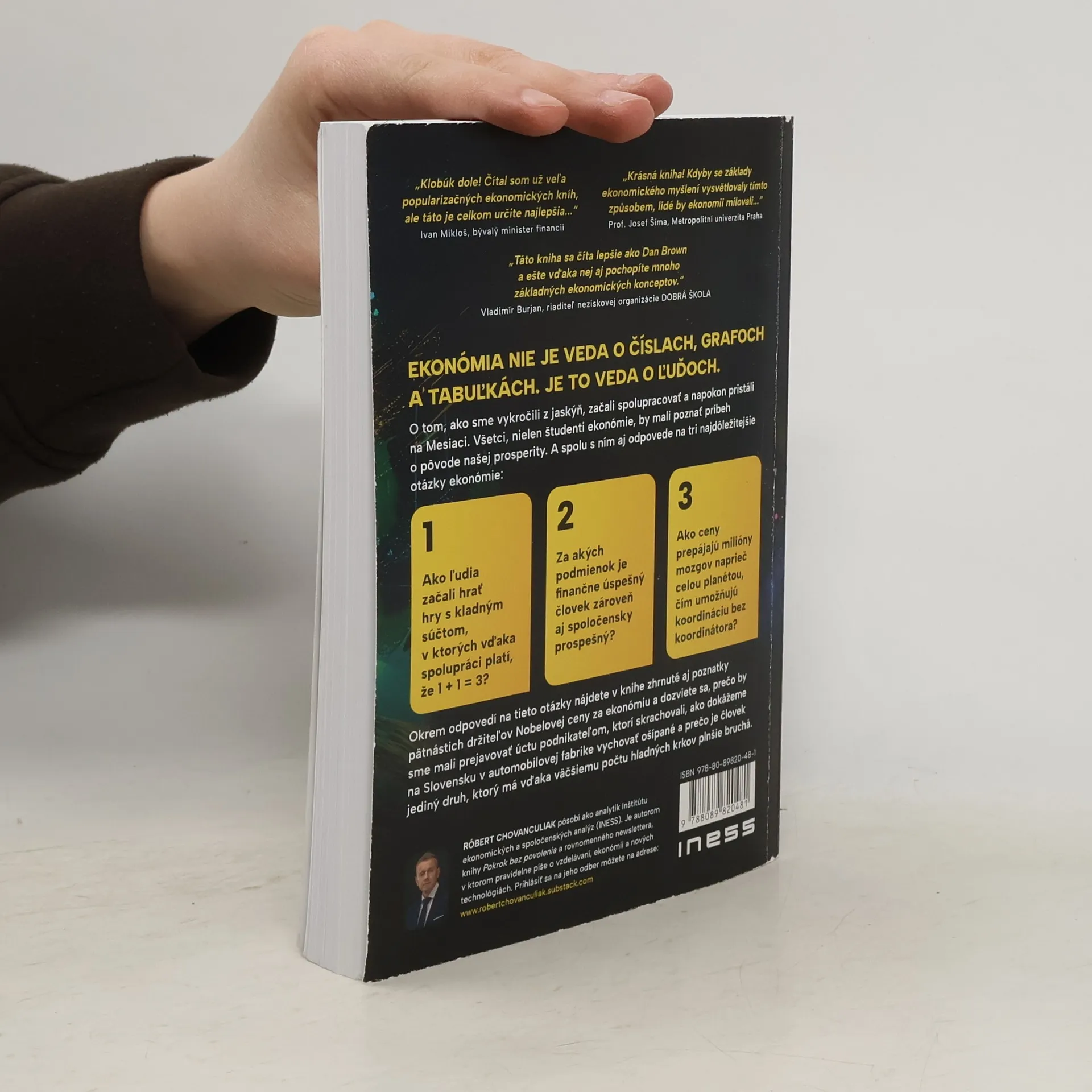 Ekonómia nie je veda o číslach, grafoch a tabuľkách. Je to veda o ľuďoch. O tom, ako sme vykročili z jaskýň, začali spolupracovať a napokon pristáli na Mesiaci. Všetci, nielen študenti ekonómie, by mali poznať príbeh o pôvode našej prosperity. A spolu s ním aj odpovede na tri najdôležitejšie otázky ekonómie: Ako ľudia začali hrať hry s kladným súčtom, v ktorých vďaka spolupráci platí, že 1 + 1 = 3? Za akých podmienok je finančne úspešný človek zároveň aj spoločensky prospešný? A ako ceny prepájajú milióny mozgov naprieč celou planétou, čím umožňujú koordináciu bez koordinátora? Okrem odpovedí na tieto otázky nájdete v knihe zhrnuté aj poznatky pätnástich držiteľov Nobelovej ceny za ekonómiu a dozviete sa: Prečo by sme mali prejavovať úctu podnikateľom, ktorí skrachovali? Ako dokážeme na Slovensku v automobilovej fabrike vychovať ošípané? Prečo je človek jediný druh, ktorý má vďaka väčšiemu počtu hladných krkov plnšie bruchá? Ktorý ekonóm zachránil Rakúsko pred socializmom – a mohol zachrániť aj Slovensko? Čo majú spoločné ekonómovia a netopiere? Ako je možné, že nikto na svete nevie vyrobiť ceruzku? Aký je rozdiel medzi ekonómiou atómov a ekonómiou bitov?