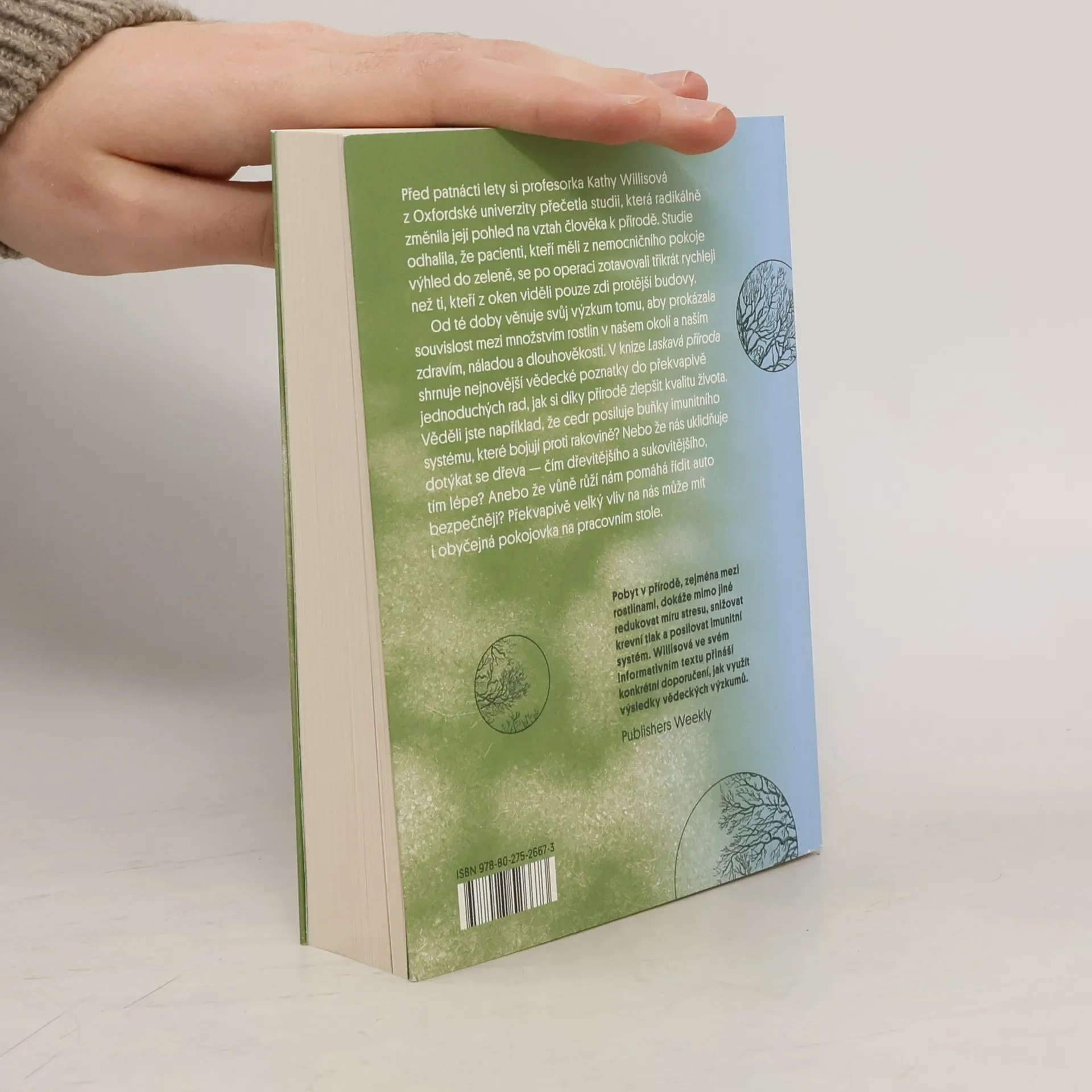 Před patnácti lety si profesorka Kathy Willisová z Oxfordské univerzity přečetla studii, která radikálně změnila její pohled na vztah člověka k přírodě. Studie odhalila, že pacienti, kteří měli z nemocničního pokoje výhled do zeleně, se po operaci zotavovali třikrát rychleji než ti, kteří z oken viděli pouze zdi protější budovy. Od té doby věnuje svůj výzkum tomu, aby prokázala souvislost mezi množstvím rostlin v našem okolí a naším zdravím, náladou a dlouhověkostí. V knize Laskavá příroda shrnuje nejnovější vědecké poznatky do překvapivě jednoduchých rad, jak si díky přírodě zlepšit kvalitu života. Věděli jste například, že cedr posiluje buňky imunitního systému, které bojují proti rakovině? Nebo že nás uklidňuje dotýkat se dřeva — čím dřevitějšího a sukovitějšího, tím lépe? Anebo že vůně růží nám pomáhá řídit auto bezpečněji? Překvapivě velký vliv na nás může mít i obyčejná pokojovka na pracovním stole.