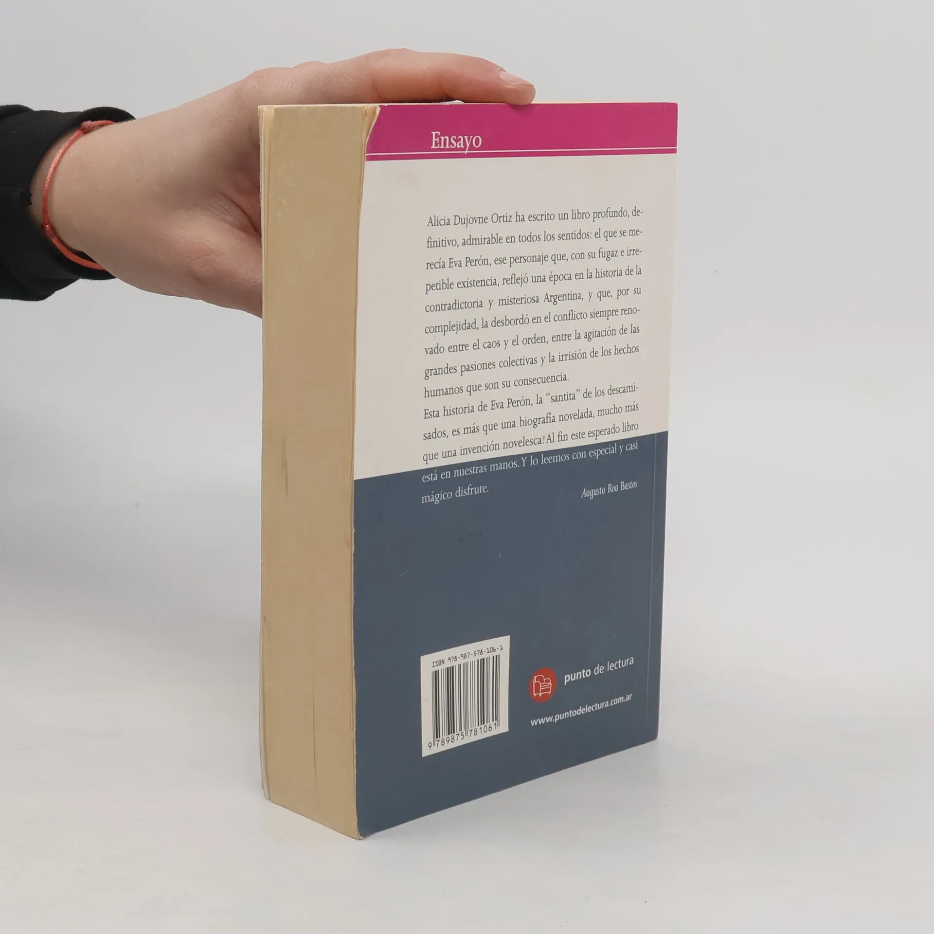 "Alicia Dujovne Ortiz ha escrito un libro profundo, definitivo, admirable en todos los sentidos: el que se merecía Eva Perón, ese personaje que, con su fugaz e irrepetible existencia, reflejó una época en la historia de la contradictoria y misteriosa Argentina, y que, por su complejidad, la desbordó en el conflicto siempre renovado entre el caos y el orden, entre la agitación de las grandes pasiones colectivas y la irrisión de los hechos humanos que son su consecuencia. Esta historia de Eva Perón, la "santita" de los descamisados, es más que una biografía novelada, mucho más que una invención novelesca. Al fin este esperado libro está en nuestras manos. Y lo leemos con especial y casi mágico disfrute". Augusto Roa Bastos (de la contratapa).