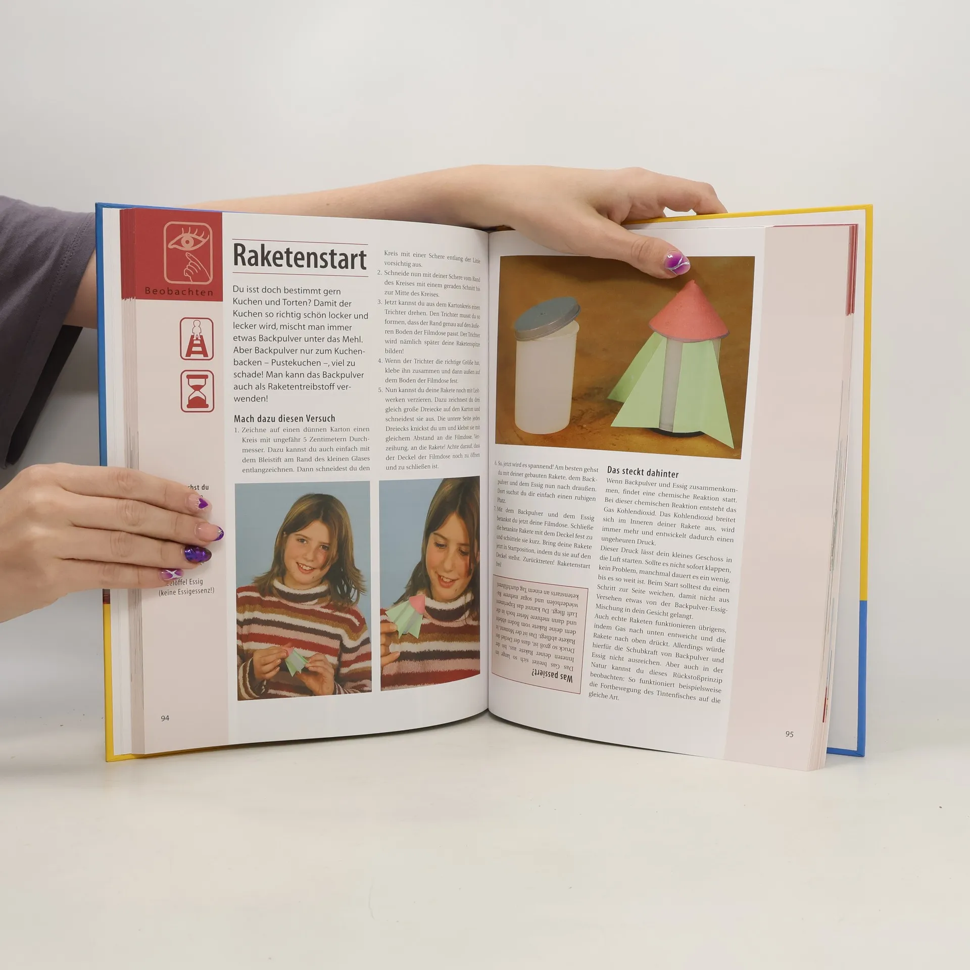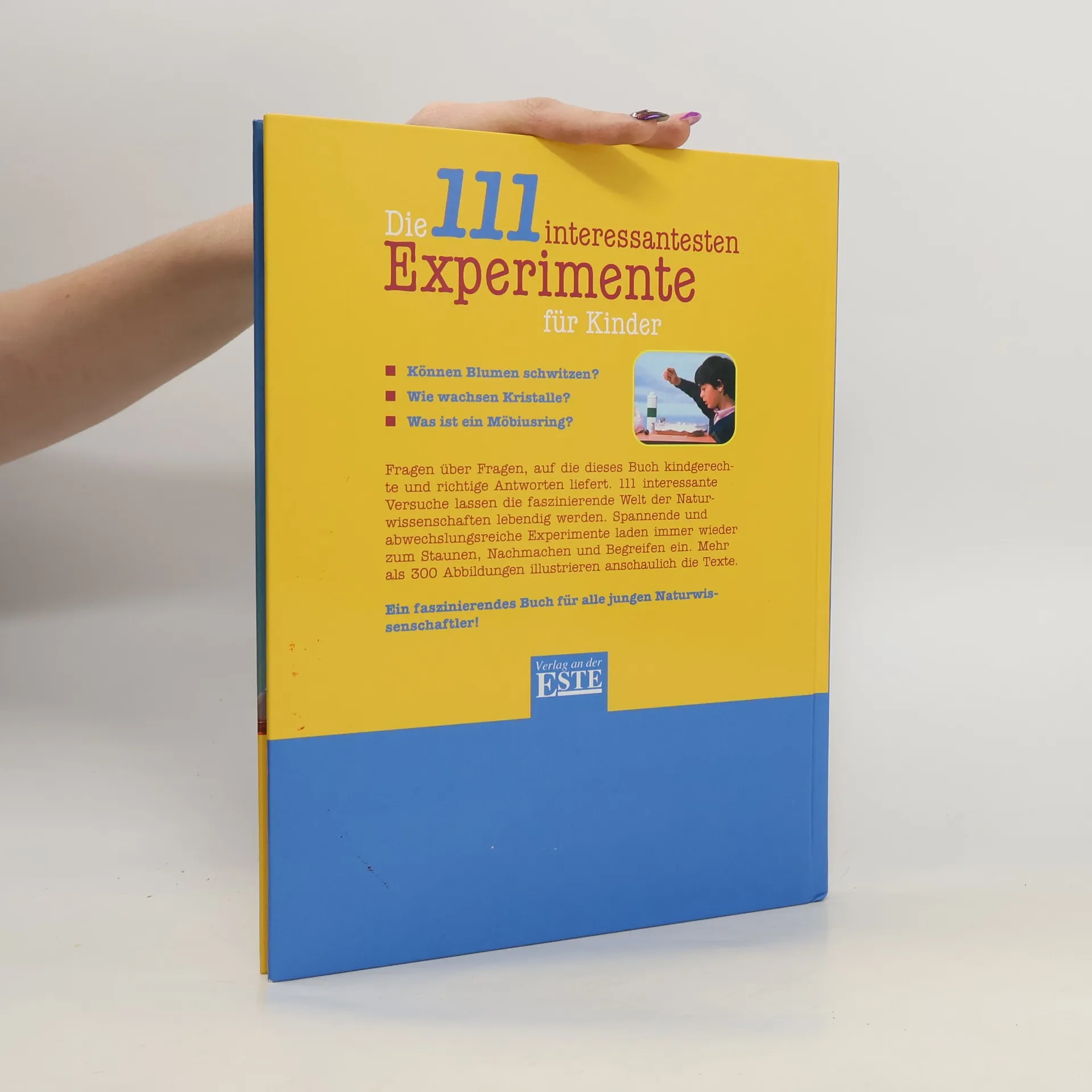 111 spannende und ungefährliche Experimente aus den Bereichen Physik, Chemie und Technik regen zum Staunen und Lernen an. Die Experimente sind dem Alltag entnommen und nach Hören, Riechen, Schmecken, Fühlen, Tasten und Beobachten gegliedert. Symbole zeigen den Schwierigkeitsgrad sowie die benötigte Zeit der Durchführung. Mit wissenschaftlichern Hintergrundinformationen.