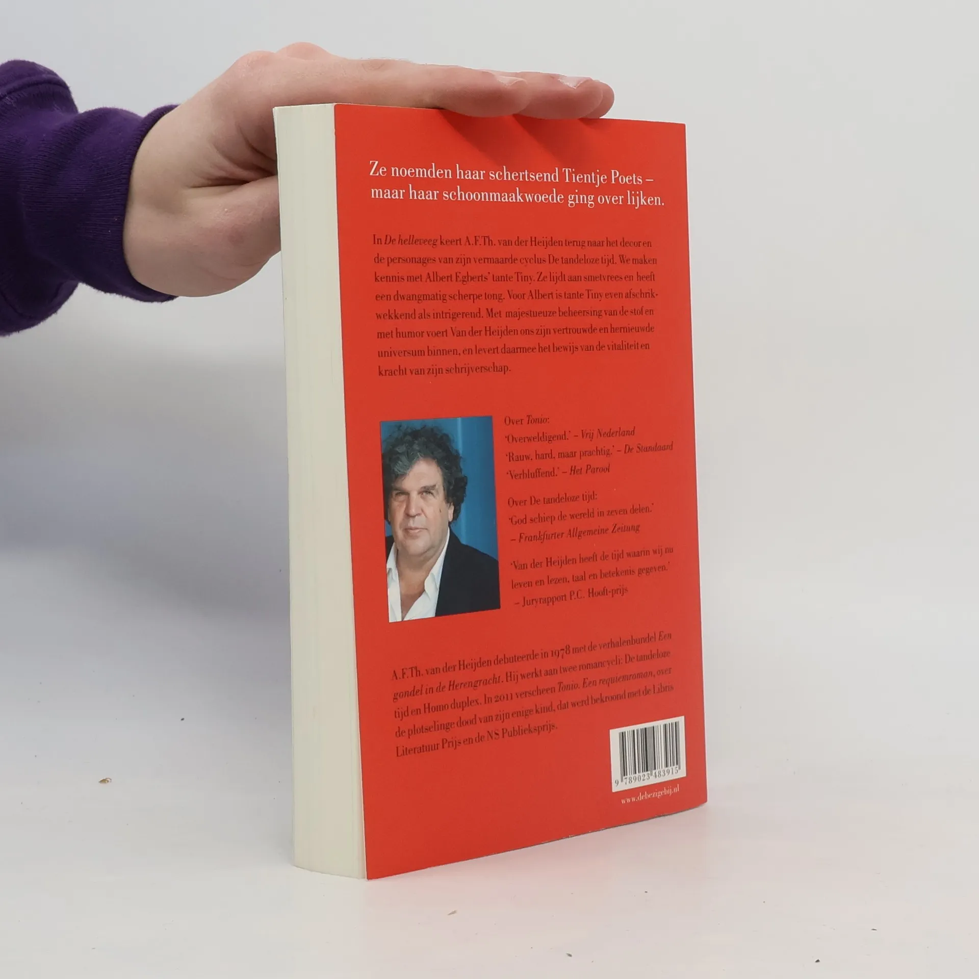 In De helleveeg keert A.F.Th. van der Heijden terug naar het decor en de personages van zijn vermaarde cyclus De tandeloze tijd. We maken kennis met Albert Egberts’ tante Tiny, die behalve met smetvrees ook behept is met een dwangmatig scherpe tong. Voor Albert is tante Tiny, schertsend Tientje Poets genoemd, even afschrikwekkend als intrigerend. Eenmaal zelf vader geworden stuurt Albert aan op een grote confrontatie, waarbij eindelijk alle familiegeheimen aan het licht komen. Met zijn majestueuze beheersing van de stof voert Van der Heijden ons zijn vertrouwde, levendige universum binnen. De helleveeg is een even geestige als schrijnende roman. Van der Heijden levert opnieuw het bewijs van de vitaliteit en kracht van zijn schrijverschap.