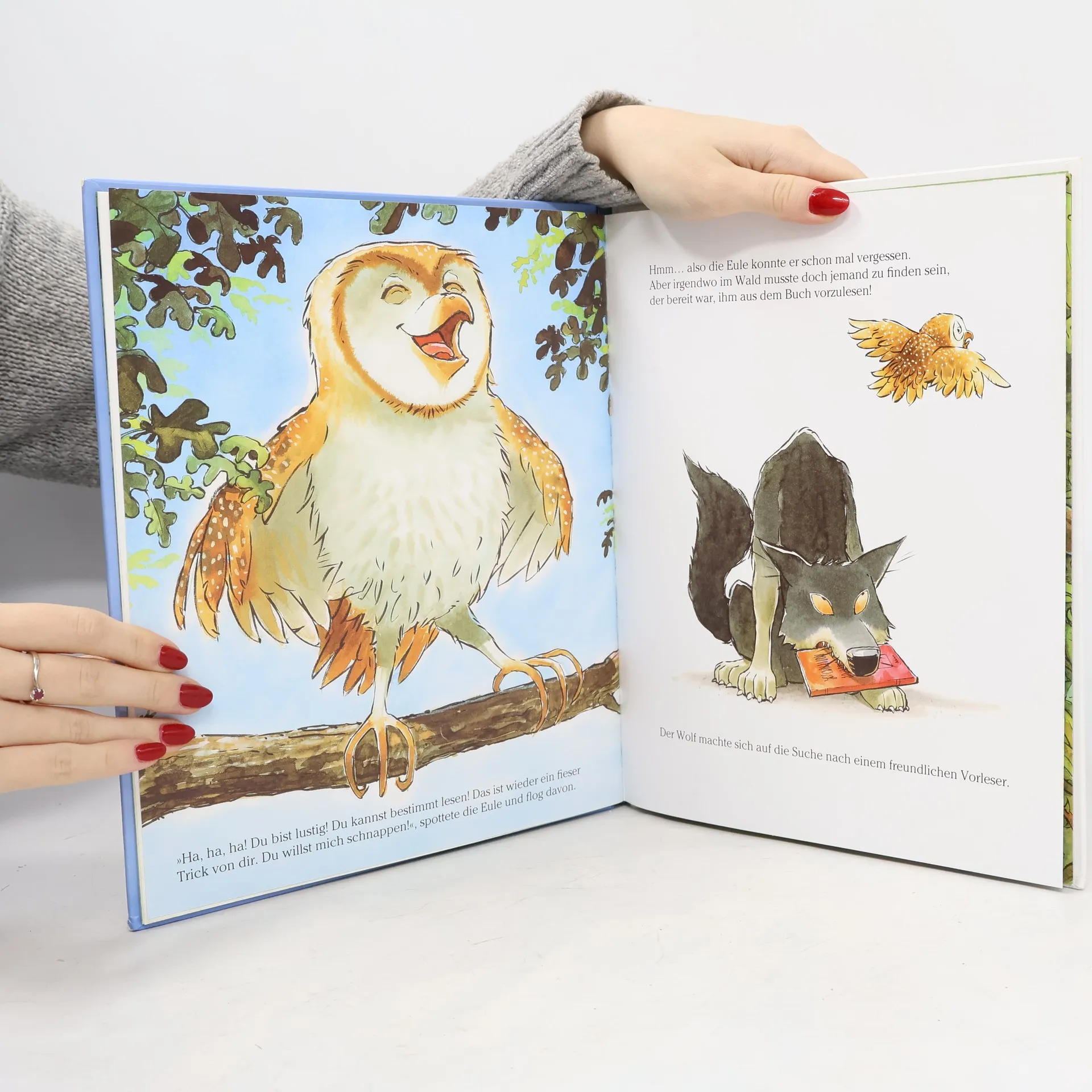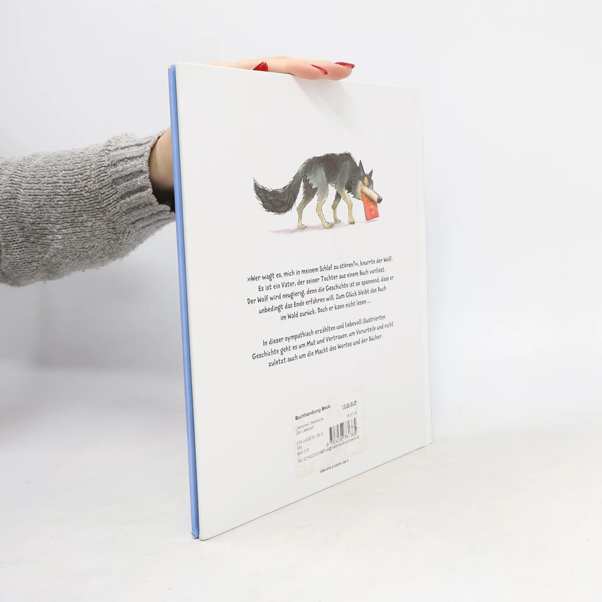'Wer wagt es, mich in meinem Schlaf zu stören?' grummelt der Wolf. Es ist ein Vater, der auf einer schattigen Bank unter dem Baum sitzt und seiner Tochter aus einem Buch vorliest. Der Wolf wird neugierig, denn die Geschichte ist so spannend, dass er unbedingt das Ende erfahren will. Aber er hat Pech und Glück zugleich, denn der Vater geht mit seiner Tochter nach Hause, bevor er die Geschichte fertig gelesen. Zum großen Glück für den Wolf ist ihm aber das Buch aus der Tasche gefallen. Jetzt muss der Wolf nur noch jemanden finden, der ihm aus dem Buch vorlesen kann, denn er selber kann leider nicht lesen. Er fragt alle Tiere im Wald, aber sie fürchten sich vor ihm. Alle, außer einem kleinen aber mutigen Hasen, der ihm vorliest und eine Erfahrung macht. In dieser sympathisch erzählten und liebevoll illustrierten Geschichte geht es um Mut und Vertrauen, um Vorurteile und nicht zuletzt auch um die Macht des Wortes und der Bücher. Es spielt mit der Erwartungshaltung des Lesers und hinterfragt das Stereotyp des 'bösen Wolfs'. Während der ganzen Geschichte fragt man sich, ob der Wolf wirklich ein enthusiastischer Leser ist oder bloß so tut.