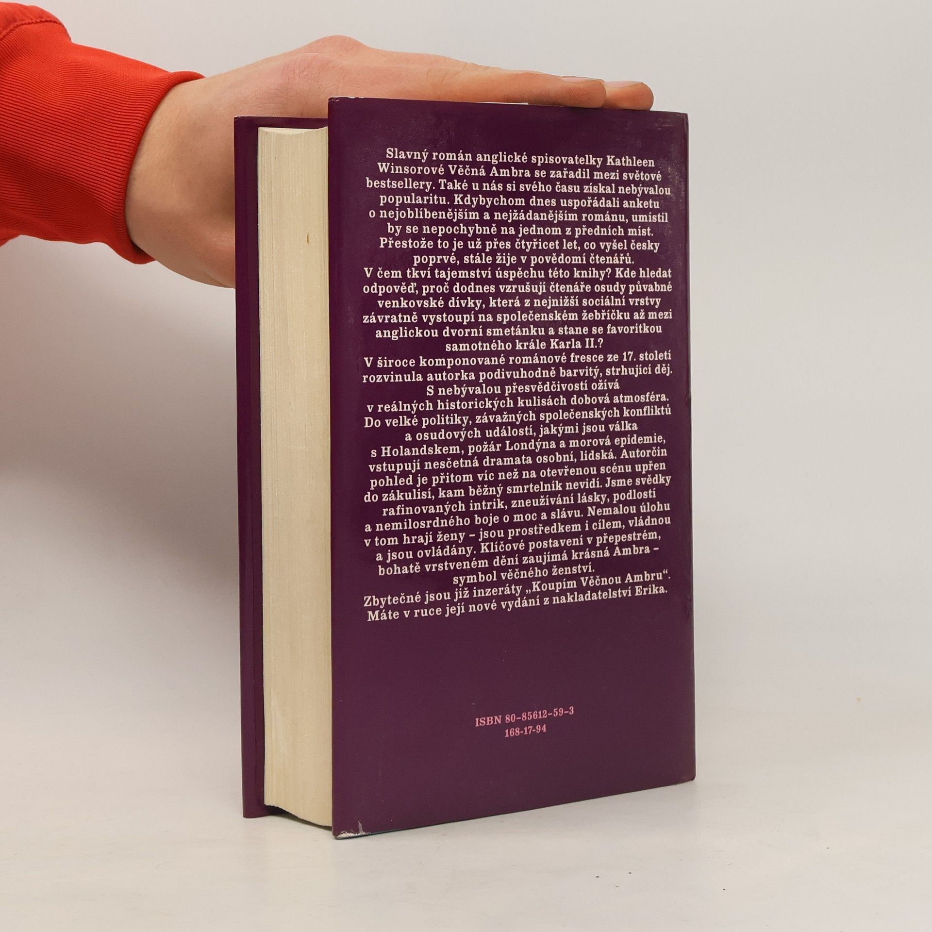 Slavný román anglické spisovatelky Kathleen Winsorové Věčná Ambra se zařadil mezi světové bestsellery. Také u nás si svého času získla nebývalou popularitu. Kdybychom dnes uspořádali anketu o nejoblíbenějším a nejžádanějším románu, umístil by se nepochybně na jednom z předních míst. Přestože to je už přes čtyřicet let, co vyšel česky poprvé, stále žije v povědomí čtenářů. V čem tkví tajemství úspěchu této knihy? Kde hledat odpověď, proč dodnes vzrušují čtenáře osudy půvabné venkovské dívky, která z nejnižší sociální vrstvy závratně vystoupí na společenském žebříčku až mezi anglickou dvorní smetánku a stane se favoritkou samotného Karla II.? V široce komponované románové fresce ze 17. století rozvinula autorka podivuhodné barvitý, strhující děj. S nebývalou přesvědčivostí ožívá v reálných historických kulisách dobová atmosféra. Do velké politiky, závažných společenských kofliktů a osudových událostí, jakými jsou válka s Holandskem, požár Londýna a morová epidemie, vstupují nesčetná dramata osobní, lidská. Autorčin pohled je přitom víc než na otevřenou scénu upřen do zákulisí, kam běžný smrtelník nevidí. Jsme svědky rafinovaných intrik, zneužívání lásky, podlostí a nemilosrdného boje o moc a slávu. Nemalou úlohu v tom hrají ženy - jsou prostředkem i cílem, vládnou a jsou ovládány. Klíčové postavení v přepestrém, bohatě vrstveném dění zaujímá krásná Ambra - symbol věčného žesntví.