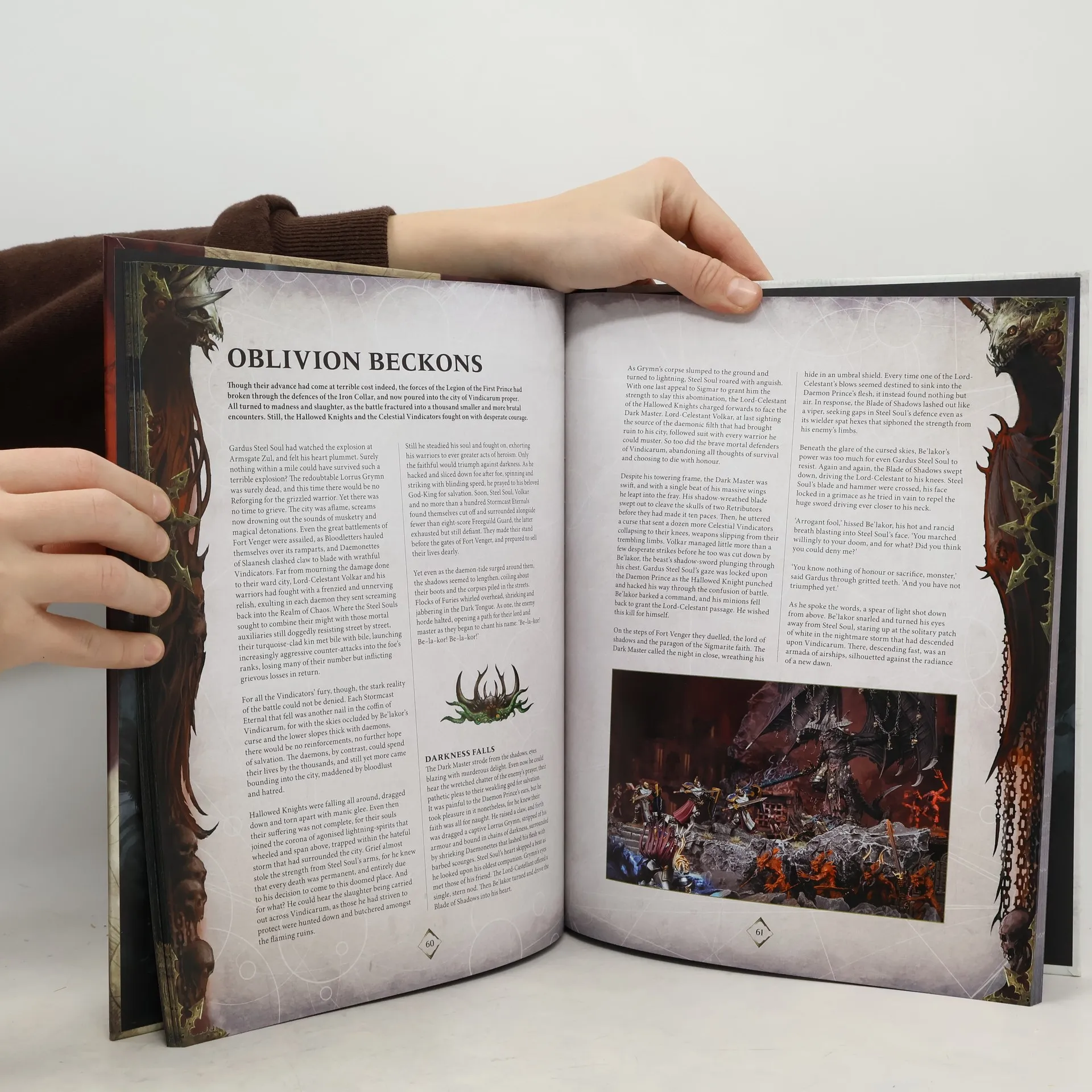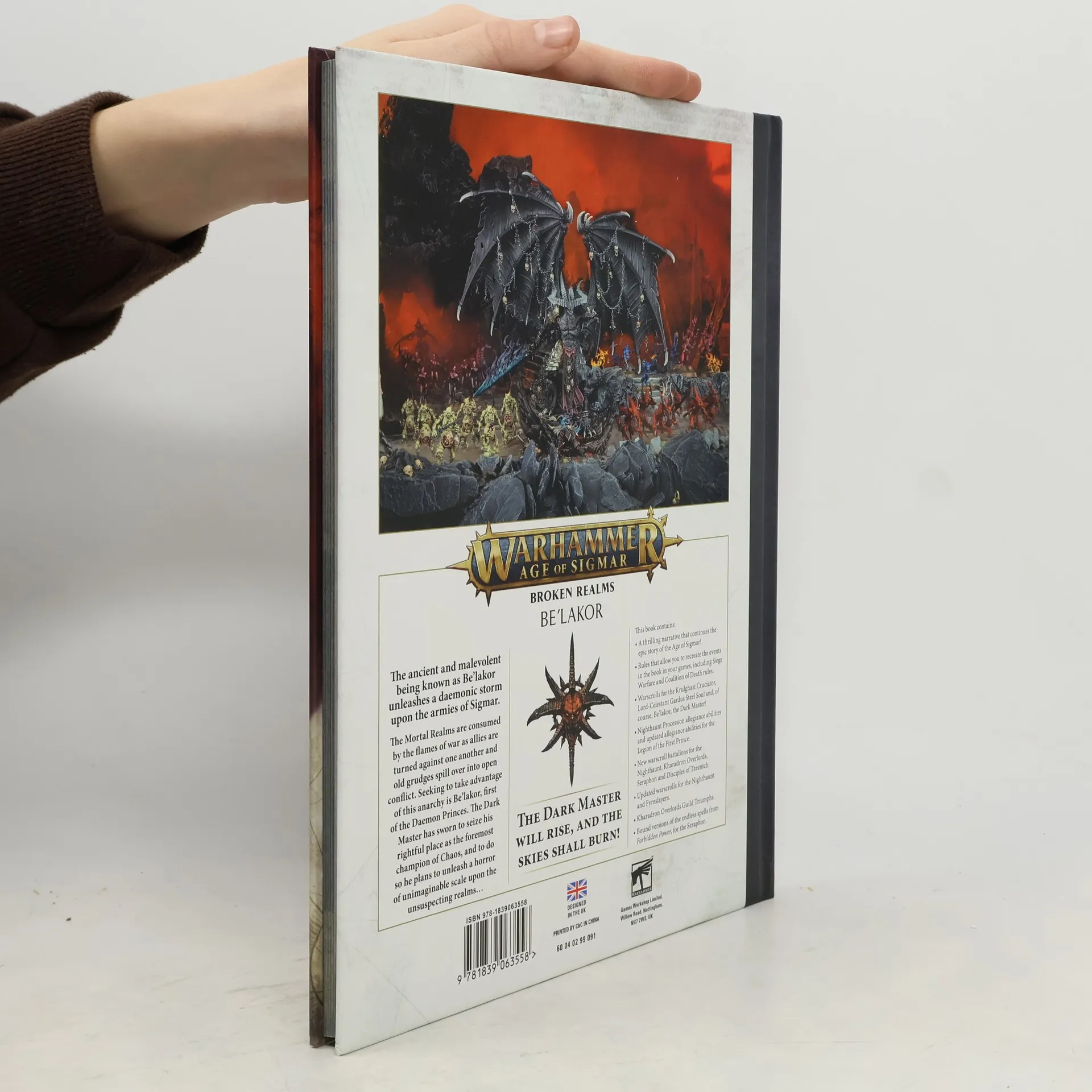 While the Mortal Realms rage under the fires of countless wars, one scorned figure looks to take advantage and further his unknowable agenda. Be'lakor, the Dark Master, whose schemes have had their twisted tendrils in many momentous events, begins to enact the final stages of his grand ambition. With the beleaguered Stormcast who followed Morathi into the Eightpoints making their retreat back across the Bloodwind Spoil, and the Seraphon beginning their own assault upon Archaon's realm, what could the first and greatest of the Daemon Princes have in store?The third instalment in the Broken Realms series sees the hidden machinations of Be'lakor come to the fore as the Dark Master begins to take a more direct role in the Mortal Realms' events. The dire consequences will ripple across multiple factions, including an unforeseen alliance between Chaos and Death, the march of the Seraphon's Celestial Stampede, and the introduction of siege warfare to Warhammer Age of Sigmar.Inside this 112-page hardback book, you'll find:- The chilling tale of Be'lakor's grand plan to usurp the Everchosen and take his place as the foremost champion of Chaos- Rules for the Legion of the First Prince, including an expanded warscroll for Be'lakor himself and updated battle traits, spells and artefacts for his Slaves to Darkness warband- Coalition of Death rules allowing you to play team-based games including 3 or more players, who may need to team up temporarily to take out a threatening foe while keeping an eye out for their so-called 'allies'- Six battleplans to help you recreate pivotal moments from the story, as well as Realms of Battle rules to represent the unique locations they were fought in- Rules to tie the battleplans into a narrative campaign depicting Be'lakor's assault upon the Mortal Realms- A bounty of warscrolls, warscroll battalions and unit updates for Kharadron Overlords, Fyreslayers, Stormcast Eternals, Disciples of Tzeentch, Nighthaunt, and Seraphon