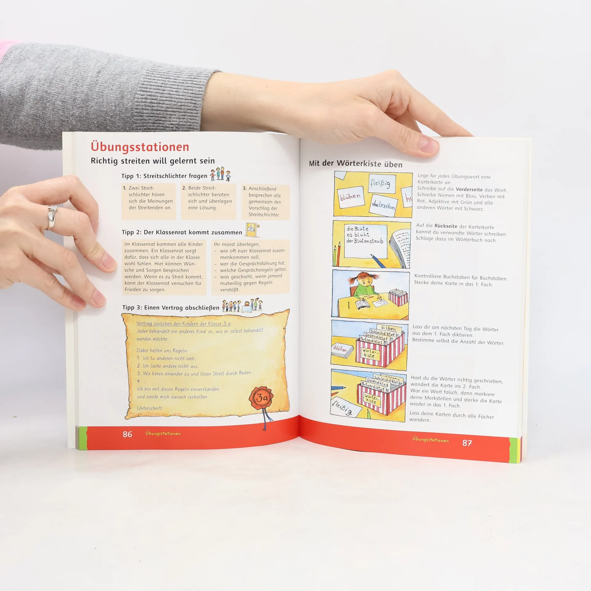 Informationen zum Zweifacher Zugriff auf Themen und Sprachinhalte Integrativer 15 thematische Kapitel Systematischer drei Kurse Thematischer Teil Sachthemen stehen im Vordergrund (wie Schule oder Haustiere). Vier Kapitel haben eine enge Verbindung zum Lesebuch. Jedes Kapitel deckt auf sechs Seiten die Lernfelder des Deutschunterrichts komplett Sprechen Lesen Schreiben/Texte schreiben Sprachbewusstsein entwickeln Rechtschreiben Die Lerninhalte sind klar strukturiert. Wörter des Schreibwortschatzes sind ausgewiesen. Variable Übungsformen und kleine Projekte sprechen die Entdeckerfreude der Kinder an. Die Kurse Die Kurse eröffnen die Möglichkeit, systematische Übungssequenzen einzuschieben und zielen auf das eigenständige Üben. Übungsstationen, beispielsweise methodisch richtiges Abschreiben Richtig Übungen zu grammatischen und rechtschriftlichen Themen Texte schreiben Informationen zur Zweifacher Zugriff auf Themen und Sprachinhalte Integrativer 15 thematische Kapitel Systematischer drei Kurse Thematischer Teil Sachthemen stehen im Vordergrund (wie Schule oder Haustiere). Vier Kapitel haben eine enge Verbindung zum Lesebuch. Jedes Kapitel deckt auf sechs Seiten die Lernfelder des Deutschunterrichts komplett Sprechen Lesen Schreiben/Texte schreiben Sprachbewusstsein entwickeln Rechtschreiben Die Lerninhalte sind klar strukturiert. Wörter des Schreibwortschatzes sind ausgewiesen. Variable Übungsformen und kleine Projekte sprechen die Entdeckerfreude der Kinder an. Die Kurse Die Kurse eröffnen die Möglichkeit, systematische Übungssequenzen einzuschieben und zielen auf das eigenständige Üben.