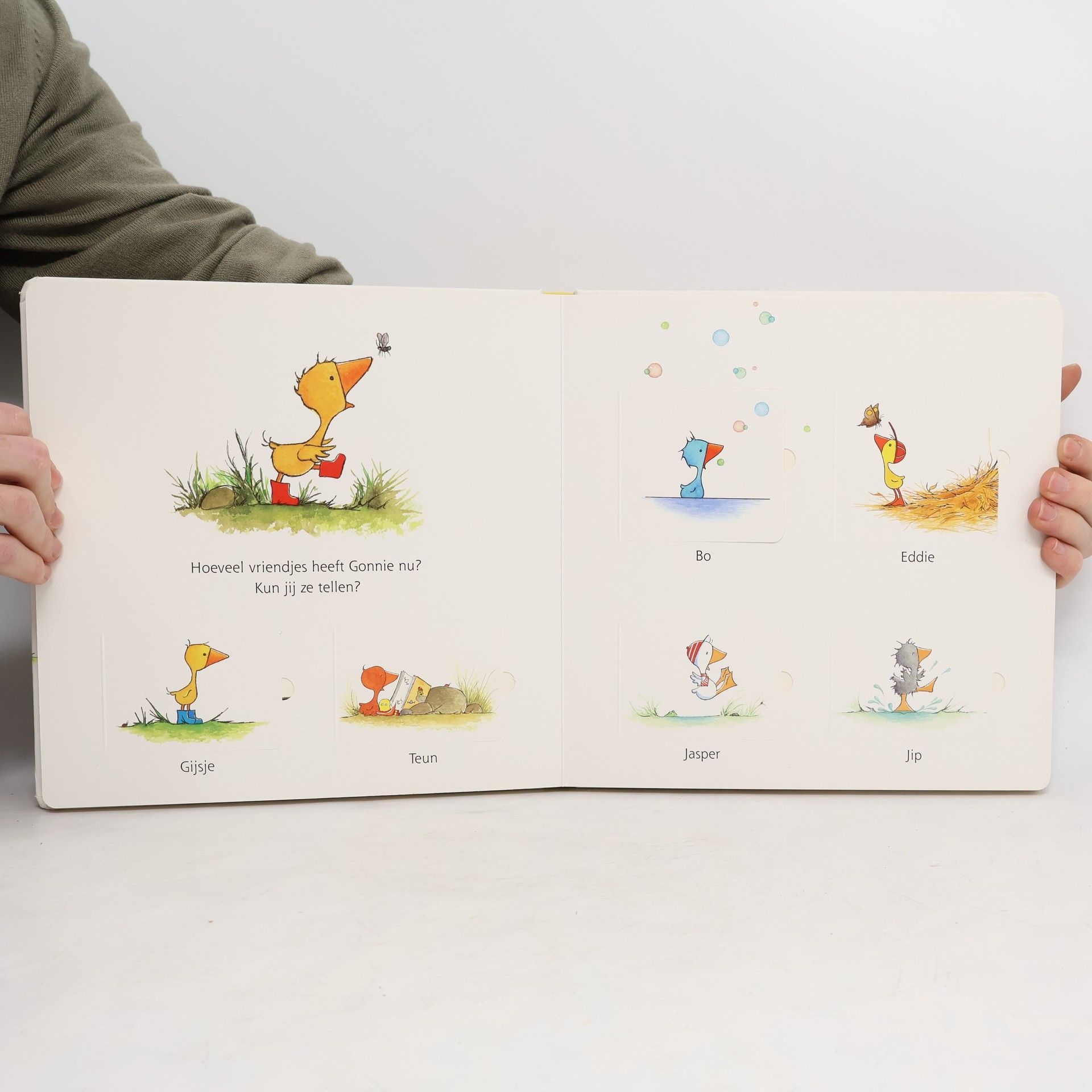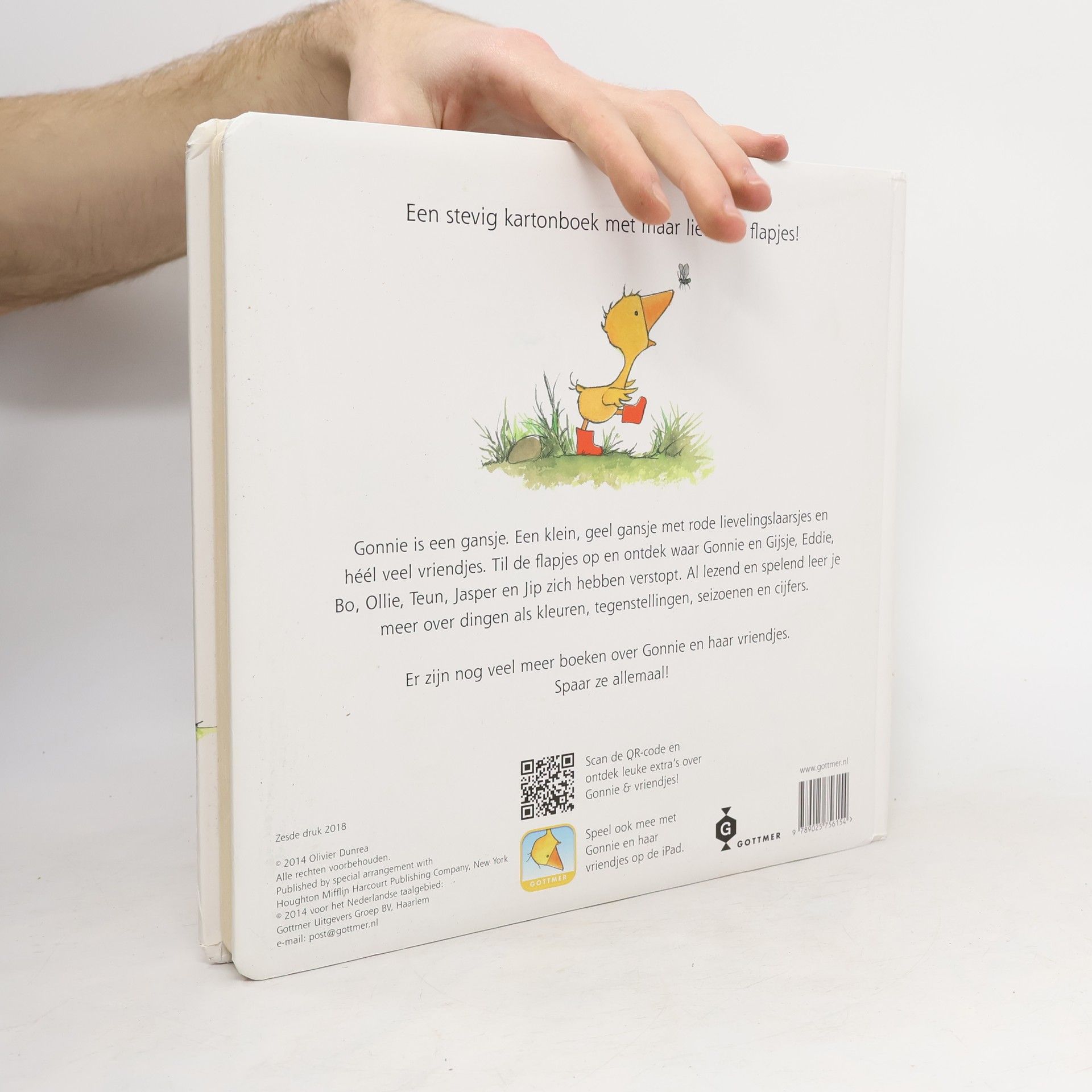 Gansje Gonnie en haar vriendjes laten zien waar ze wonen, wat voor weer het is, wat voor kleur ze zijn en welke dieren ze allemaal kennen. Groot, vierkant kartonnen prentenboek met eenvoudige kleurenillustraties en veel flapjes. Vanaf ca. 1,5 jaar.