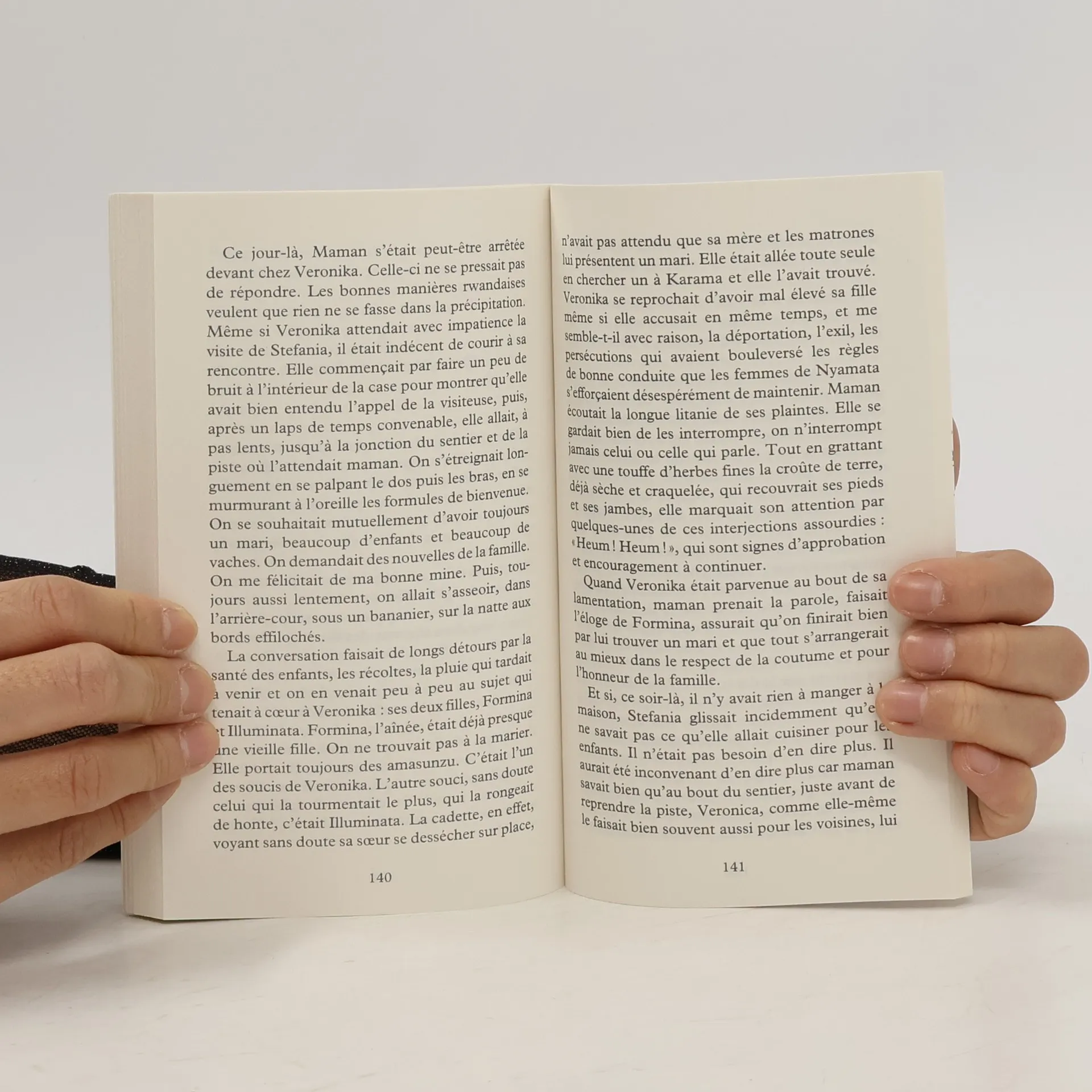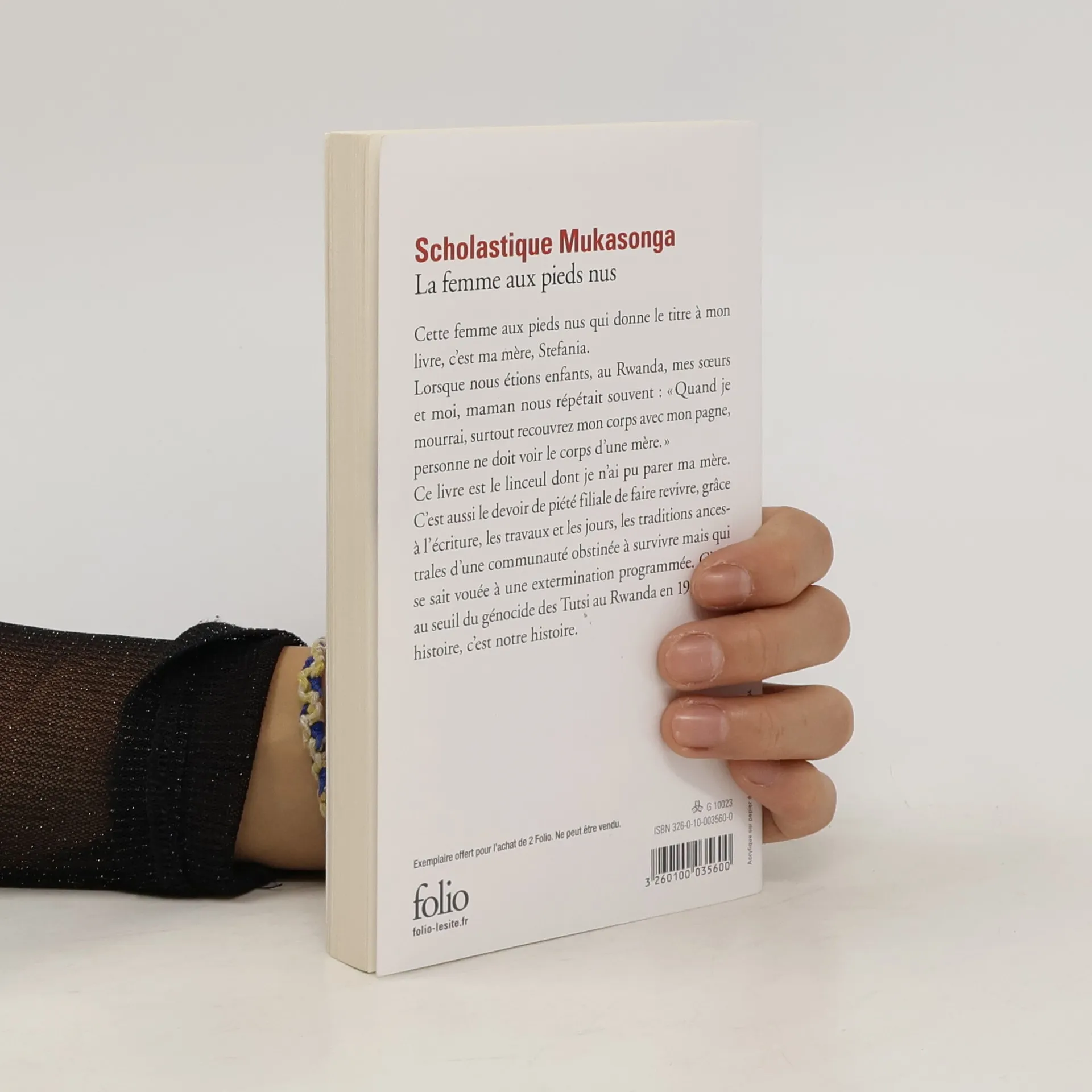 "Cette femme aux pieds nus qui donne le titre à mon livre, c'est ma mère, Stefania. Lorsque nous étions enfants, au Rwanda, mes sœurs et moi, maman nous répétait souvent : "Quand je mourrai, surtout recouvrez mon corps avec mon pagne, personne ne doit voir le corps d'une mère." Ma mère a été assassinée, comme tous les Tutsi de Nyamata, en avril 1994 ; je n'ai pu recouvrir son corps, ses restes ont disparu. Ce livre est le linceul dont je n'ai pu parer ma mère. C'est aussi le bonheur déchirant de la faire revivre, elle qui, jusqu'au bout traquée, voulut nous sauver en déjouant pour nous la sanglante terreur du quotidien. C'est, au seuil de l'horrible génocide, son histoire, c'est notre histoire." Scholastique Mukasonga.