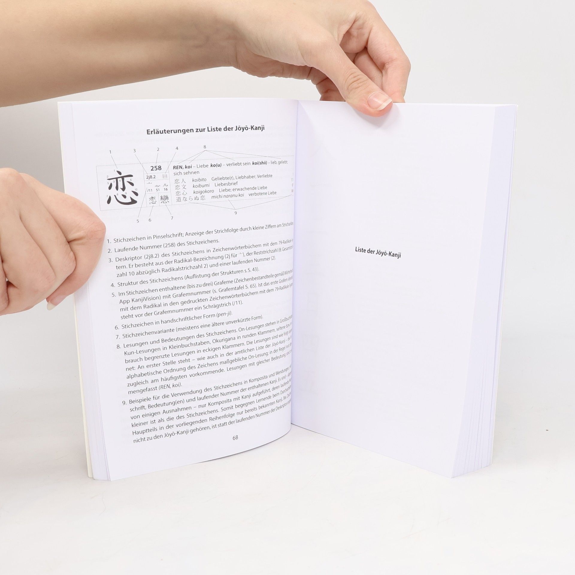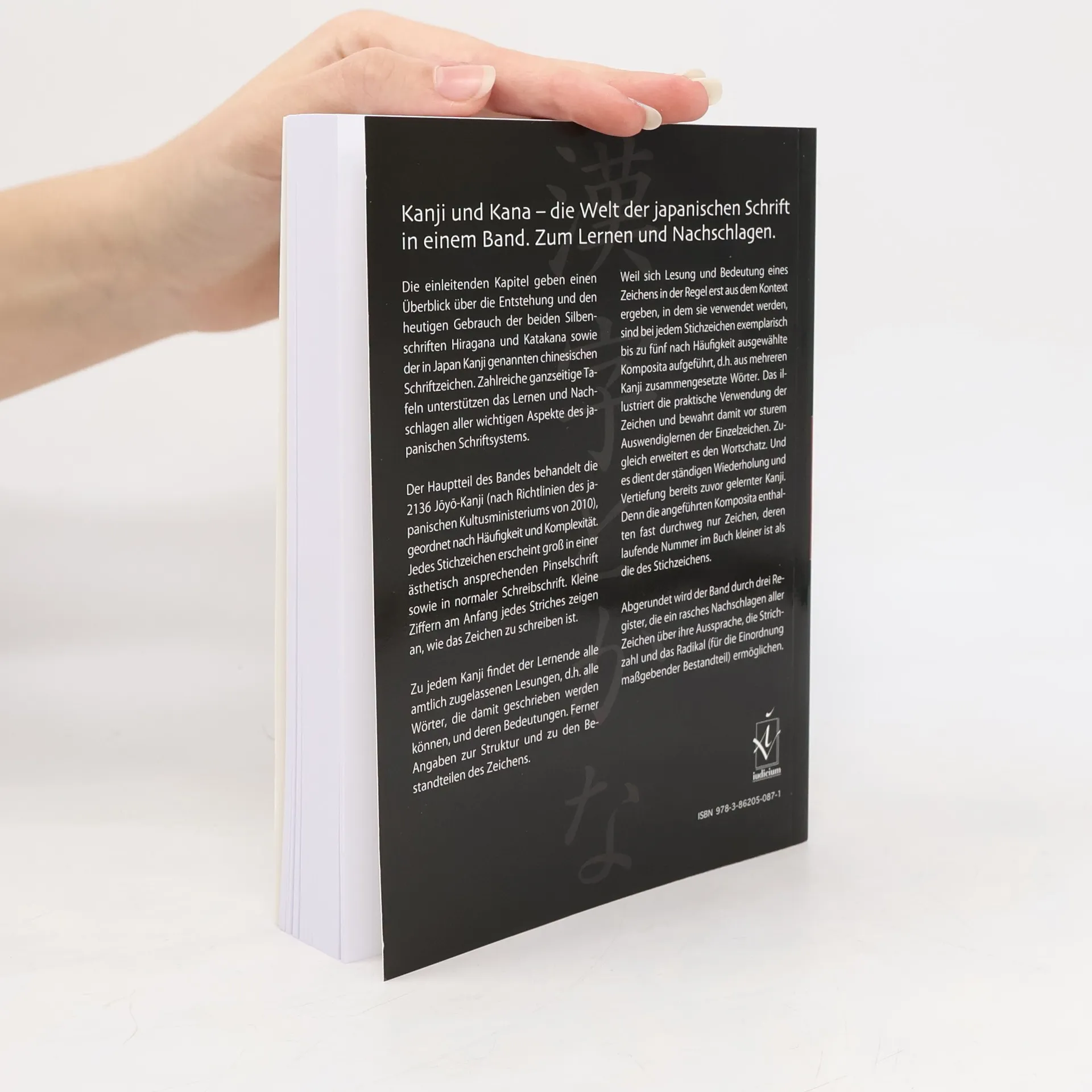 Die einleitenden Kapitel bieten einen Überblick über die Entstehung und den heutigen Gebrauch der Silbenschriften Hiragana und Katakana sowie der in Japan verwendeten Kanji. Zahlreiche Tafeln unterstützen das Lernen und Nachschlagen der wesentlichen Aspekte des japanischen Schriftsystems. Der Hauptteil behandelt die 2136 Joyo-Kanji, geordnet nach Häufigkeit und Komplexität, gemäß den Richtlinien des japanischen Kultusministeriums von 2010. Jedes Kanji wird in ästhetischer Pinselschrift und normaler Schreibschrift dargestellt. Kleine Ziffern am Anfang jedes Strichs zeigen die Schreibweise an. Zu jedem Kanji sind alle amtlich zugelassenen Lesungen, die damit geschrieben werden können, sowie deren Bedeutungen aufgeführt. Zudem gibt es Informationen zur Struktur und zu den Bestandteilen des Zeichens. Um den Kontext der Lesung und Bedeutung zu verdeutlichen, sind exemplarisch bis zu fünf häufige Komposita aufgeführt, die die praktische Verwendung der Zeichen illustrieren und das sture Auswendiglernen vermeiden. Dies erweitert den Wortschatz und fördert die Wiederholung bereits gelernter Kanji. Die Komposita enthalten vorwiegend Zeichen, deren laufende Nummer im Buch kleiner ist als die des Stichzeichens. Abgerundet wird der Band durch drei Register, die ein schnelles Nachschlagen über Aussprache, Strichzahl und Radikal ermöglichen.