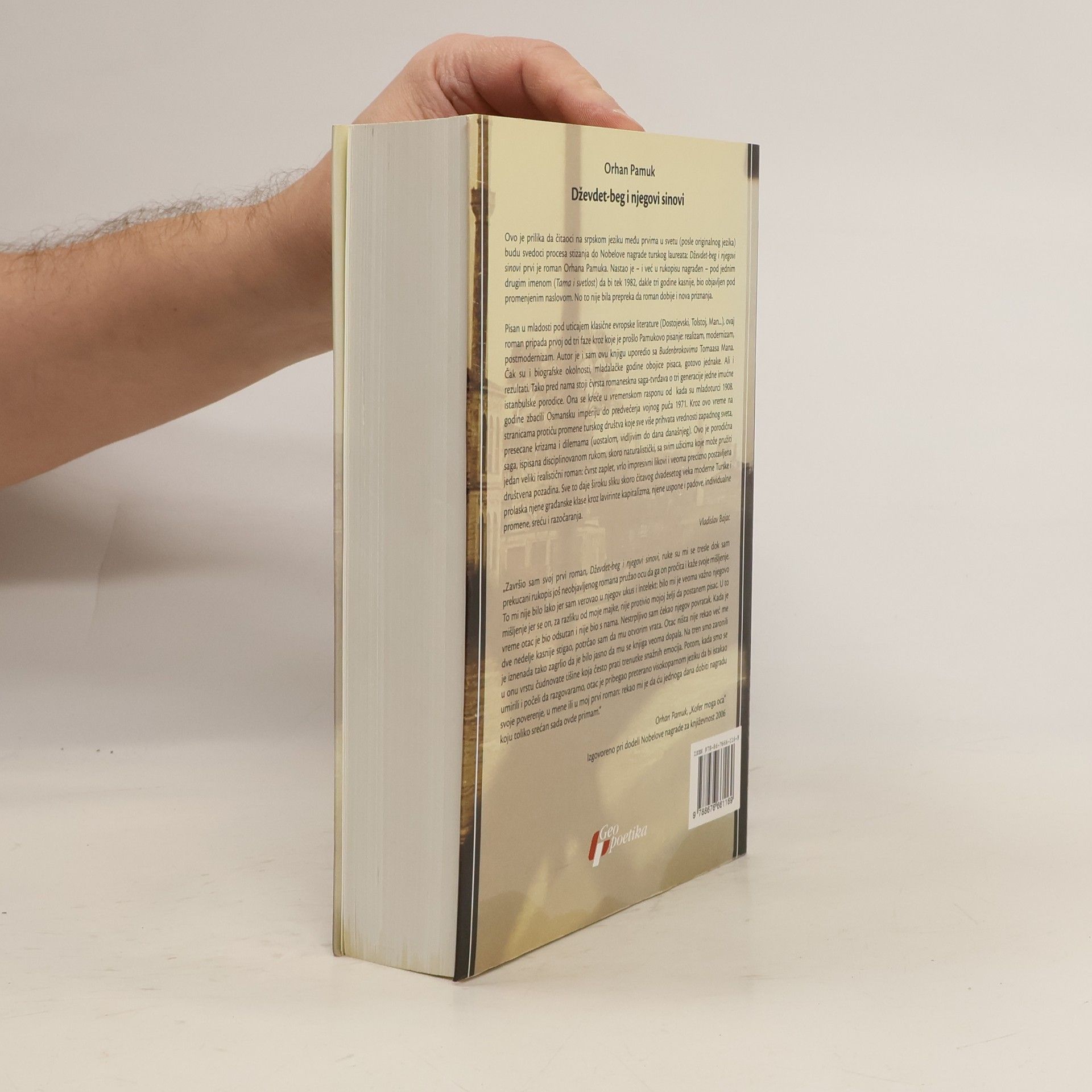 Ovo je prilika da čitaoci na srpskom jeziku među prvima u svetu (posle originalnog jezika) budu svedoci procesa stizanja do Nobelove nagrade turskog laureata: Dževdet-beg i njegovi sinovi prvi je roman Orhana Pamuka. Nastao je - i već u rukopisu nagrađen - pod jednim drugim imenom ( Tama i svetlost ) da bi tek 1982, dakle tri godine kasnije, bio objavljen pod promenjenim naslovom. No to nije bila prepreka da roman dobije i nova priznanja. Pisan u mladosti pod uticajem klasične evropske literature (Dostojevski, Tolstoj, Man...), ovaj roman pripada prvoj od tri faze kroz koje je prošlo Pamukovo pisanje: realizam, modernizam, postmodernizam. Autor je i sam ovu knjigu uporedio sa Budenbrokovima Tomasa Mana. Čak su i biografske okolnosti, mladalačke godine obojice pisaca, gotovo jednake. Ali i rezultati. Tako pred nama stoji čvrsta romaneskna saga-tvrđava o tri generacije jedne imućne istanbulske porodice. Ona se kreće u vremenskom rasponu od kada su mladoturci 1908. godine zbacili Osmansku imperiju do predvečerja vojnog puča 1971. Kroz ovo vreme na stranicama protiču promene turskog društva koje sve više prihvata vrednosti zapadnog sveta, presecane krizama i dilemama (uostalom, vidljivim do dana današnjeg). Ovo je porodična saga, ispisana disciplinovanom rukom, skoro naturalistički, sa svim užicima koje može pružiti jedan veliki realistični roman: čvrst zaplet, vrlo impresivni likovi i veoma precizno postavljena društvena pozadina. Sve to daje široku sliku skoro čitavog dvadesetog veka moderne Turske i prolaska njene građanske klase kroz lavirinte kapitalizma, njene uspone i padove, individualne promene, sreću i razočaranja. "Završio sam svoj prvi roman, Dževdet-beg i njegovi sinovi , ruke su mi se tresle dok sam prekucani rukopis još neobjavljenog romana pružao ocu da ga on pročita i kaže svoje mišljenje. To mi nije bilo lako, jer sam verovao u njegov ukus i intelekt: bilo mi je veoma važno njegovo mišljenje jer se on, za razliku od moje majke, nije protivio mojoj želji da postanem pisac. U to vreme otac je bio odsutan i nije bio s nama. Nestrpljivo sam čekao njegov povratak. Kada je dve nedelje kasnije stigao, potrčao sam da mu otvorim vrata. Otac ništa nije rekao već me je iznenada tako zagrlio da je bilo jasno da mu se knjiga veoma dopala. Na tren smo zaronili u onu vrstu čudnovate tišine koja često prati trenutke snažnih emocija. Potom, kada smo se umirili i počeli da razgovaramo, otac je pribegao preterano visokoparnom jeziku da bi istakao svoje poverenje u mene ili u moj prvi roman: rekao mi je da ću jednoga dana dobiti nagradu koju toliko srećan sada ovde primam." Orhan Pamuk, Kofer moga oca Izgovoreno pri dodeli Nobelove nagrade za književnost 2006.g.