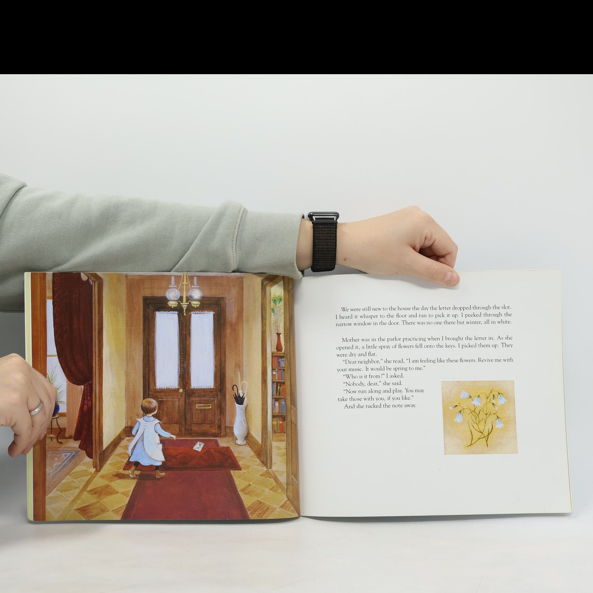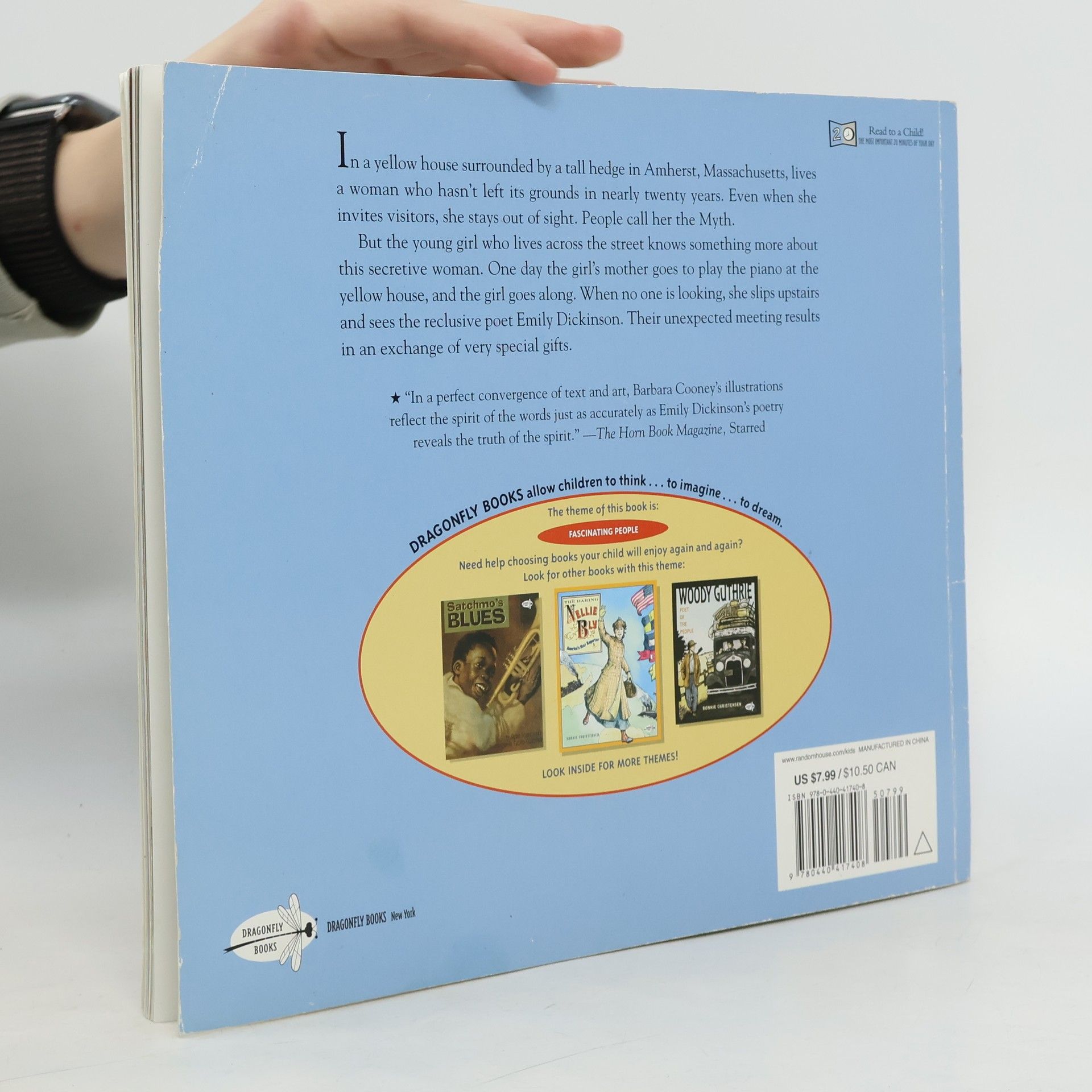 A young girl who lives across the street from the reclusive Emily Dickinson gets her chance to meet the poet when her mother is invited to play the piano for Emily. The girl sneaks up to Emily's room and exchanges a small gift for an authentic poem, which is included in the book.