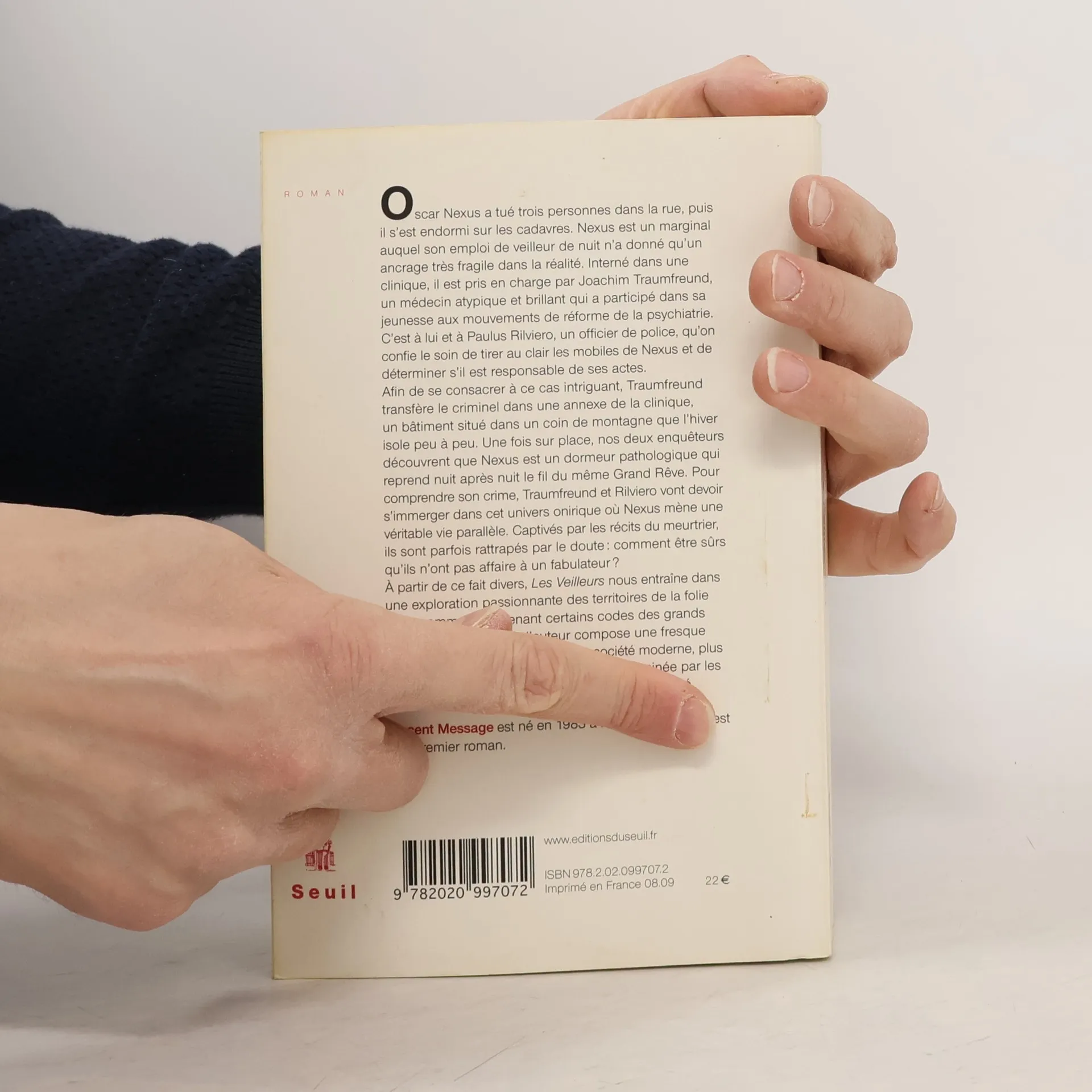 Oscar Nexus a tué trois personnes avant de s'endormir sur leurs cadavres. Marginal, son emploi de veilleur de nuit ne lui a offert qu'un ancrage fragile dans la réalité. Interné dans une clinique, il est pris en charge par Joachim Traumfreund, un médecin brillant et atypique. Avec Paulus Rilviero, un officier de police, ils doivent élucider les mobiles de Nexus et déterminer sa responsabilité. Traumfreund transfère Nexus dans une annexe isolée de la clinique, où l'hiver s'installe peu à peu. Là, ils découvrent que Nexus est un dormeur pathologique, répétant chaque nuit le même Grand Rêve. Pour comprendre son crime, ils doivent plonger dans cet univers onirique où Nexus vit une vie parallèle. En s'immergeant dans les récits du meurtrier, les enquêteurs commencent à douter : comment être sûrs de ne pas avoir affaire à un fabulateur ? À partir de ce fait divers, l'histoire explore les territoires de la folie et du sommeil. S'inspirant des codes des thrillers hollywoodiens, l'auteur dresse un tableau de la place de l'imaginaire dans une société moderne, à la fois rationaliste et fascinée par les mondes virtuels et les aspects nocturnes de la réalité.