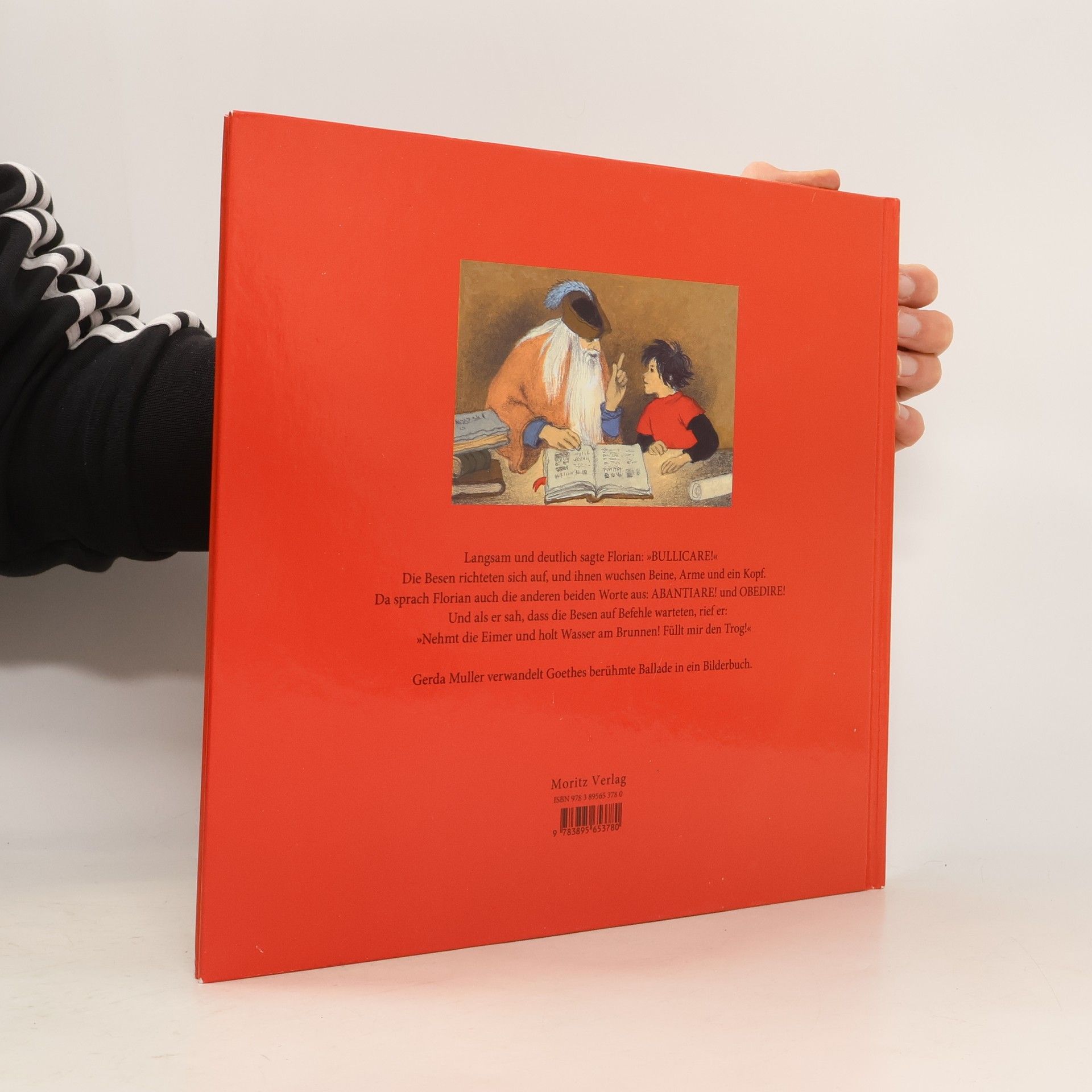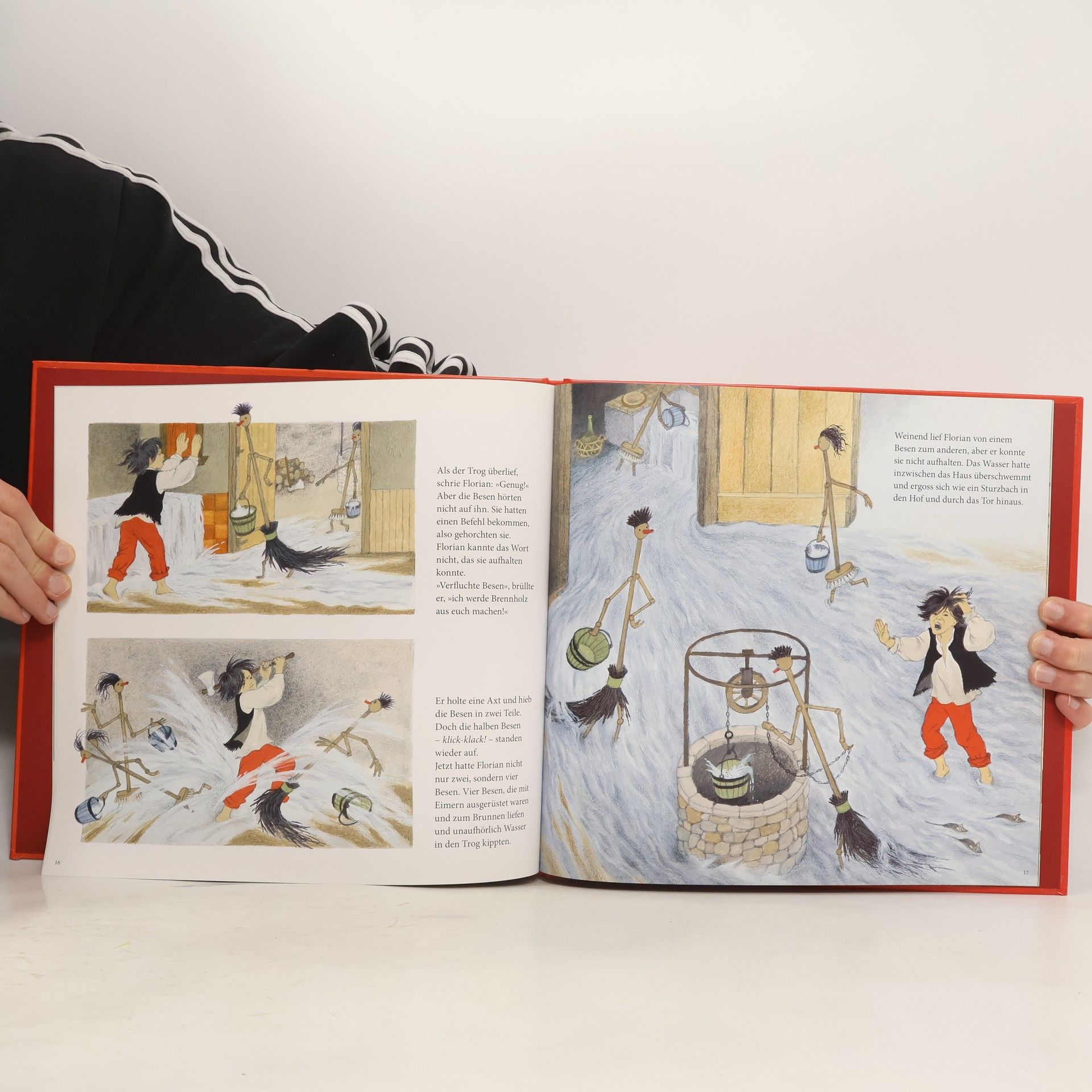 Die Grande Dame der europäischen Illustration erweitert Goethes Gedicht um die Geschichte vom Bauernsohn Florian, der auf der Suche nach einer Lehrstelle Sigiswald, den Zauberer und Wunderheiler, trifft: Du kommst gerade richtig, denn ich brauche jemanden, der mir im Labor hilft. Von Sigiswald lernt er lesen, schreiben und rechnen. Ihm verspricht er auch, keine Zauberformel ohne sein Beisein zu gebrauchen. Doch darüber setzt sich Florian eines Tages hinweg: Den Besen wachsen Beine, Arme und ein Kopf und schon holen sie für ihn das Wasser vom Brunnen. Wunderbar? Nein! Eimer um Eimer schleppen sie heran. Wie kann Florian ihnen jetzt Einhalt gebieten? Er weiß keine Formel dafür! Das Dorf droht im Schlamm zu versinken …