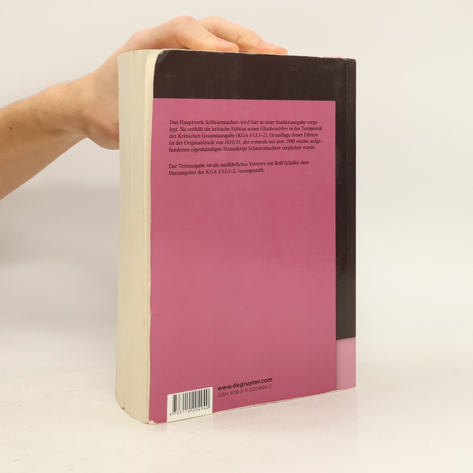 Das Hauptwerk Schleiermachers wird hier in einer Studienausgabe vorgelegt. Sie enthält die kritische Edition seiner Glabenslehre in der Textgestalt der Kritischen Gesamtausgabe (KGA I/13, 1-2). Grundlage dieser Edition ist der Originaldruk von 1830/31, der erstmals mit dem 1980 wieder aufgefundenen eigenhändigen Manuskript Schleiermachers verglichen wurde. --Back cover.
