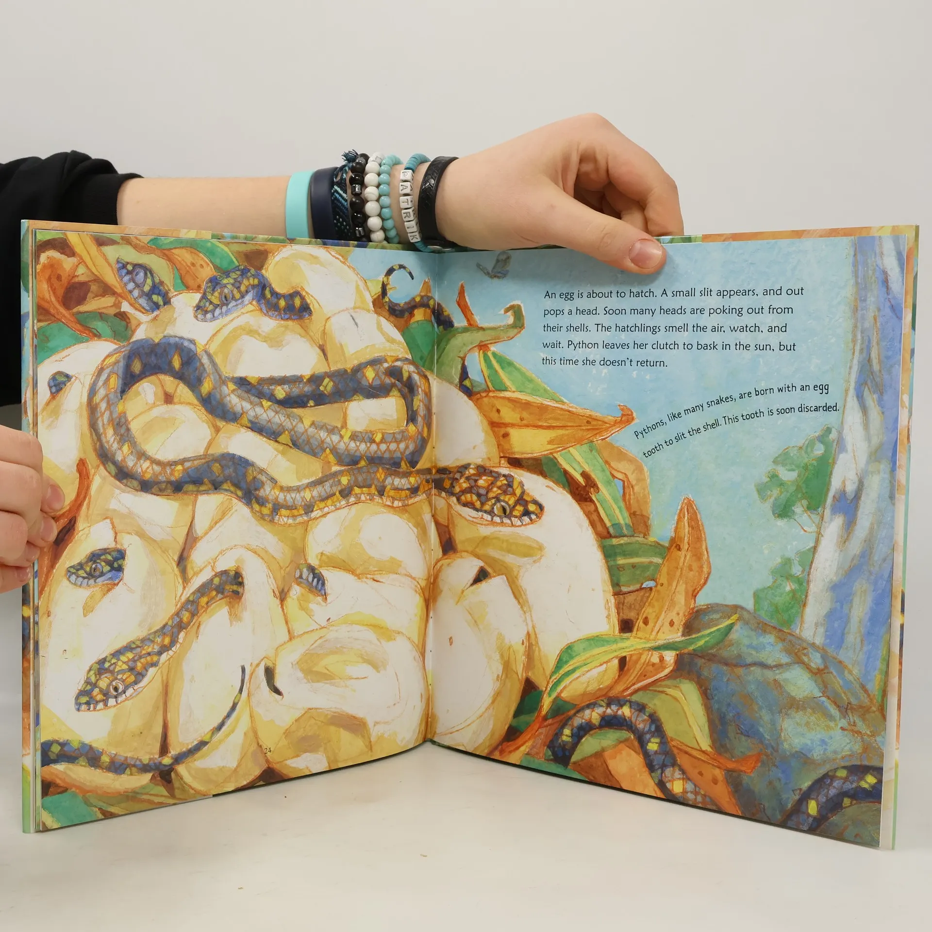 <b>Follow the deadly python as she slithers in search of a meal in this riveting nature story that is not for the faint of heart.</b> Python stirs and slithers out from her shelter, smelling the air with her forked tongue. It’s time to molt her dull scales and reveal the glistening snake underneath. Gliding along a tree, she stops and watches very, very closely as a bird drops onto a branch — and escapes the razor-sharp teeth just in time. But Python is hungry, so she slides on to stalk new prey. Combining informative facts, expressive illustrations, and a lyrical, mesmerizing narrative, here is a book to captivate anyone fascinated by this iconic creature.
