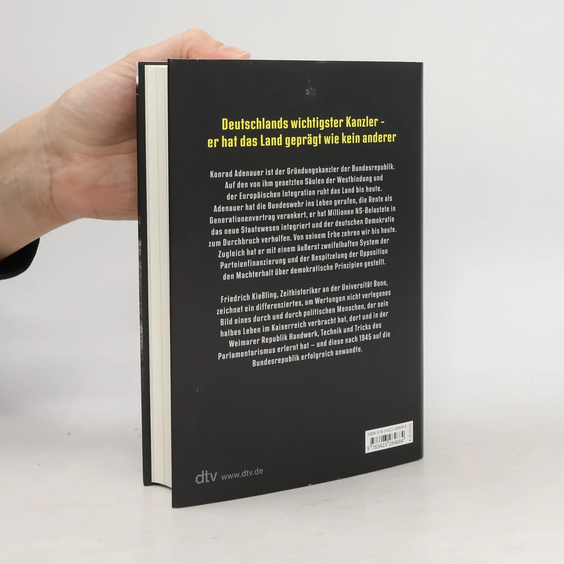 <strong>Ein großer Kanzler. Er prägt Deutschland bis heute.</strong> Konrad Adenauer hat viel dazu beigetragen, dass die Demokratiegründung in Deutschland nach 1945 gelang. Seine Entscheidungen bei der Ausformulierung des Grundgesetzes, des Umgangs mit NS-Belasteten, der Einführung der sozialen Marktwirtschaft, der Gründung einer christdemokratischen Partei haben das Land geprägt. Und Adenauer hat Deutschland zurück in den Kreis der Nationen geführt, in Europa und weltweit. Doch er hat die junge Demokratie auch existenziell belastet, mit illegaler Parteienfinanzierung und der geheimdienstlichen Ausspähung der SPD. Friedrich Kießling zeichnet das Bild eines ambivalenten Charakters, der große Handlungsmacht besaß und sie für das Land, seine Partei und nicht zuletzt für sich selbst einzusetzen wusste.