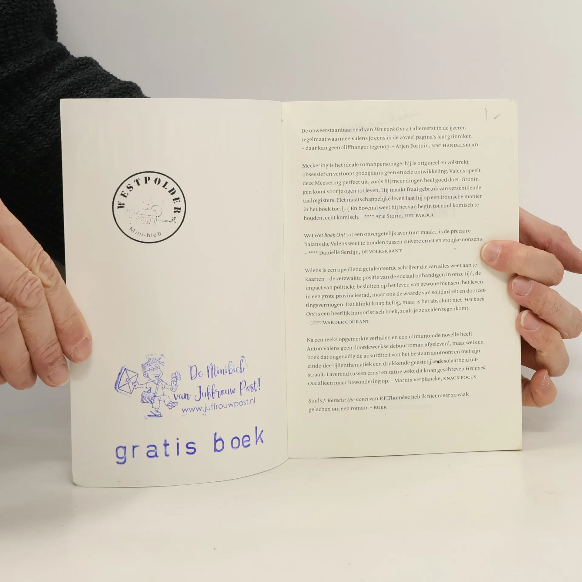 Met de overgang van de gulden naar de euro breekt voor Isebrand Schut de financiële ijstijd aan. Na oneervol ontslag als callcentermedewerker probeert hij zijn leven op de rit te krijgen door een zelfhulpgroep op te richten. De ambities van de leden van Man&Post strekken echter verder dan het saneren van hun administratie: de Limburger Jean-Luc wil van de wietplantage in zijn woonkamer af, de psychiatrisch verpleegkundige Sylvio probeert als vj naam te maken in het Groninger uitgaanscircuit en de voorman Ebel Formsma staat op de bres voor de ondergrondse toiletten op de Grote Markt. Wanneer de flamboyante en bemiddelde organisatieadviseur Meckering uit Nieuw-Buinen zich bij de groep meldt, wordt Isebrand uit zijn inertie getild. Meckering, met zijn fenomenaal onnavolgbare redeneerkunst, neemt hem mee op een lange reis naar de oorsprong van het voorvoegsel 'ont'. Het Boek Ont is een bij vlagen hilarische, bloedmooi geschreven roman waar het talent van Anton Valens van elke pagina af spat. Man&Post is een onvergetelijke vriendenclub.