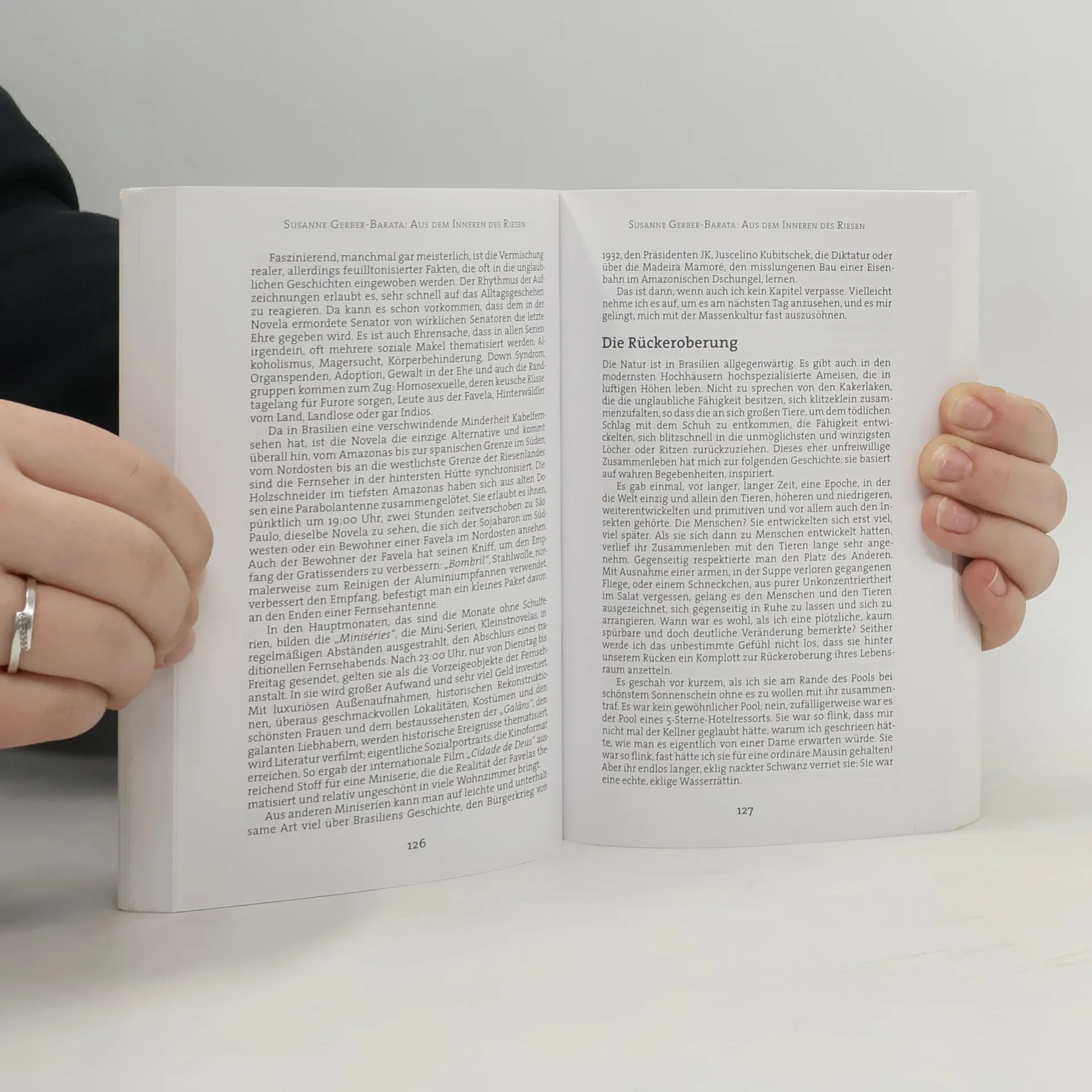 Mehr von allem – mehr Fläche, mehr Menschen, mehr Tiere, mehr Pflanzen, so der Eindruck von Brasilien auf Besucher aus dem vergleichsweise kleinen Europa. So ging es auch der Autorin, einer gebürtigen Schweizerin und nun schon seit 10 Jahren in Brasilien zu Haus. Amüsant und informativ berichtet sie aus dem brasilianischen Alltag, von den Dimensionen der Mega-Märkte, über die Liebe der Brasilianer zu Ihren Telenovelas, brasilianisches Fastfood (für das man einen starken Magen braucht) oder die Besonderheiten des Bussystems in Brasilien. Den Hintergrund der Berichte bilden Fakten zu Vegetation, Musik, Geschichte und Kultur in Brasilien, ebenso wie aktuelle Projekte wie z.B. Forschungsergebnisse der Universität UNICAMP im brasilianischen Dschungel. Das Buch erklärt Brasilien-Reisenden nicht, wo sie die nächste Sehenswürdigkeit finden, sondern bietet ihnen einen Einblick in den brasilianischen Alltag und hilft so manche Hindernisse zu überbrücken. Brasilien-Kenner finden in ihm interessantes Hintergrundwissen zur Landeskultur und Neugierigen einen ersten Einstieg in den „Riesen“.