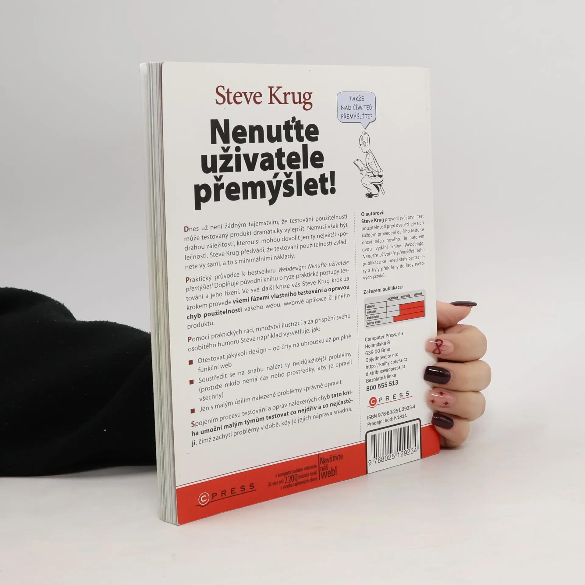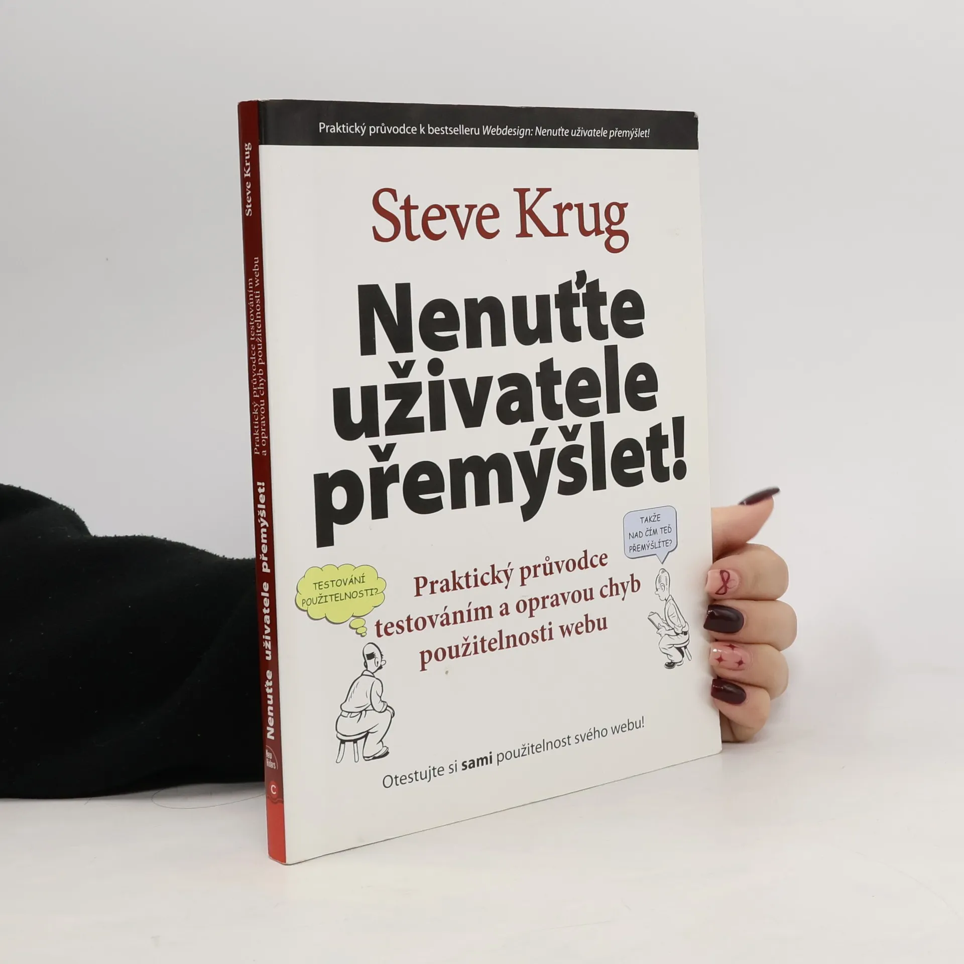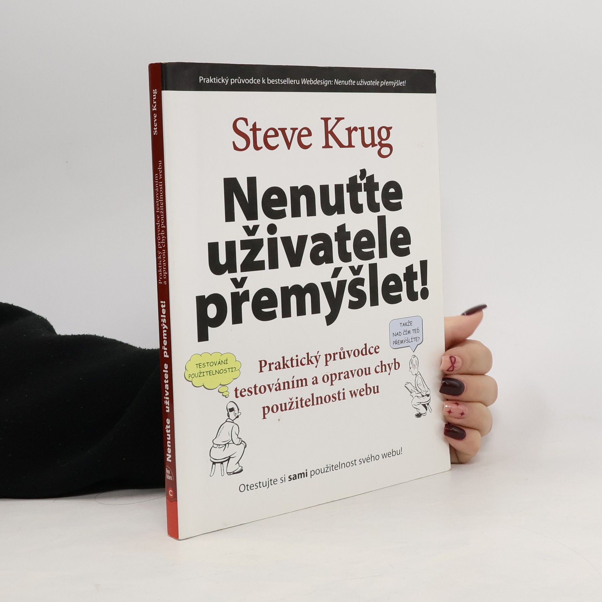 Testování použitelnosti může výrazně zlepšit kvalitu produktu a nemusí být drahé. Steve Krug ukazuje, že si testování můžete provést sami s minimálními náklady. Tento praktický průvodce doplňuje jeho bestseller o konkrétní postupy testování a jeho řízení. Krug vás provede všemi fázemi testování a opravou chyb použitelnosti vašeho webu, aplikace či jiného produktu. S množstvím ilustrací a osobitým humorem vysvětluje, jak otestovat jakýkoli design – od skici na ubrousku po plně funkční web. Zaměřuje se na identifikaci nejdůležitějších problémů, protože nikdo nemá čas nebo prostředky na opravu všech. S minimálním úsilím můžete správně opravit nalezené problémy. Kombinací procesu testování a oprav kniha umožňuje malým týmům testovat co nejdříve a co nejčastěji, což pomáhá zachytit problémy v době, kdy je jejich náprava snadná. Čtenáři najdou všechny materiály k publikaci na uvedené webové adrese. Steve Krug má dvacetiletou zkušenost s testováním použitelnosti a při každém testu se dozvídá něco nového. Je autorem dvou vydání bestselleru, který byl přeložen do mnoha jazyků.
