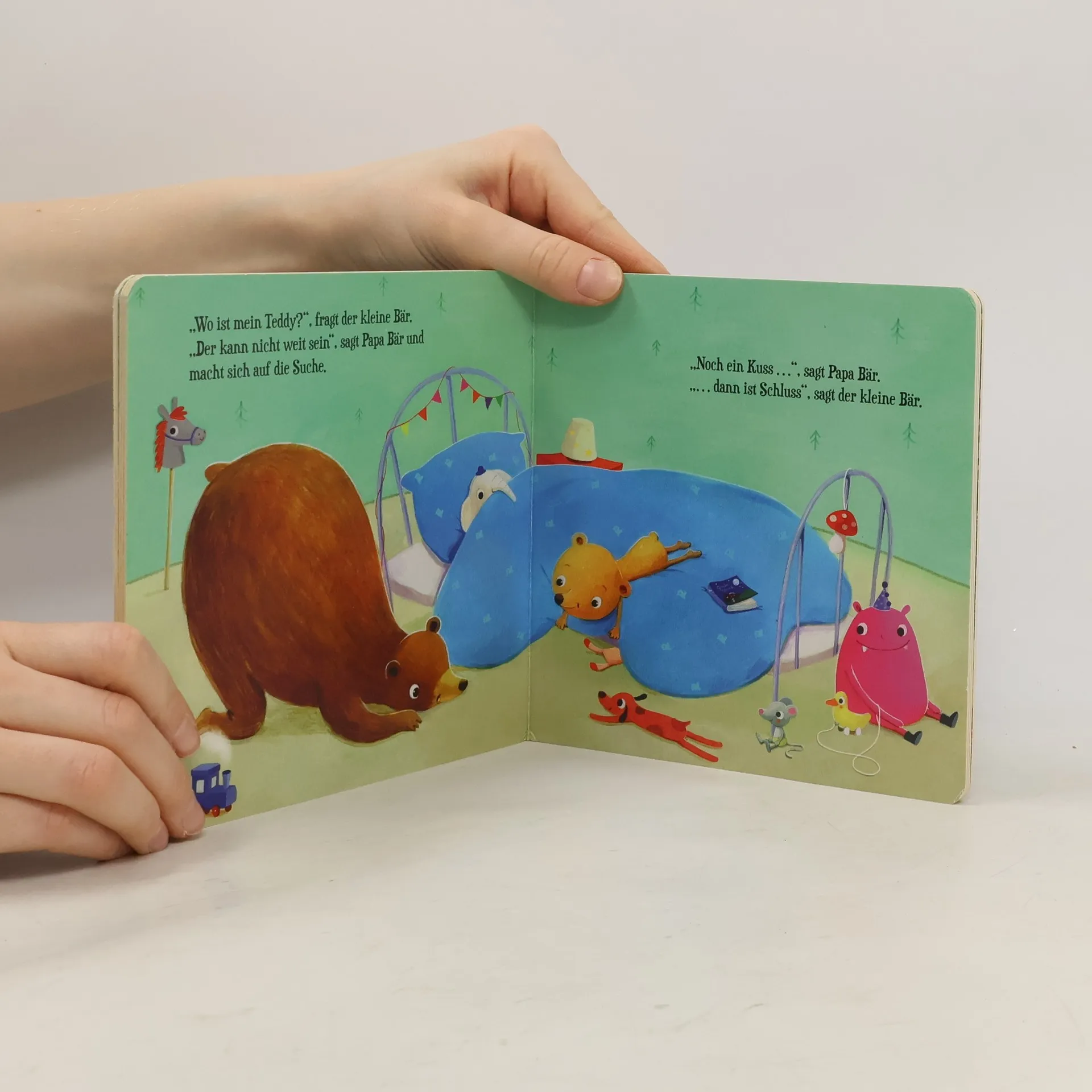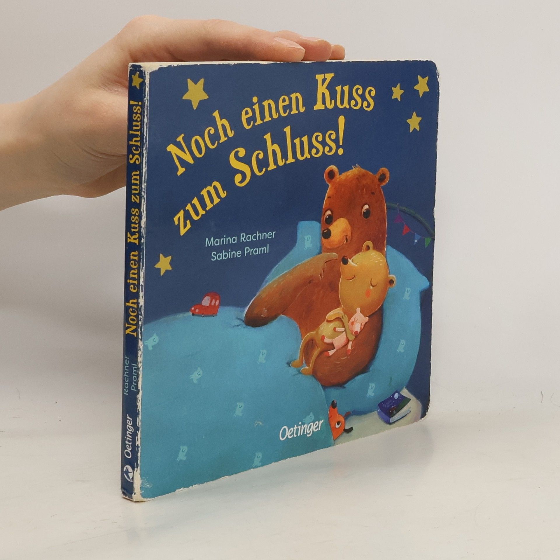 Im charmanten Pappbilderbuch „Noch einen Kuss zum Schluss!“ von Sabine Praml erleben kleine Zuhörer*innen die herzerwärmende Gute-Nacht-Routine des kleinen Bären und seines Papas. Als es Zeit ist ins Bett zu gehen, bittet der kleine Bär um einen letzten Kuss von Papa Bär. Doch bevor der kleine Bär einschlafen kann, gibt es noch ein paar Dinge, die erledigt werden müssen: Er hat Durst, sein Teddy ist verschwunden, und die Sterne am Himmel müssen noch bewundert werden. Schließlich kuscheln sich beide unter die Decke, und mit einem letzten Kuss schlafen sie ein. Die Geschichte wird durch die zauberhaften Illustrationen von Marina Rachner zum Leben erweckt, die jede Seite mit Wärme und Gemütlichkeit füllen. Adressiert das allabendliche Ritual des Zu-Bett-Gehens , eine Herausforderung, mit der sich viele junge Eltern konfrontiert sehen. Bietet praktische Lösungen für das weitverbreitete Problem des „Kann-nicht-Einschlafens“ bei Kindern, ein Thema, das in Ratgebern und Foren heiß diskutiert wird. Die Illustrationen von Marina Rachner verleihen der Geschichte eine besondere Wärme und Anziehungskraft , was das Buch zu einem visuellen Genuss für Kinder und Eltern macht. Perfekte Länge für eine Gute-Nacht-Geschichte : Weder zu lang noch zu kurz, ideal für das abendliche Vorlesen. Fördert eine enge Eltern-Kind-Bindung durch die Darstellung liebevoller Interaktionen zwischen Papa Bär und seinem Kleinen.