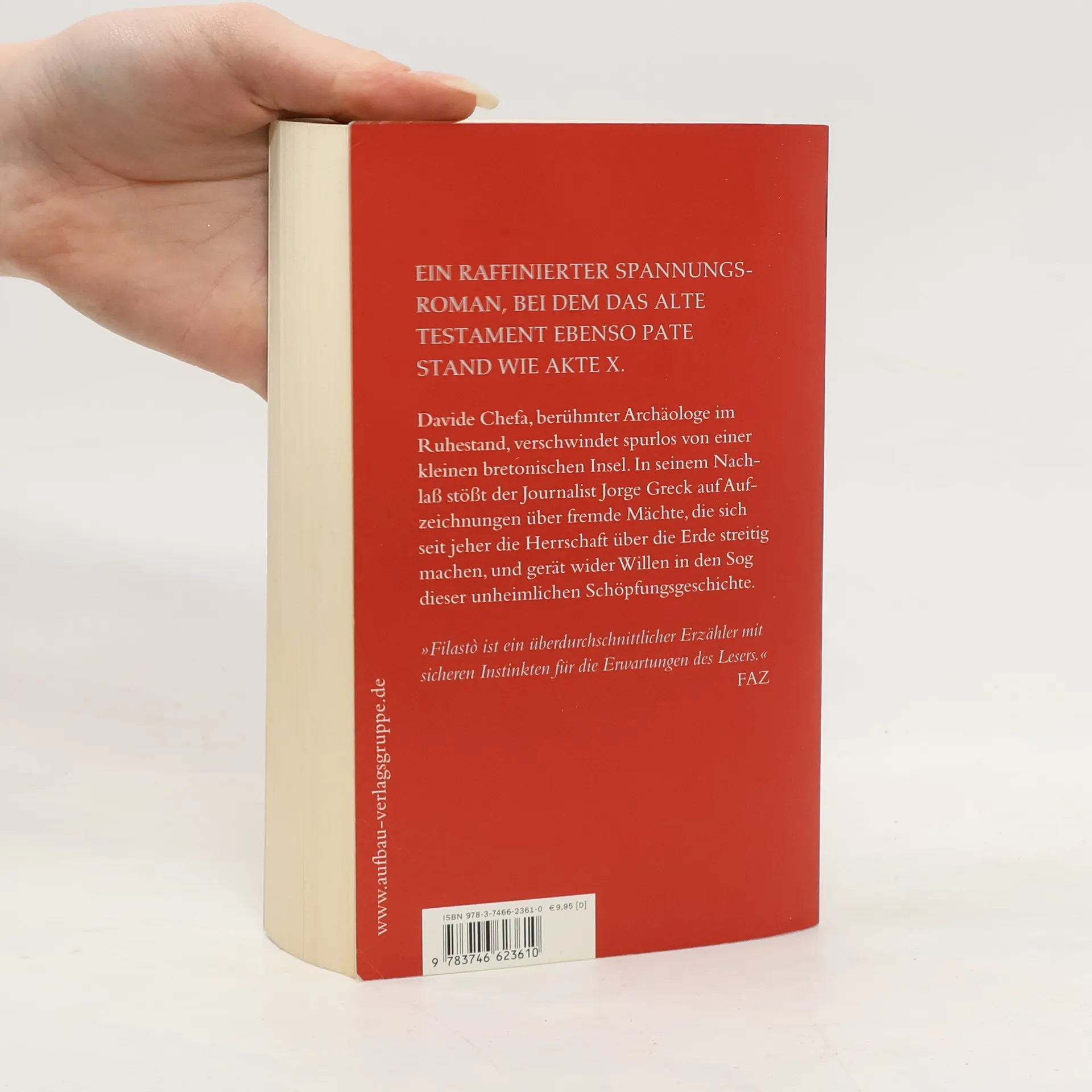 Ein raffinierter Thriller, bei dem das Alte Testament ebenso Pate stand wie Akte X. Davide Chefa, berühmter Archäologe im Ruhestand, verschwindet spurlos von einer kleinen bretonischen Insel. In seinem Nachlaß stößt der Journalist Jorge Greck auf Aufzeichnungen über fremde Mächte, die sich seit jeher die Herrschaft über die Erde streitig machen, und gerät wider Willen in den Sog dieser unheimlichen Schöpfungsgeschichte. „Filastò ist ein überdurchschnittlicher Erzähler mit sicheren Instinkten für die Erwartungen des Lesers.“ FAZ