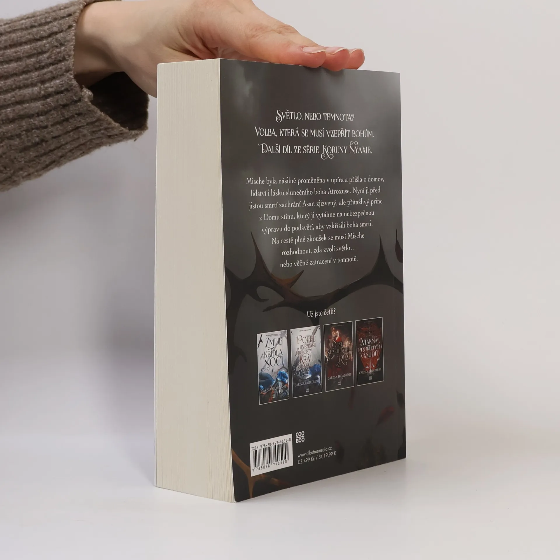Světlo, nebo temnota? Volba, která se musí vzepřít bohům. Další díl ze série Koruny Nyaxie. Mische byla násilně proměněna v upíra a přišla o domov, lidství i lásku slunečního boha Atroxe. Nyní ji před jistou smrtí zachrání Asar, zjizvený, ale přitažlivý princ z Domu stínu, který ji vytáhne na nebezpečnou výpravu do podsvětí, aby vzkřísili boha smrti. Na cestě plné zkoušek se musí Mische rozhodnout, zda zvolí světlo… nebo věčné zatracení v temnotě.