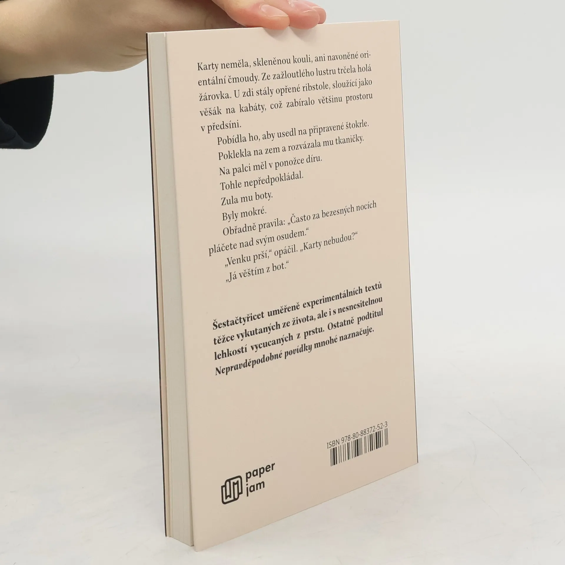 Šestačtyřicet uměřeně experimentálních textů těžce vykutaných ze života, ale i s nesnesitelnou lehkostí vycucaných z prstu. Ostatně podtitul Nepravděpodobné povídky mnohé naznačuje.