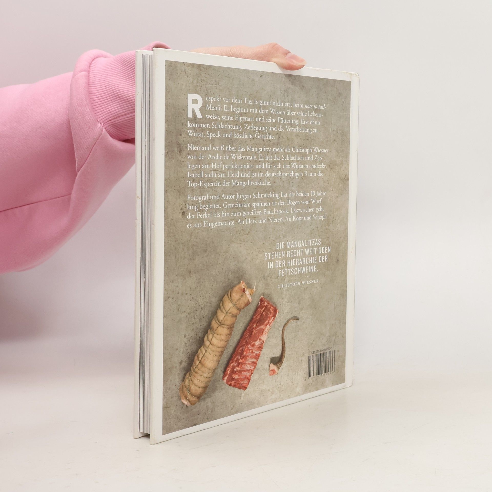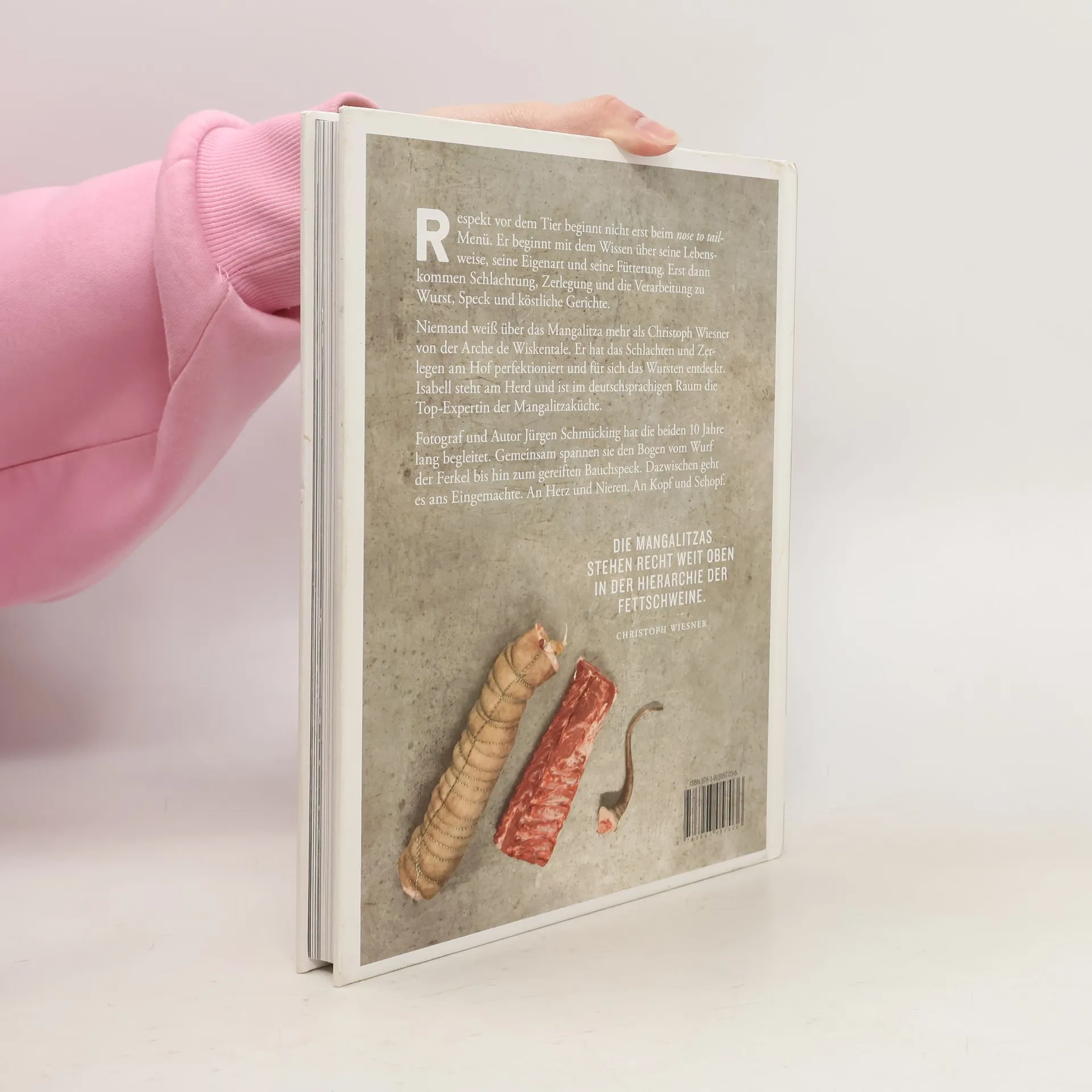 Isabell und Christoph Wiesner haben sich auf ihrem Bauernhof „Arche de Wiskentale“ einer alten Schweinerasse verschrieben: den Mangalitzas. Bei ihnen tummeln sich rote, blonde und schwalbenbäuchige Wollschweine jeden Alters, und unter ihrem Dach reifen Bäuche, Schinken, Speck und die besten Würste. Jürgen Schmücking, Journalist, Fotograf und als Konsument zum Mangalitza-Fetischisten mutiert, hat die Wiesners ein paar Jahre begleitet. Jetzt legen die drei das Ergebnis der gemeinsamen Zeit vor: Eine Biographie der Rasse, eine Streitschrift für Handwerk und Fleischqualität, eine Sammlung authentischer Rezepte und Geschichten aus dem Leben der mittlerweile international bekannten Schweinbauern.