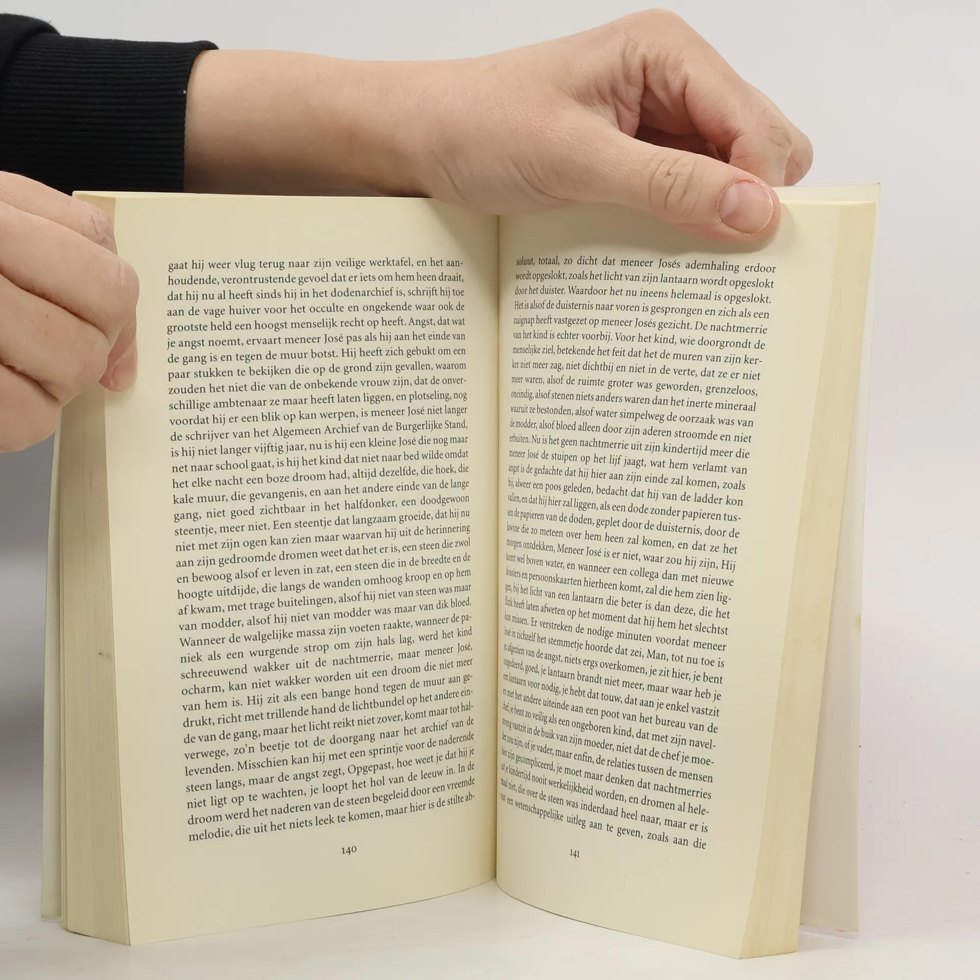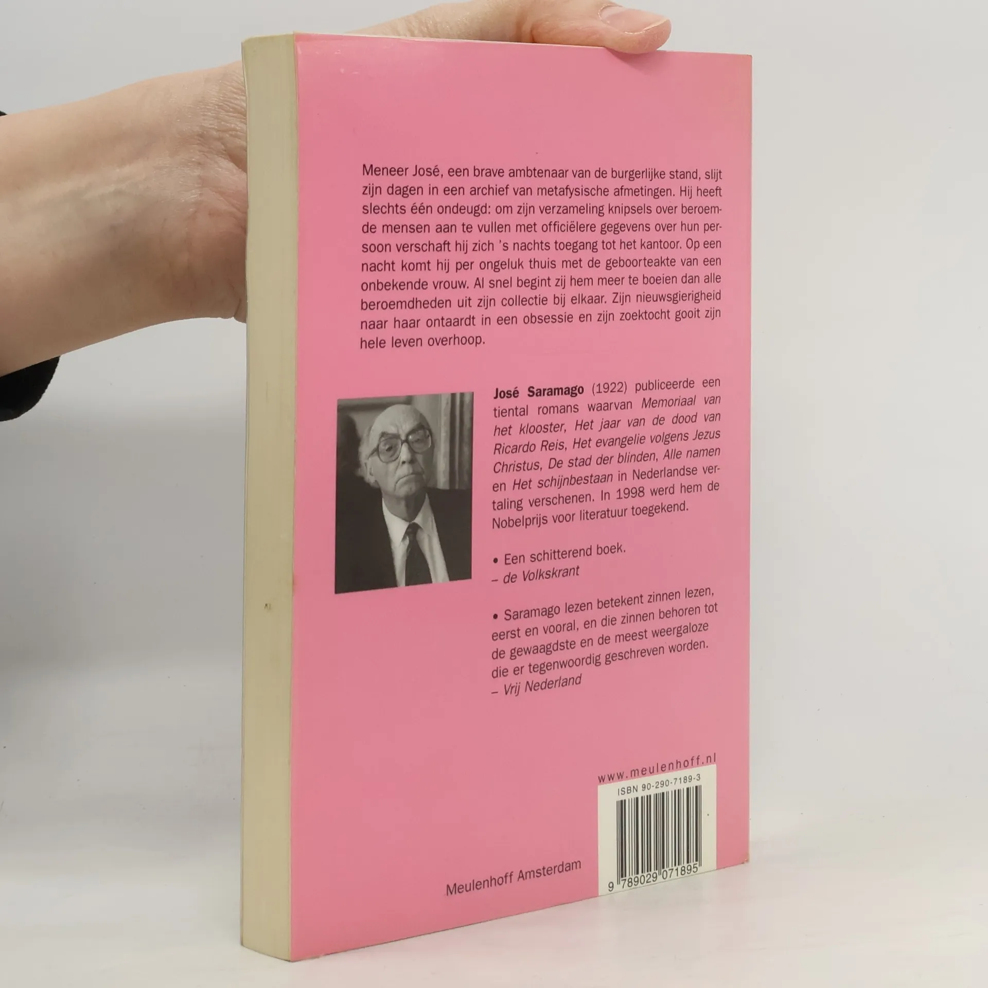 Meneer José, een brave ambtenaar van de burgelijke stand, slijt zijn dagen in een archief van metafysische afmetingen. Hij heeft slechts één ondeugd: om zijn verzameling knipsels over beroemde mensen aan te vullen met officiëlere gegevens over hun persoon verschaft hij per ongeluk thuis met de geboorteakte van een onbekende vrouw. Jose, een saaie ambtenaar op het z.g. Algemeen Archief van de Burgerlijke Stand, verzamelt krantenknipsels van beroemde mensen. Op een dag gaat zijn aandacht per toeval uit naar de geboorte-akte van een onbekende vrouw. Jose heeft een doel in zijn leven gevonden. Hij wil een reconstructie van het leven van deze vrouw maken. De weleer makke ambtenaar lapt nu alle regels aan zijn laars. Leugen, inbraak, werkverzuim, vervalsing van officiele documenten: het doel heiligt de middelen. Zijn nieuwsgierigheid wordt een ware obsessie. Zijn speurtocht is een verzetsdaad. Na een uitputtende speurtocht ontdekt Jose dat de onbekende vrouw zelfmoord heeft gepleegd. Jose is een ander mens geworden. De Portugese schrijver (1922, winnaar van de Nobelprijs 1998) heeft een intrigerende en prachtige roman geschreven die ons de meest donkere en negatieve kanten van de hedendaagse maatschappij laat zien: eenzaamheid, anonimiteit en volgzaamheid. Een juweeltje. Uitstekende en verzorgde vertaling naar het Nederlands.