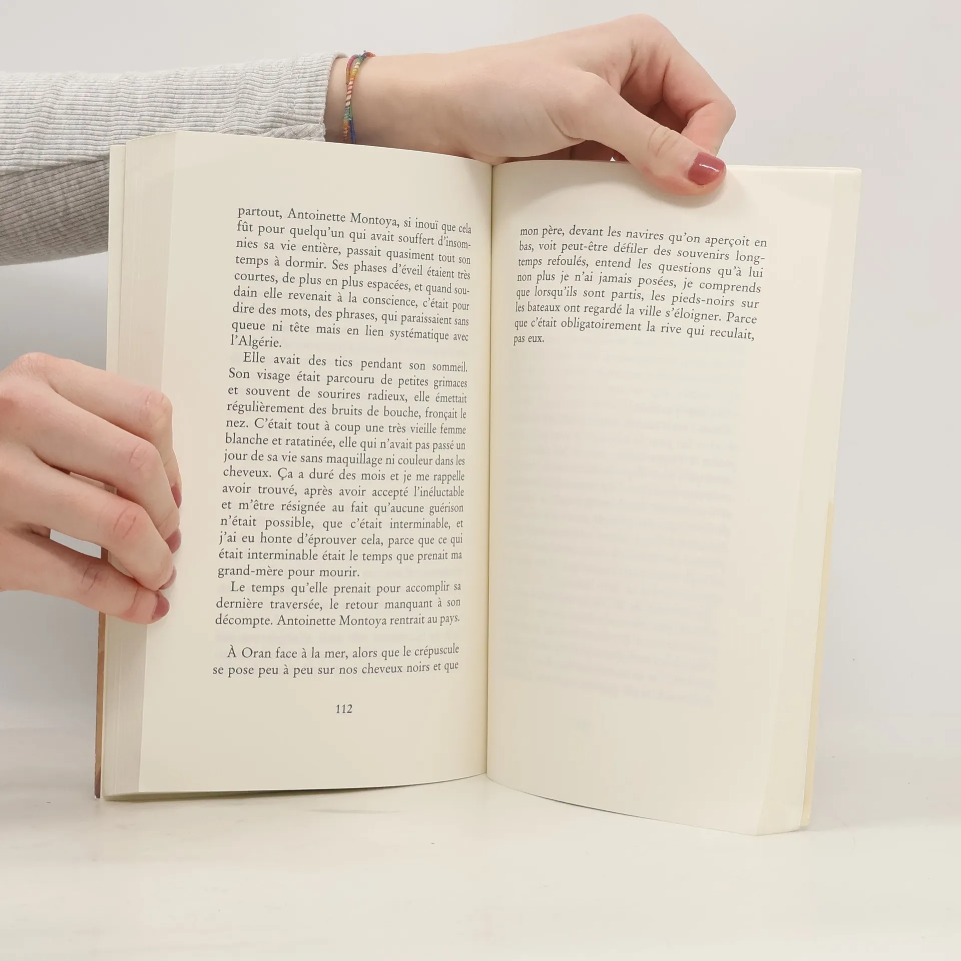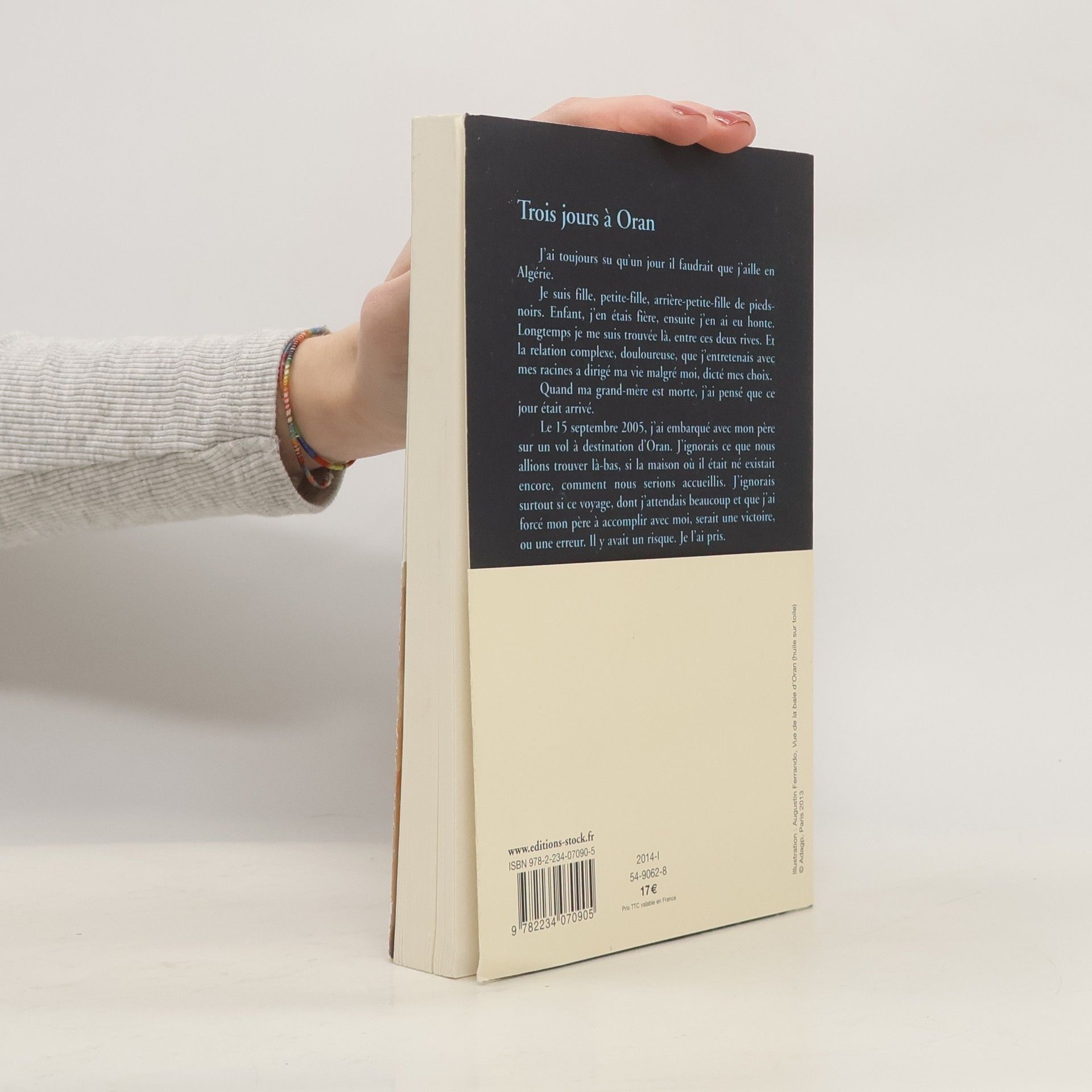 "J’ai toujours su qu’un jour il faudrait que j’aille en Algérie.Je suis fille, petite-fille, arrière-petite-fille de piedsnoirs. Enfant, j’en étais fière, ensuite j’en ai eu honte. Longtemps je me suis trouvée là, entre ces deux rives. Et la relation complexe, douloureuse, que j’entretenais avec mes racines a dirigé ma vie malgré moi, dicté mes choix.Quand ma grand-mère est morte, j’ai pensé que ce jour était arrivé.Le 15 septembre 2005, j’ai embarqué avec mon père sur un vol à destination d’Oran. J’ignorais ce que nous allions trouver là-bas, si la maison où il était né existait encore, comment nous serions accueillis. J’ignorais surtout si ce voyage, dont j’attendais beaucoup et que j’ai forcé mon père à accomplir avec moi, serait une victoire, ou une erreur. Il y avait un risque. Je l’ai pris."
