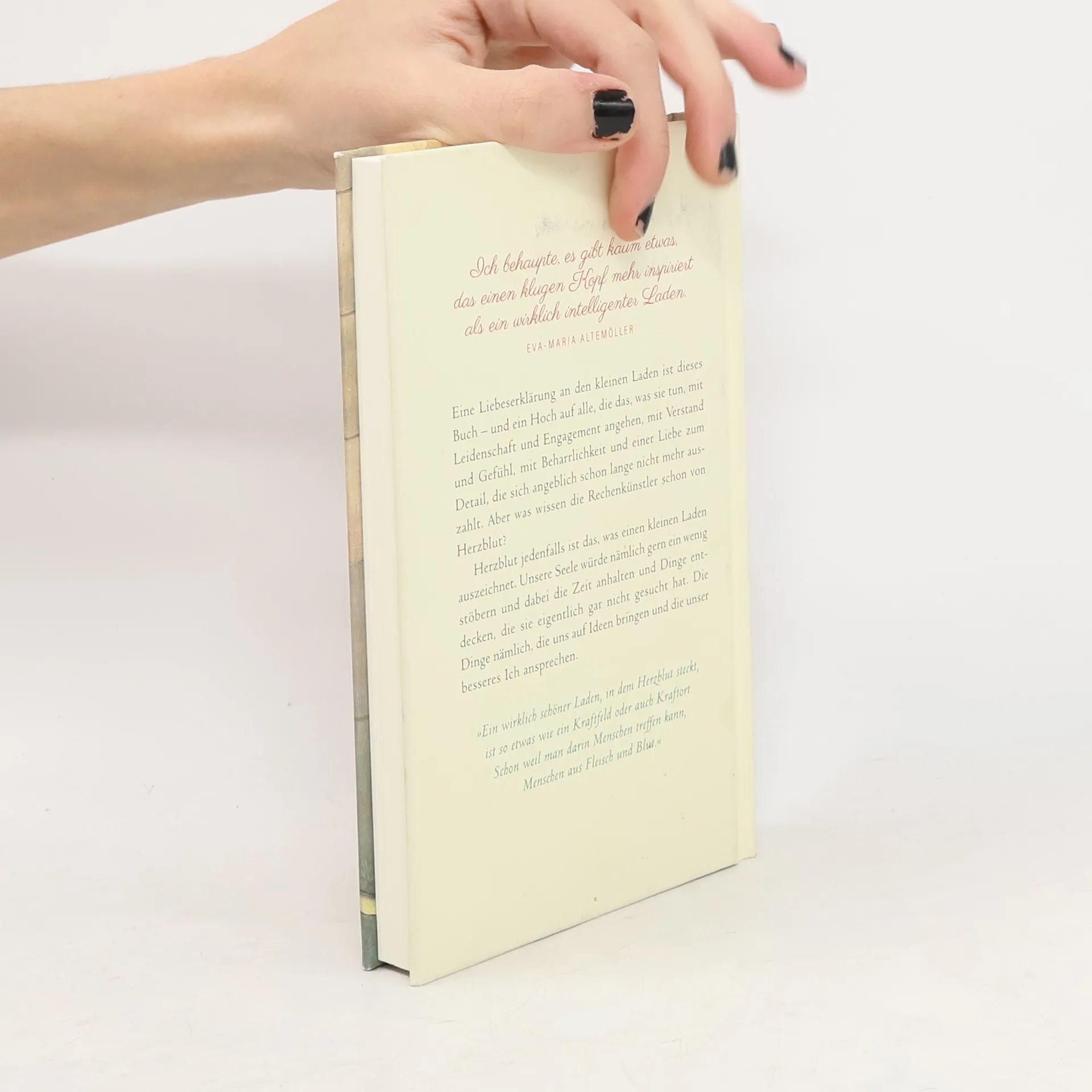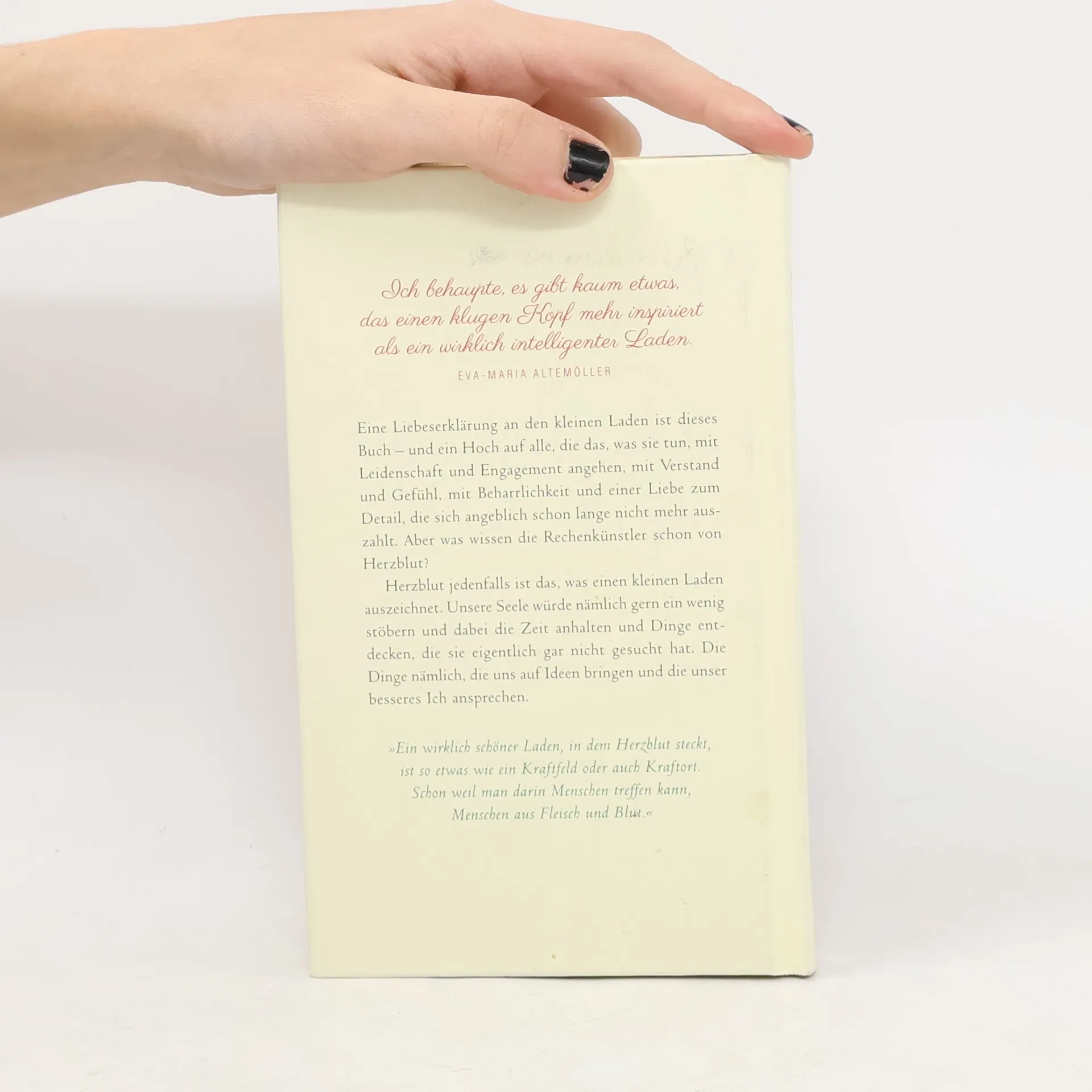 Eine Liebeserklärung an den kleinen Laden ist dieses Buch – und ein Hoch auf alle, die das, was sie tun, mit Leidenschaft und Engagement angehen, mit Verstand und sehr viel Gefühl, mit Beharrlichkeit und einer Liebe zum Detail, die sich angeblich schon lange nicht mehr auszahlt. Aber was wissen die Rechenkünstler schon von Herzblut? Herzblut jedenfalls ist das, was einen kleinen Laden auszeichnet, was er den großen voraushat. Oder den Webshops, die weder schön noch gemütlich noch inspirierend und schon gar nicht lustig sind. Weil sie unsere Seele nicht ansprechen. Die würde nämlich gern ein wenig stöbern und dabei die Zeit anhalten und Dinge entdecken, die sie eigentlich gar nicht gesucht hat. Die Dinge nämlich, die uns auf Ideen bringen und die unser besseres Ich ansprechen. Kluge Leute spüren jedenfalls, wo Herzblut fehlt. Und werden immer honorieren, wo es fließt. Das – nicht mehr und nicht weniger – versucht dieses fröhliche Buch zu beweisen.