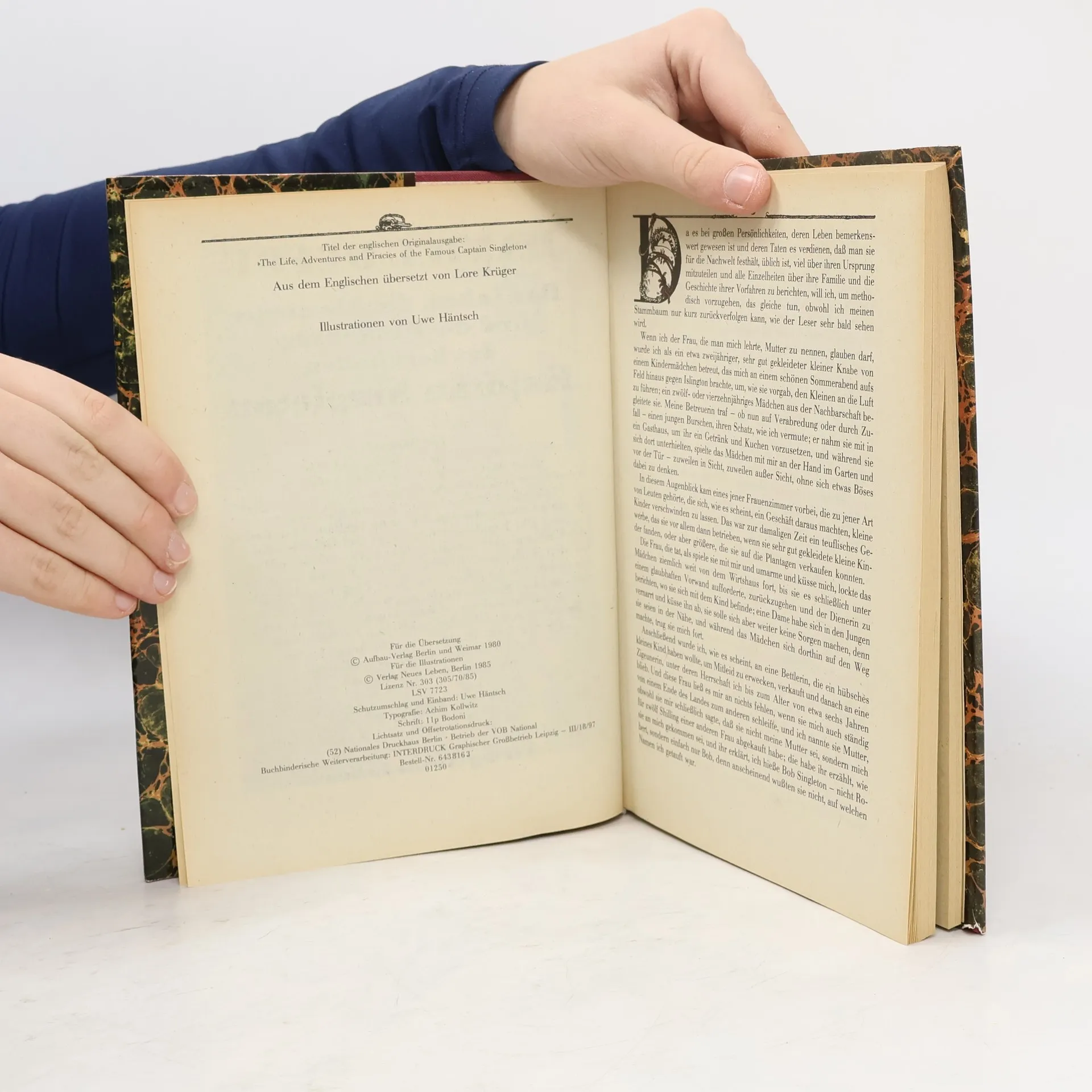 Buch selbst in sehr gutem Zustand, wirkt ungelesen, fleckenfrei, Schutzumschlag hat leichte Randläsuren. Grünes silbergeprägtes Leinen mit Titelvignette. So außergewöhnlich, wie es zunächst scheint, ist der Lebensweg unseres Helden gar nicht. Zwei Jahre ist er alt, da wird er seiner Amme gestohlen, vielleicht mit der Absicht, ihn als Sklaven auf irgendeine Plantage in Übersee zu verkaufen. Dann aber gerät er an eine Zigeunerin und schließlich auf ein Schiff. Auf der untersten Stufe fängt er an, als Geprügelter, dem bald klar ist, dass es damit aufhören muss. Doch es gibt nur eine Wahl für ihn: entweder zu verhungern - oder Seeräuber zu werden. Was er tut, tut er ganz und bringt es zum eigenen Schiff, mit dem er Reichtümer auf Reichtümer häuft, so viel, dass er sich am Ende zur Ruhe setzen kann. Mit seinem "Bob Singleton" hat Defoe eine der ersten literarisch gestalteten Seeräubergeschichten geschaffen, die nicht nur spannende Abenteuer bietet, sondern auch ihrer Zeit einen kritischen Spiegel vorhält.