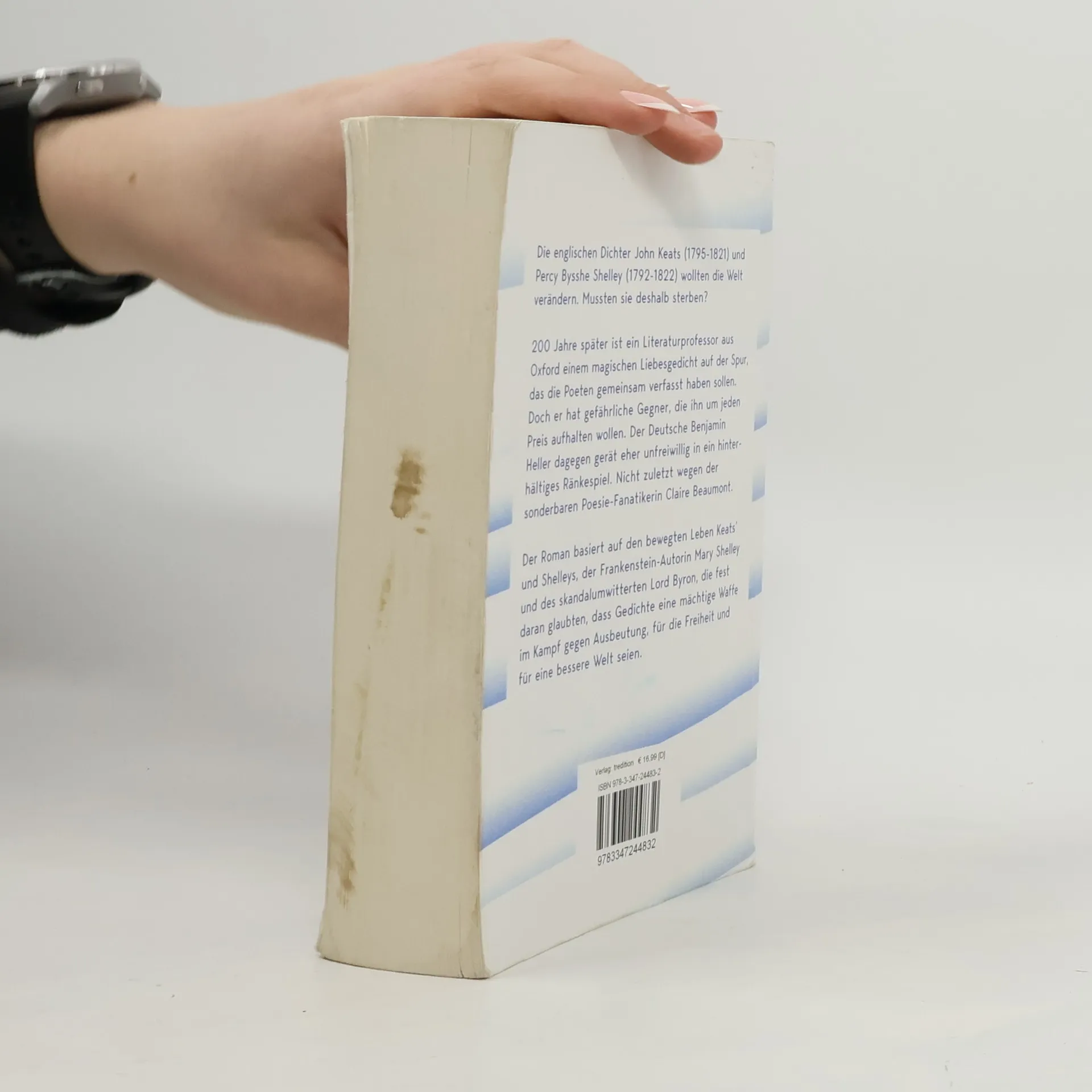 Die englischen Dichter John Keats (+ 1821) und Percy Bysshe Shelley (+1822) wollten die Welt verändern. Wurden sie deshalb von Agenten der britischen Krone umgebracht? 200 Jahre später ist ein Literaturprofessor aus Oxford einem magischen Liebesgedicht auf der Spur, das die Poeten gemeinsam verfasst haben sollen. Doch mächtige Kräfte - und ein skrupelloser Widersacher - wollen ihn um jeden Preis aufhalten. Der Deutsche Benjamin Heller gerät eher unfreiwillig in ein hinterhältiges, lebensgefährliches Ränkespiel. Nicht zuletzt wegen der attraktiven, sonderbaren, idealistischen Poesie-Fanatikerin Claire Beaumont. Der Roman basiert auf den wahren Begebenheiten der bewegten Leben Keats' und Shelleys, die in einer Zeit der Unterdrückung und großer sozialer Ungerechtigkeit fest daran glaubten, dass Gedichte eine mächtige Waffe im Kampf gegen Ausbeutung, für die Freiheit und für eine bessere Welt seien.