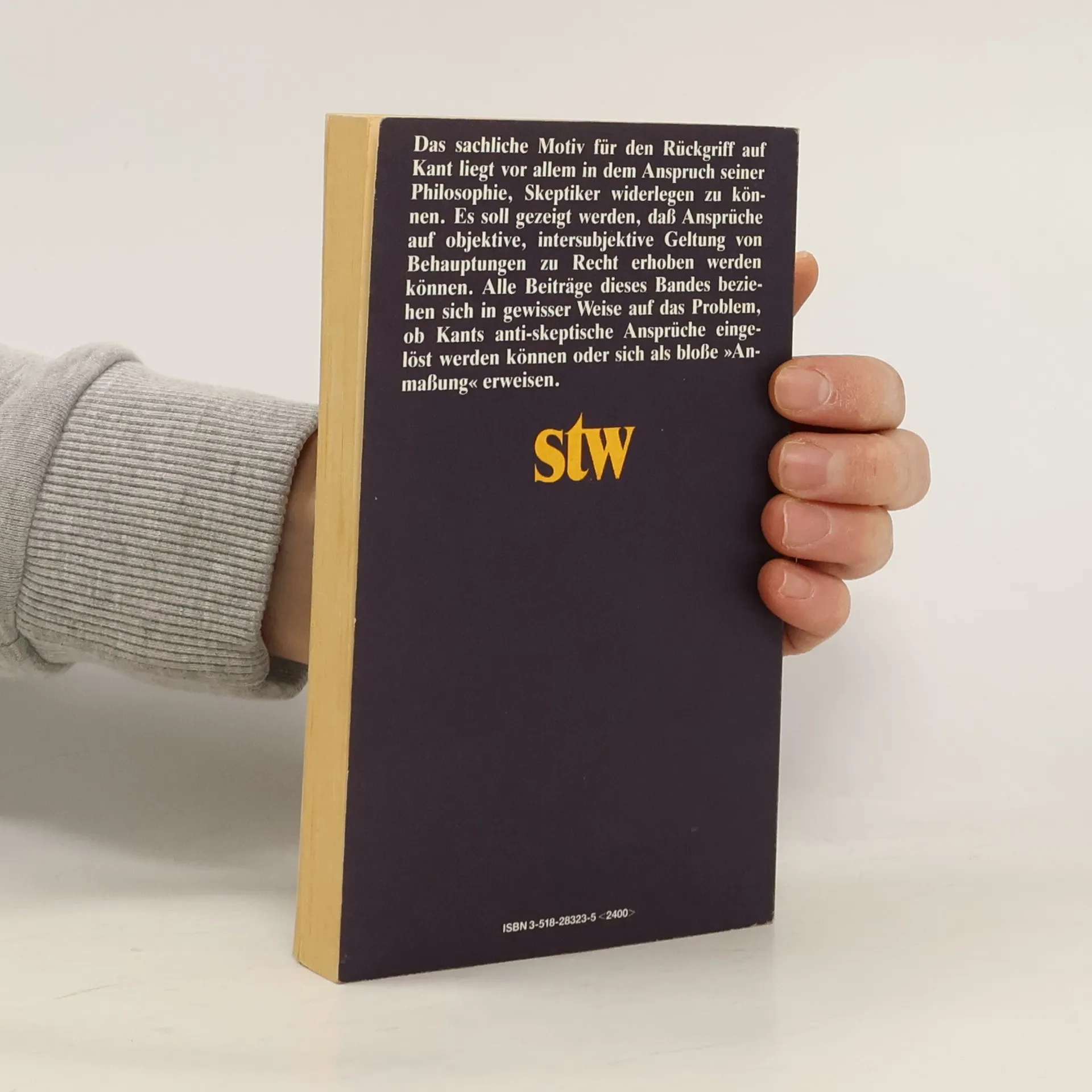 Herausgegeben vom Forum für Philosophie, Bad HomburgMan bemüht sich, Kants schwierige Gedankengänge mit den inzwischen gewonnenen begrifflichen Mitteln zu entwirren und ihnen eine überprüfbare Ordnung zu geben, um die dunkle transzendentalphilosophische Denkart gleichsam zu lichten und begrifflich zu domestizieren. Dabei erweist sich für manchen eine mehr oder minder eingreifende »Kant-Transformation« (Apel) als unumgänglich. Kant-Interpretation, Kant-Rekonstruktion und systematisches Denken gehen dabei Hand in Hand. Über den Umfang des Interesses an Kantischer Transzendentalphilosophie informiert die diesem Band beigegebene Bibliographie. (source: publisher)Inhalt:Seebohm, Thomas M.: Über die unmögliche Möglichkeit, andere Kategorien zu denken als die unseren. Harrison, Ross: Wie man dem transzendentalen Ich einen Sinn verleiht. Übersetzt von Wolfgang R.Köhler. Aschenberg, Reinhold: Einiges über Selbstbewußtsein als Prinzip der Transzendentalphilosophie. Becker, Wolfgang: Über den Objektivitätsanspruch empirischer Urteile und seine transzendentale Begründung. Blasche, Siegfried: Selbstaffektion und Schematismus. Kants transzendentale Deduktion als Lösung eines apriorischen Universalienproblems. Hoppe, Hansgeorg: Die Bedeutung der Empirie für transzendentale Deduktionen. Rohs, Peter: Die transzendentale Deduktion als Lösung von Invarianzproblemen. Kuhlmann, Wolfgang: Kant und die Transzendentalpragmatik. Transzendentale Deduktion und reflexive Letztbegründung. Köhler, Wolfgang R.: Reflexive, transzendentale und skeptische Argumente - ein szenischer Kommentar. Øfsti, Audun: Strawsons Paralogismus. Kants »Ich denke und die Kant-Rekonstruktion Strawsons im Lichte der »Doppelstruktur der Rede. Hossenfelder, Malte: Überlegungen zu einer transzendentalen Deduktion des kategorischen Imperativs. Wüstehube, Axel: Bibliographie. Neuere Literatur zur theoretischen Philosophie Kants (1976-1986).