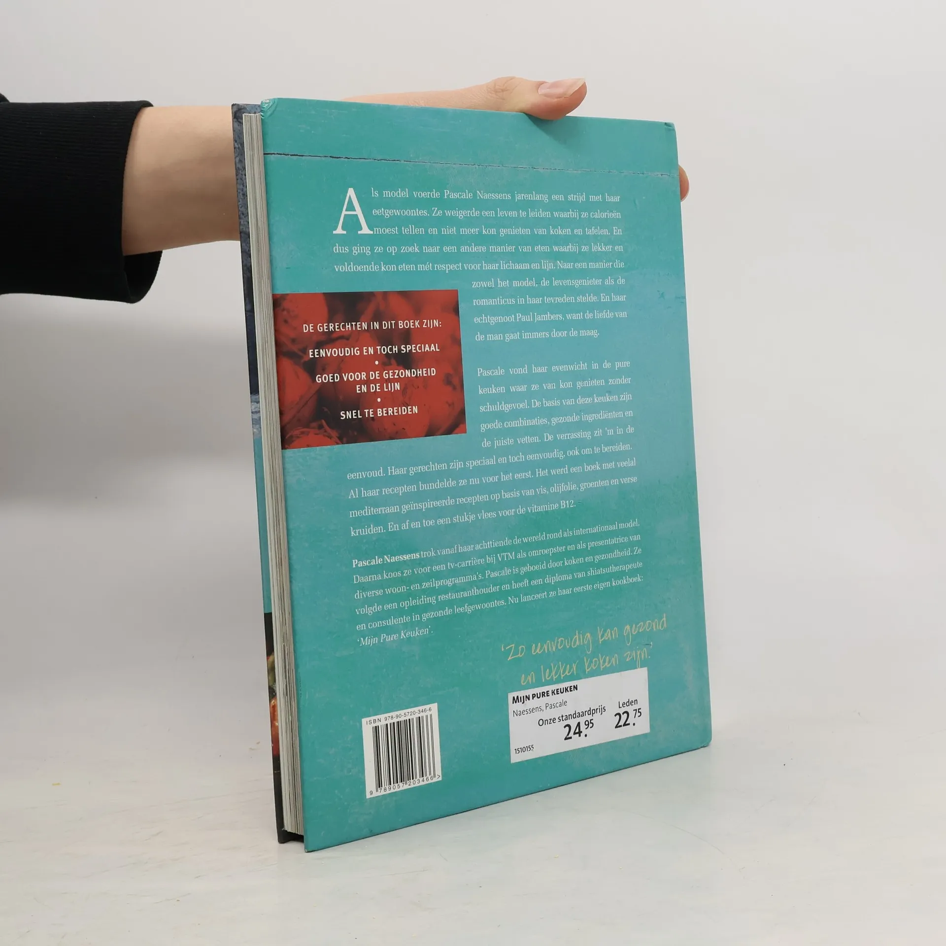 Als model voerde Pascale Naessens jarenlang een strijd met haar eetgewoontes. Ze weigerde een leven te leiden waarbij ze calorieën moest tellen en niet meer kon genieten van koken en tafelen. En dus ging ze op zoek naar een andere manier van eten waarbij ze lekker en voldoende kon eten mét respect voor haar lichaam en lijn. Naar een manier die zowel het model, de levensgenieter als de romanticus in haar tevreden stelde. En haar echtgenoot Paul Jambers, want de liefde van de man gaat immers door de maag. Pascale vond haar evenwicht in de pure keuken waar ze van kon genieten zonder schuldgevoel. De basis van deze keuken zijn goede combinaties, gezonde ingrediënten en de juiste vetten. De verrassing zit 'm in de eenvoud. Haar gerechten zijn speciaal en toch eenvoudig, ook om te bereiden. Al haar recepten bundelde ze nu voor het eerst. Het werd een boek met veelal mediterraan geïnspireerde recepten op basis van vis, olijfolie, groenten en verse kruiden. En af en toe een stukje vlees voor de vitamine B12.