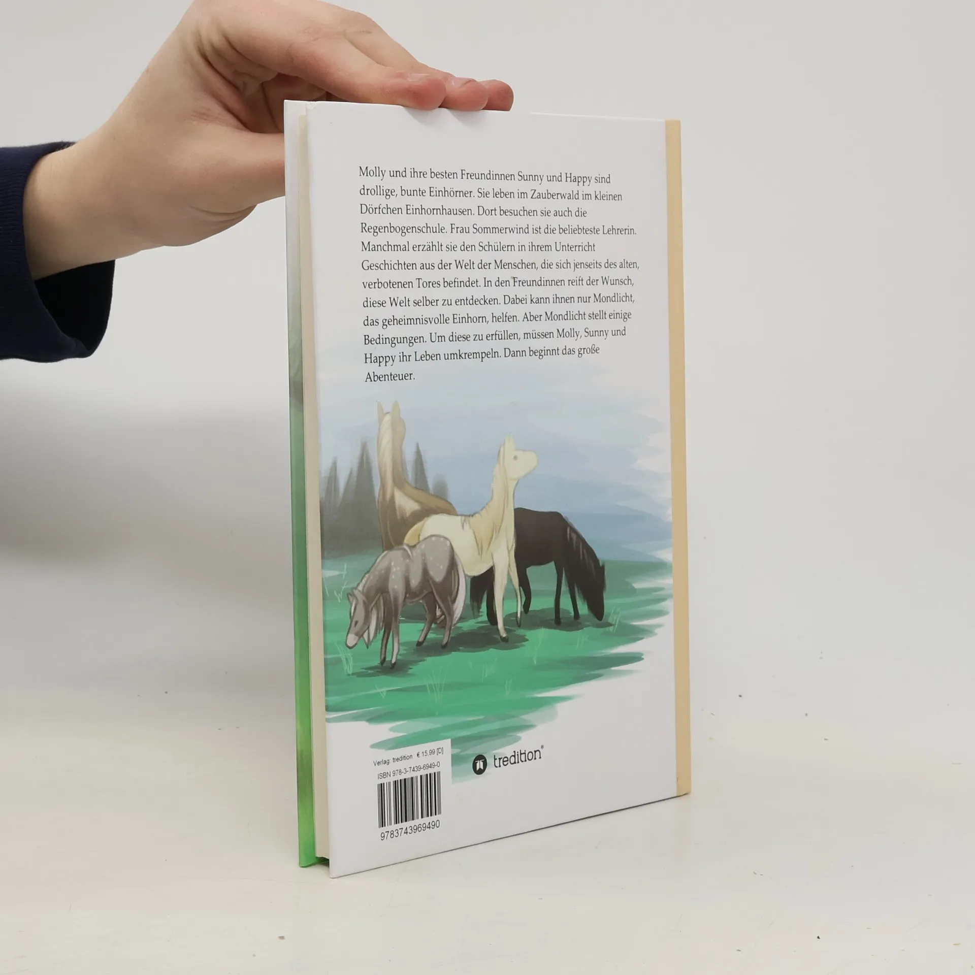 Molly und ihre Freundinnen Sunny und Happy sind lustige, bunte Einhörner. Sie leben im Zauberwald, und besuchen dort die Regenbogenschule. Von ihrer Lieblingslehrerin, Fau Sommerwind, erfahren sie manchmal im Unterricht, was sich vor dem großen, verbotenen Tor, in der Welt der Menschen ereignet. In Molly und ihren Freundinnen wächst der Wunsch, diese Welt selber zu erleben. Nur Mondlicht, das geheimnisvolle Einhorn, kann ihnen dabei helfen. Nachdem sie viele Prüfungen bestanden und ihre Teamfähigkeit bewiesen haben, beginnt für sie das große Abenteuer. Gemeinsam mit Mondlicht überwinden sie das große, verbotene Tor und gelangen so in die Menschenwelt. Dort helfen sie Tobias, einem jungen Pferdehofbesitzer, und seinen Freunden. In einer gefährlichen, nächtlichen Aktion befreien sie die Pferde von Bauer Geizigmann, die auf seinem Hof unter schlechtesten Bedingungen gehalten werden.