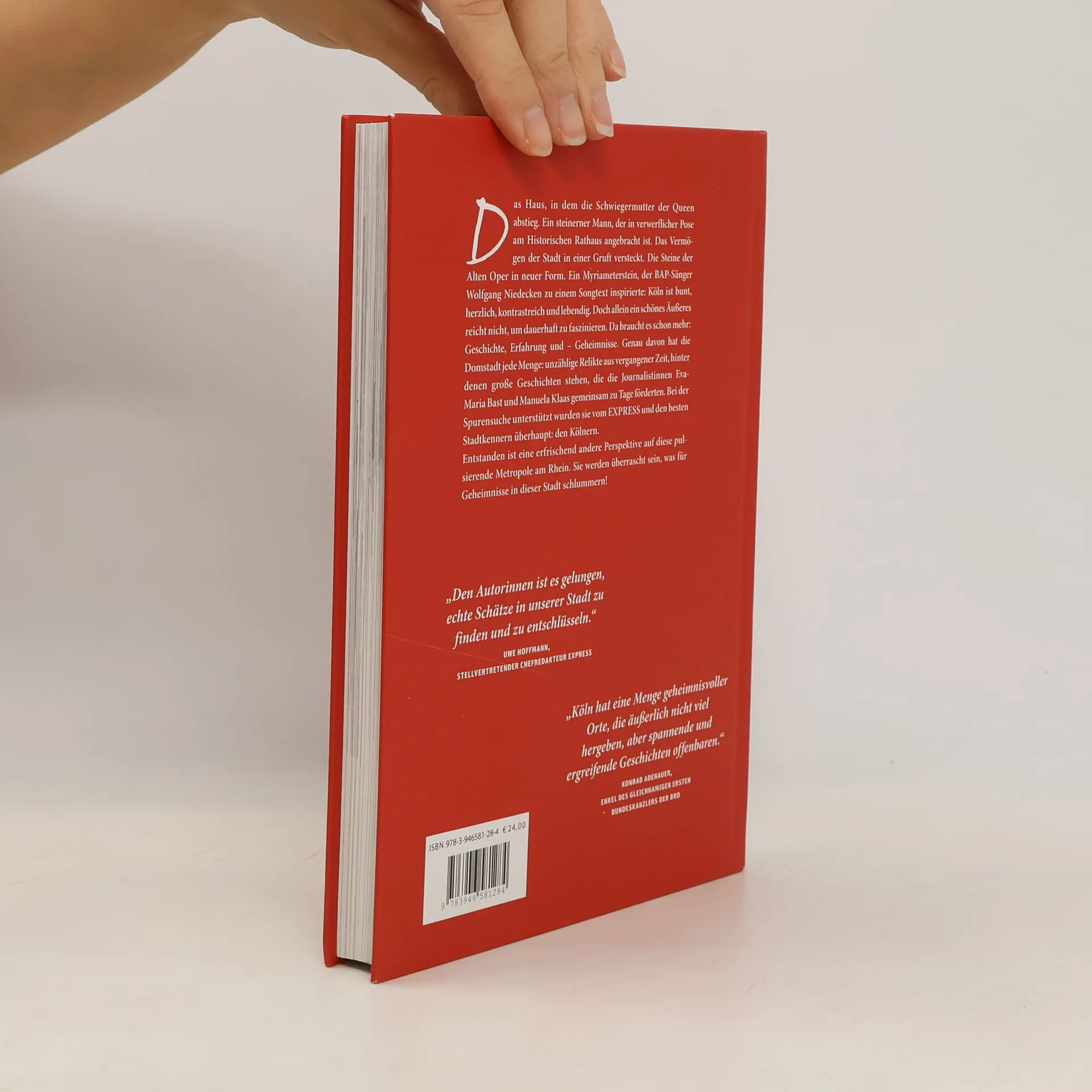 Das Haus, in dem die Schwiegermutter der Queen abstieg. Ein steinerner Mann, der in ausgesprochen verwerflicher Pose am Alten Rathaus steht. Das Vermögen der Stadt in einer Gruft versteckt. Die Steine der Alten Oper in neuer Form. Ein Myriameterstein, der BAP-Sänger Wolfgang Niedecken zu einem Songtext inspirierte. Köln ist bunt, herzlich, kontrastreich und lebendig. Doch allein ein schönes Äußeres reicht nicht, um dauerhaft zu faszinieren. Da braucht es schon mehr: Geschichte, Erfahrung und – Geheimnisse. Genau davon hat die Domstadt jede Menge: der Schutzpatron und das Kölsch. Holprig verlegte Steine einer Römerstraße – ein Kölner Schildbürgerstreich. Hinter all dem stehen große Geschichten, die die Journalistinnen Eva-Maria Bast und Manuela Klaas gemeinsam zu Tage förderten. Unterstützt bei er Spurensuche wurden sie vom EXPRESS und den besten Stadtkennern überhaupt: den Kölnern. Darunter Konrad Adenauer, Enkel des gleichnamigen Bundeskanzlers und Kölner Oberbürgermeisters, der eine bewegende Geschichte über seinen Großvater erzählt. Entstanden ist eine erfrischend andere Perspektive auf diese pulsierende Stadt am Rhein. Sie werden überrascht sein, was für Geheimnisse in dieser Stadt schlummern.