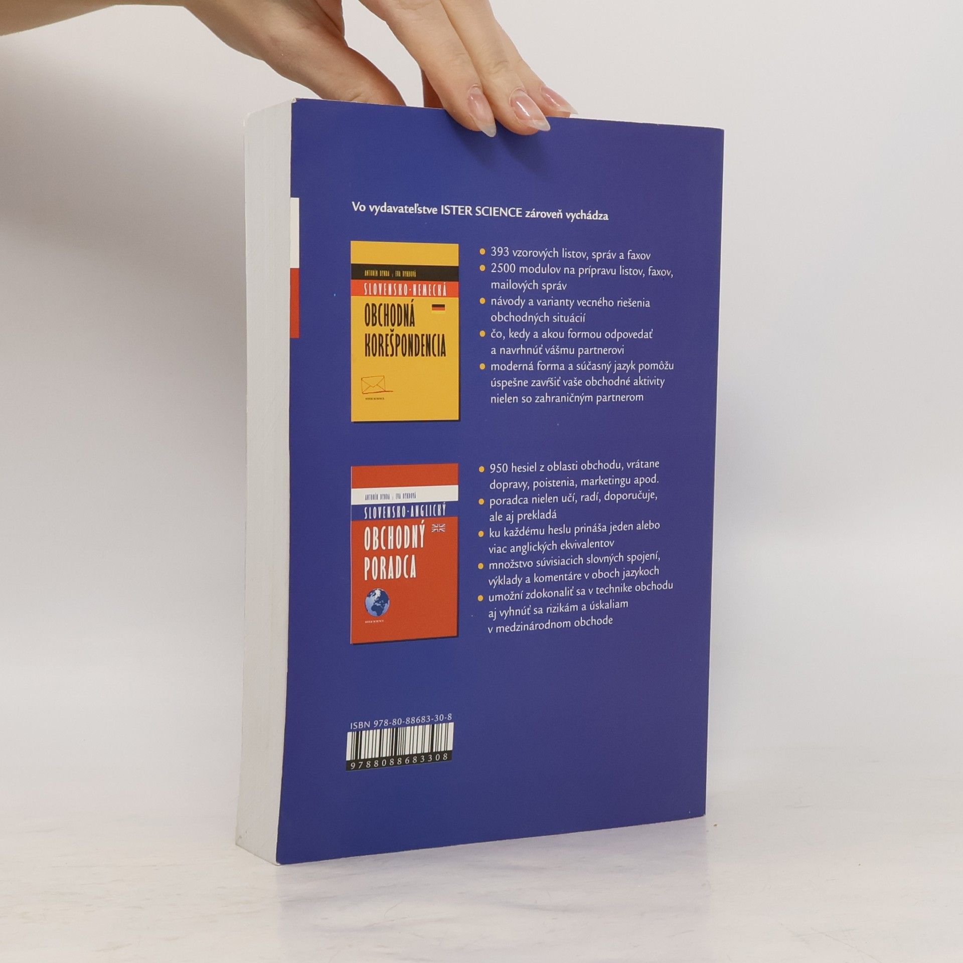 V poradí už 2. aktualizované (upravené) vydanie úspešnej publikácie od autorov A. Dyndu a E. Dyndovej predstavuje užitočnú pomôcku pre všetkých, ktorí obchodujú so zahraničím. Kniha obsahuje 393 vzorových listov, správ a faxov súčasne v slovenskej i anglickej verzii, 2500 modulov na prípravu listov, faxov i mailových správ v oboch jazykoch. Obsahovo pokrýva všetky možné obchodné situácie a prináša aj návody a varianty ich vecného riešenia, poradí, čo, kedy a akou formou odpovedať a navrhnúť obchodnému partnerovi. Moderná forma, súčasný jazyk a prehľadné usporiadanie robia túto knihu nepostrádateľnou pre každého úspešného obchodníka.