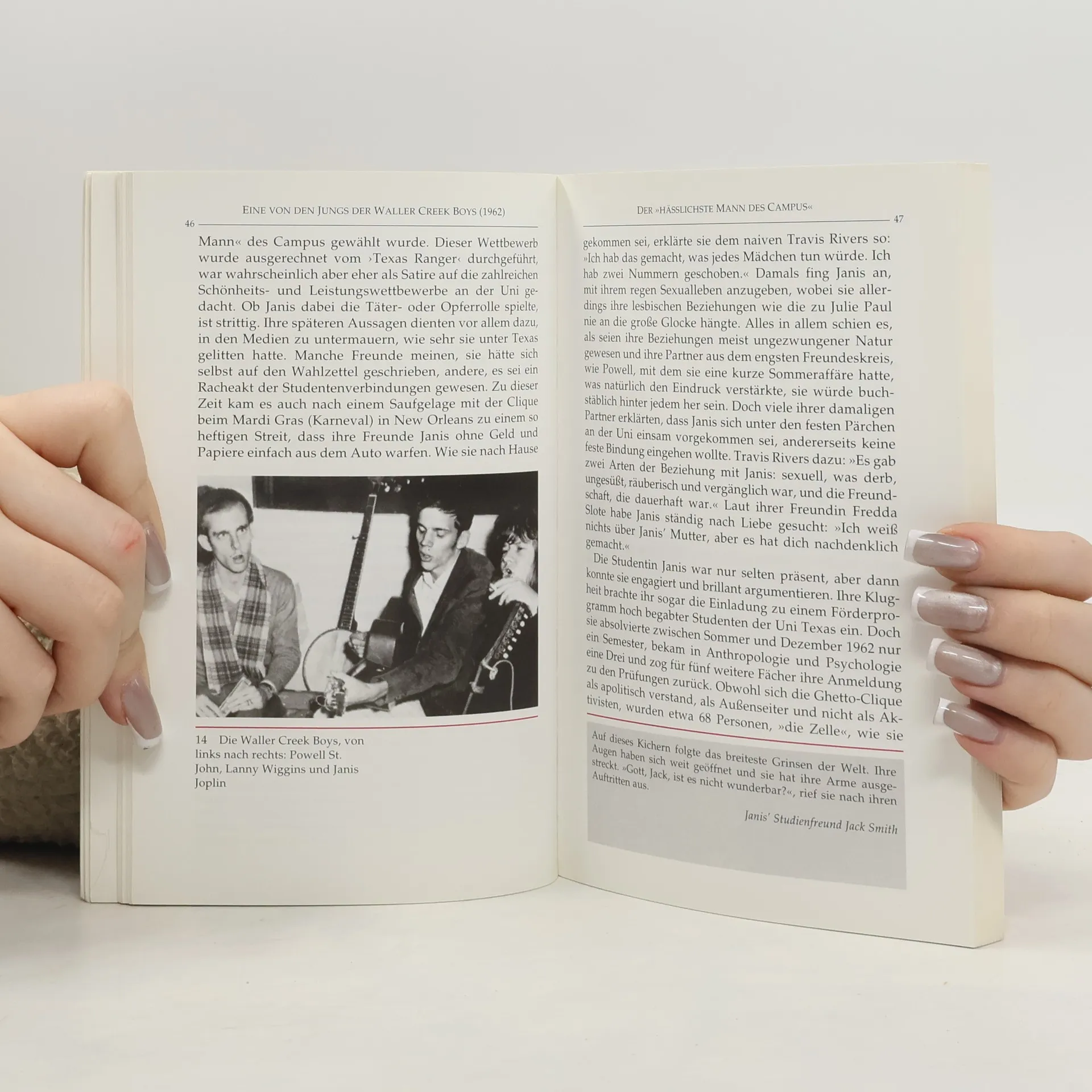 Janis Joplin (1943-1970), auch Pearl genannt, war ein pummeliger und pickeliger Teenager und wurde das 'Leitbild der Hippie-Generation und die unbestrittene Königin der Rockmusik', ein erster weiblicher Mega-Star, auf der Bühne eine Urgewalt, neben der Madonna wie die Leadsängerin eines Kinderchors wirkt. Die grandiose Bluessängerin starb mit 27 an einer Überdosis Heroin oder vielmehr, wie Eric Burdon meinte, 'an einer Überdosis Janis'.