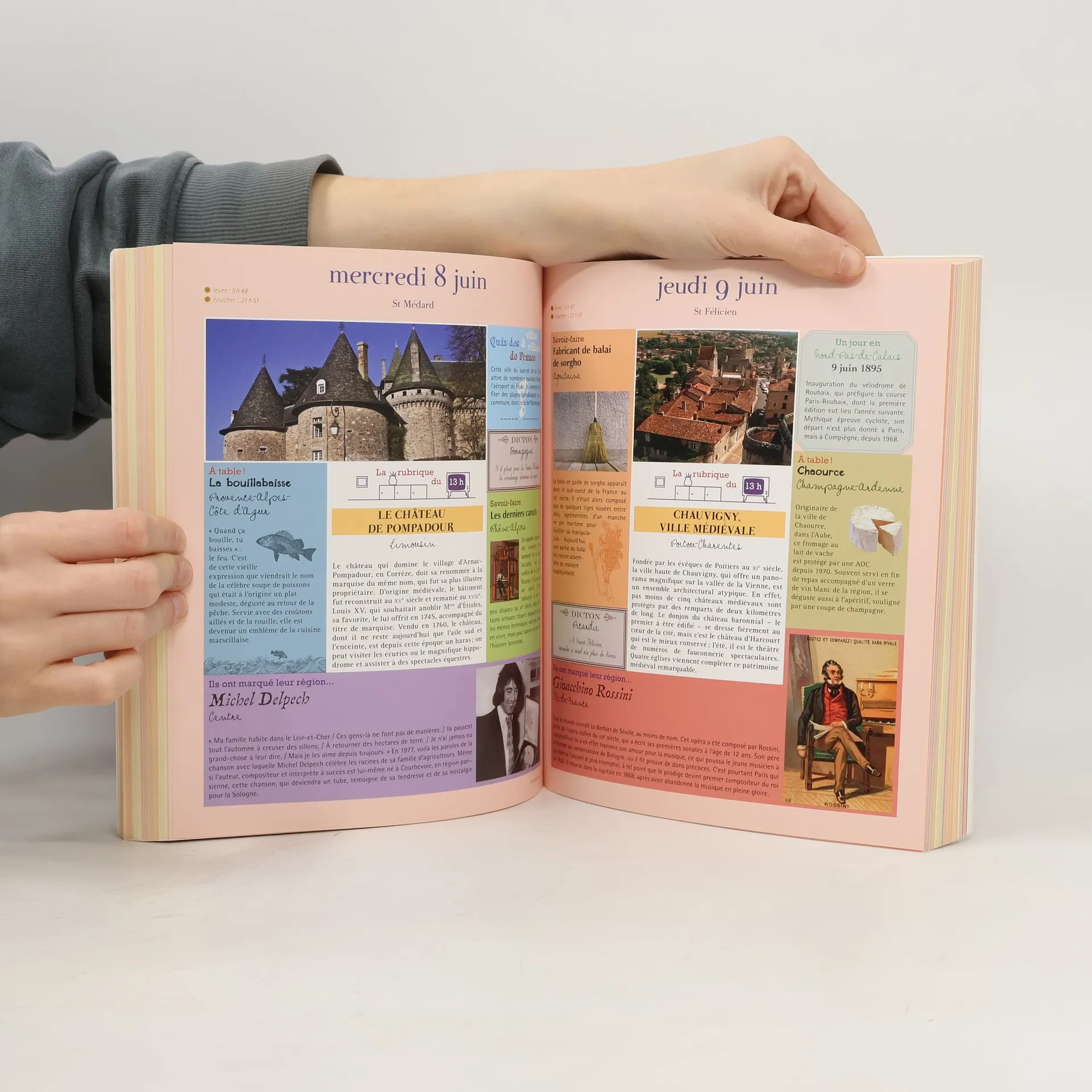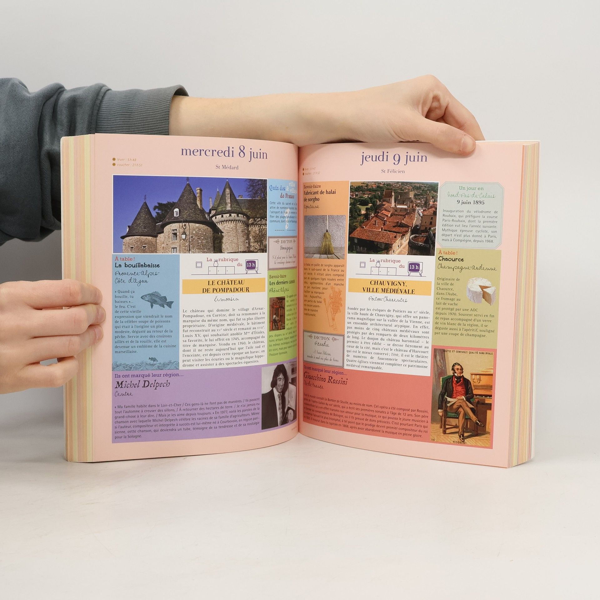 C'est sous forme d'un almanach illustré que Jean-Pierre Pernaut vous fait voyager à travers la France. Plusieurs thématiques s'articulent autour de sa chronique phare, " La rubrique du 13 h ", qui vous emmène à la découverte d'un village, d'une ville ou d'un site méritant que l'on s'y attarde ; c'est le cas de Cabourg au charme rétro, de la Côte basque, ou encore de Brantôme, en Aquitaine, surnommée la " Venise du Périgord ". " A table ! " vous livrera des recettes pour confectionner et déguster les plats régionaux (salade périgourdine, tarte aux noix, tourteau fromager, piperade au jambon de Bayonne, etc.). Avec la rubrique " Savoir-faire ", vous découvrirez le travail des filandières de l'île d'Ouessant, des restaurateurs de tapisseries anciennes à Aubusson, du fabricant de pipe de Bruyère en Franche-Comté, du vannier d'osier picard... Vous saurez tout sur les fêtes traditionnelles et autres festivals, auxquels vous pouvez assister d'un bout à l'autre de la France, et serez incollables sur les personnalités locales avec la rubrique " Ils ont marqué leur région " (Camille Claudel en Picardie, Dany Boon dans le Nord, Clovis à Soissons...). Vous retrouverez également des dictons, proverbes, citations du jour, des devinettes, un quiz sur les villes de France..., autant d'éléments afin d'en apprendre chaque jour davantage sur vos régions. Enfin, chaque week-end, une thématique " Mythes et légendes " vous est présentée, pour vous faire tout connaître des croyances de nos villages et des personnages fabuleux qui les peuplent...