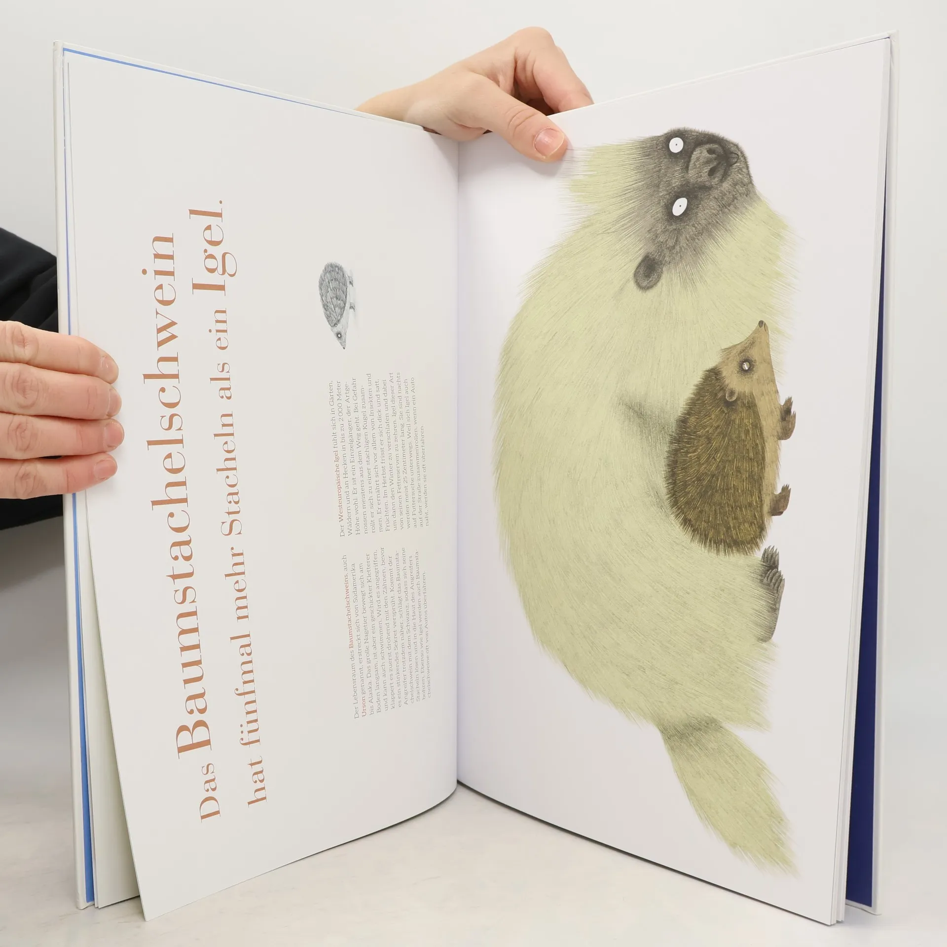 Wie viele Braunbären muss man nebeneinander stellen, damit sie so breit sind wie ein Riesenkalmar lang? Ein Tierbuch, wie es unterhaltsamer und lustiger nicht sein könnte: Das Baumstachelschwein verteidigt sich gegen Angreifer mit seinem Schwanz – so weit, so gut. Aber wer weiß schon, dass es fünfmal mehr Stacheln hat als der heimische Igel? Oder dass die Nase des Nasenaffen so lang werden kann wie ein Gleithörnchen? Und dass drei Elefanten so schwer sind wie der Kopf des Pottwals? Diese und zahlreiche andere überraschende und lustig komische Vergleiche und Fakten erlauben einen ganz neuen Blick auf ein beliebtes Thema. Und durch das große, nach oben aufklappende Buchformat lassen sich die fulminaten Illustrationen besonders gut bestaunen.