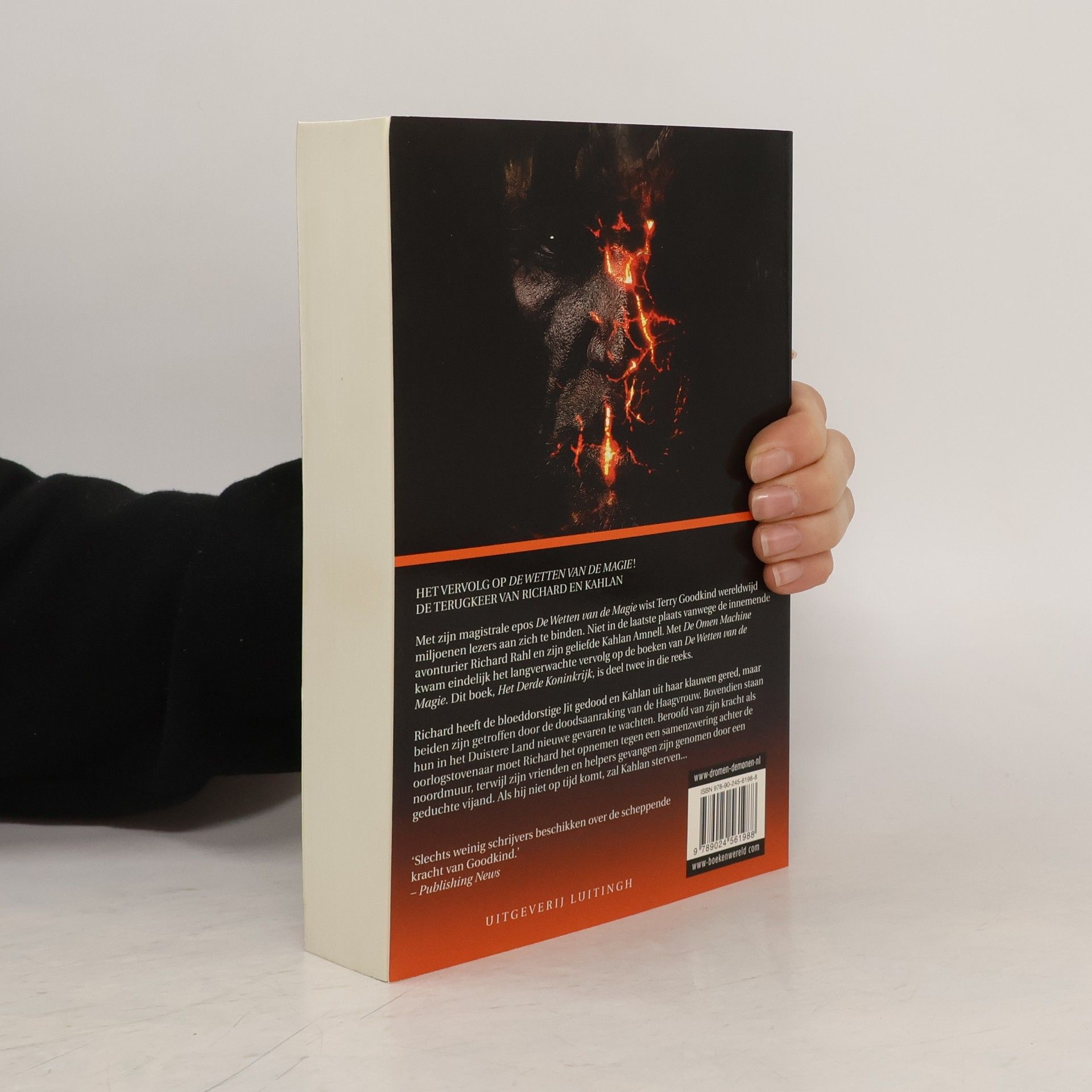 HET VERVOLG OP DE WETTEN VAN DE MAGIE! DE TERUGKEER VAN RICHARD EN KAHLANMet zijn magistrale epos De Wetten van de Magie wist Terry Goodkind wereldwijd miljoenen lezers aan zich te binden. Niet in de laatste plaats vanwege de innemende avonturier Richard Rahl en zijn geliefde Kahlan Amnell. Met De Omen Machine kwam eindelijk het langverwachte vervolg op de boeken van De Wetten van de Magie. Dit boek, Het Derde Koninkrijk, is deel twee in die reeks.Richard heeft de bloeddorstige Jit gedood en Kahlan uit haar klauwen gered, maar beiden zijn getroffen door de doodsaanraking van de Haagvrouw. Bovendien staan hun in het Duistere Land nieuwe gevaren te wachten. Beroofd van zijn kracht als oorlogstovenaar moet Richard het opnemen tegen een samenzwering achter de noordmuur, terwijl zijn vrienden en helpers gevangen zijn genomen door een geduchte vijand. Als hij niet op tijd komt, zal Kahlan sterven...