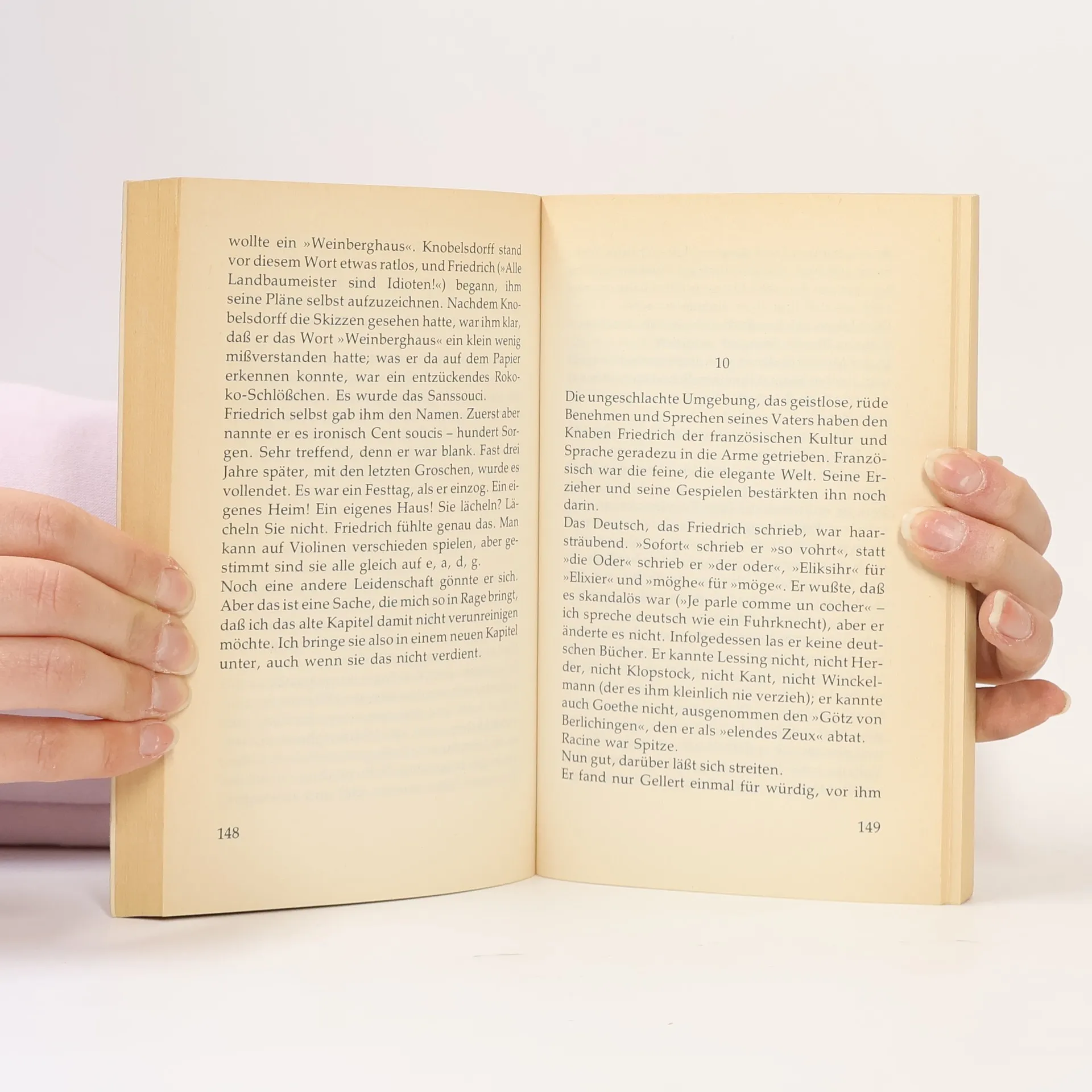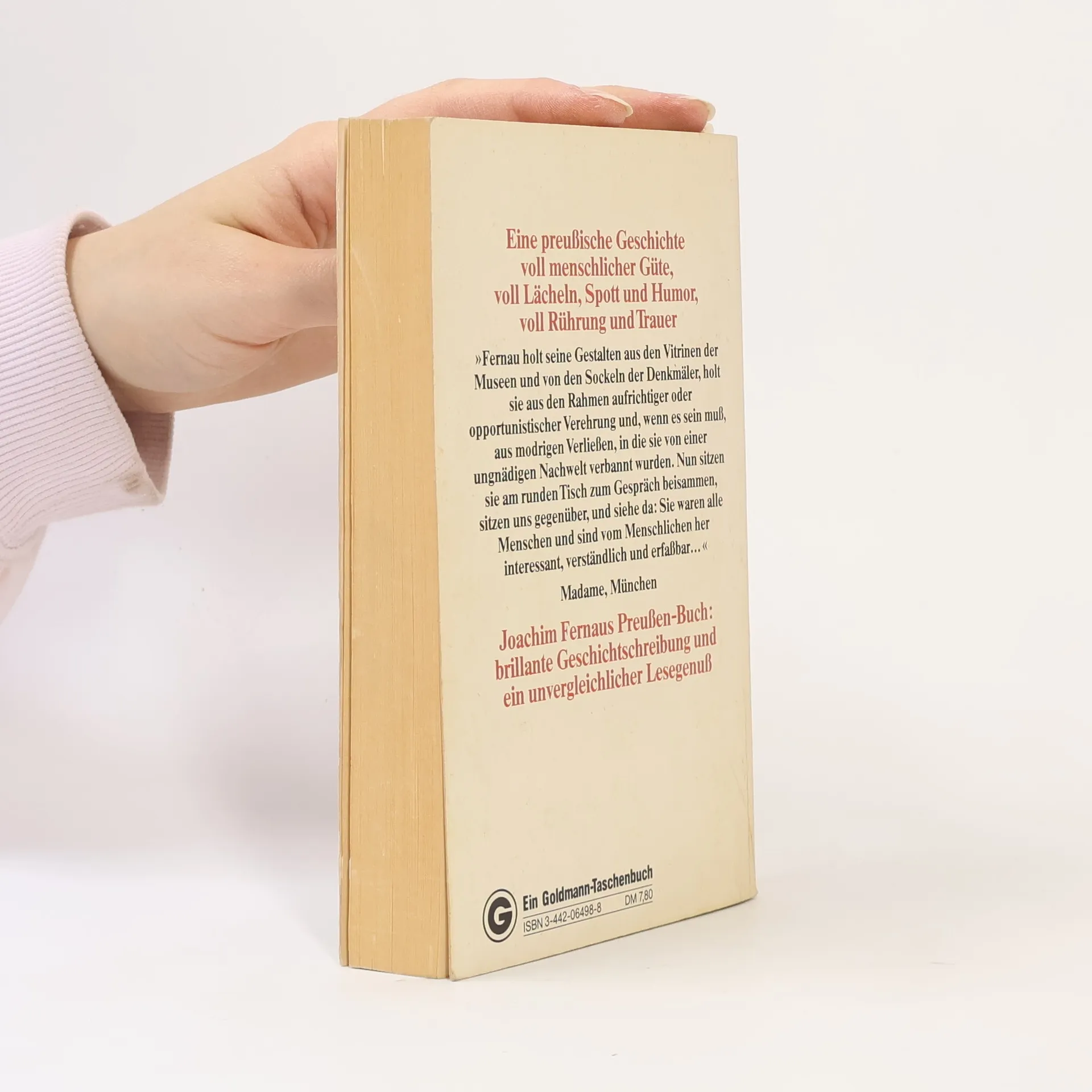 Die Geschichte der armen Leute? Bei einem solchen Untertitel erwartet man aufschlussreiche, aber eher trockene sozialhistorische Kost. Doch beim Lesen von Joachim Fernaus Werk Sprechen wir über Preußen wird man überrascht: Kein thematisches oder chronologisches Inhaltsverzeichnis, keine Abbildungen, sondern ein Buch, das auf den ersten Blick wie ein Roman aussieht. Man stöbert hinein und stellt erfreut fest, dass es sich fast wie ein Roman liest. Statt sachlicher Geschichtsbeschreibung erwartet den Leser eine lebendige Abhandlung über Preußens Entwicklung. Fernau unternimmt eine Wanderung durch das historische Preußen, beschreibt den Alltag im Überlebenskampf gegen Armut, Seuchen und Ganoven, und gewährt Einblicke in die Kasernenhöfe mit ihrem harten Militärdrill. Er beleuchtet die herrschaftlichen Sitze und erklärt den Einfluss der preußischen Herrscher auf Staat, Regierungsstil und Politik, die das Leben der Bürger prägten. Zwar ist das Buch kein klassisch-informatives Geschichtsbuch mit hohem Nachschlagewert, dafür vermittelt es Preußen-Fakten auf ungewohnte Weise. Wer eine wissenschaftlichere Aufbereitung sucht, findet in traditionellen Geschichtsbüchern Alternativen. Fernaus Arbeit verdient das Prädikat "Ein etwas anderes Geschichtsbuch".
