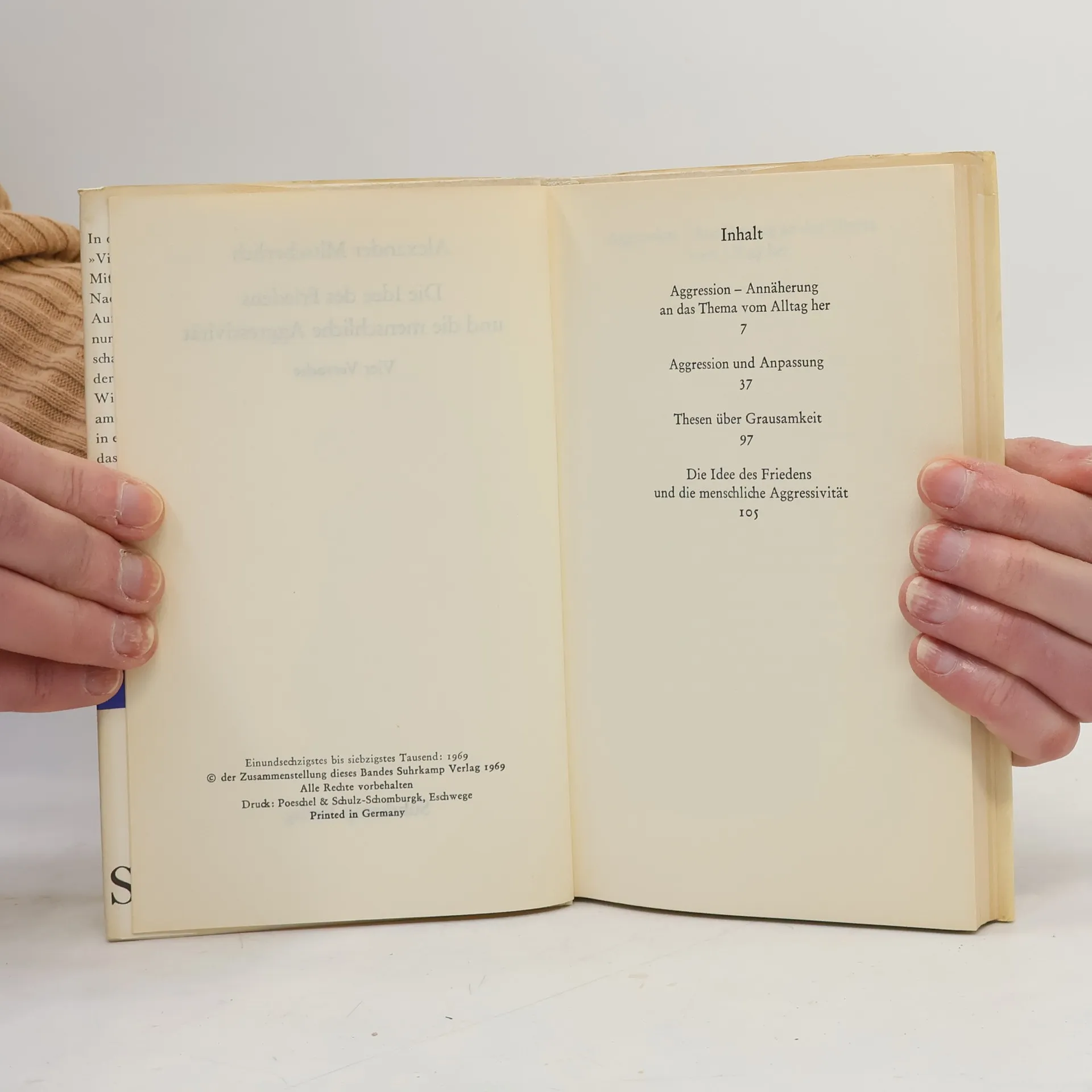 Dieser Band umfasst acht Aufsätze und die Rede, die der berühmte Forscher 1969 in Frankfurt hielt, als ihm der Friedenspreis des Deutschen Buchhandels übergeben wurde. In allen diesen Arbeiten geht Mitscherlich das Thema der menschlichen Aggressivität von der Welt- und Alltagssituation her an, in der wir heute leben.