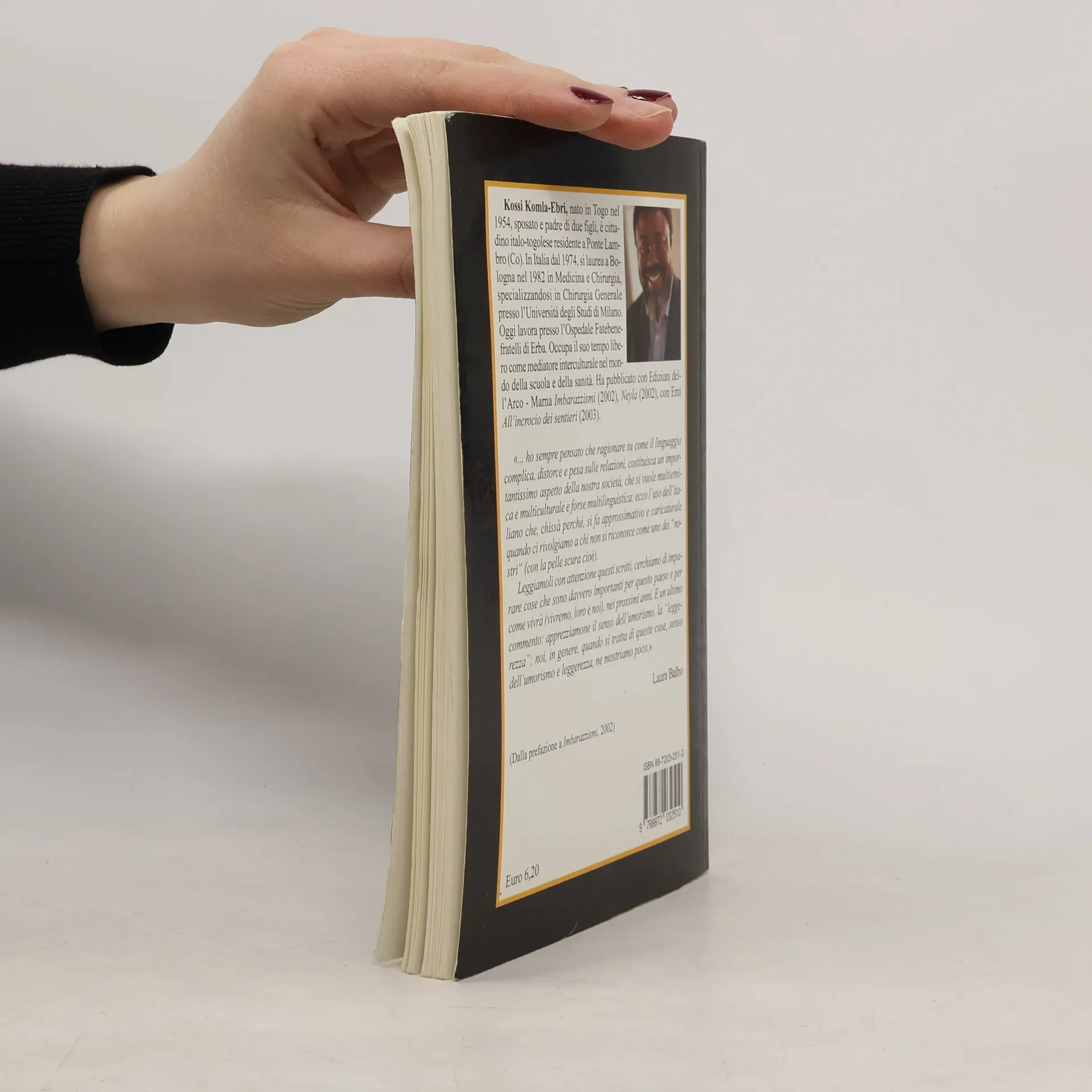 Kossi Komla-Ebri, il più “lombardo” tra i nuovi autori africani, ci fa riflettere e commuovere. Ci parla di partenze e di ritorni, di assimilazione e di identità culturale, ma lo fa lasciando libero spazio alla creatività racchiusa nel bagaglio personale di tutti i migranti.Kossi Komla-Ebri, nato in Togo nel 1954, sposato e padre di due figli, è cittadino italo-togolese residente a Ponte Lambro (Co).In Italia dal 1974, si è laureato a Bologna nel 1982 in Medicina e Chirurgia, specializzandosi in Chirurgia Generale presso l’Università degli Studi di Milano.Oggi lavora presso l’Ospedale Fatebenefratelli di Erba.Autore di diversi racconti, articoli, saggi e romanzi. Nel 2002 ha pubblicato con Edizioni dell’Arco-Marna la raccolta di aneddoti Imbarazzismi.