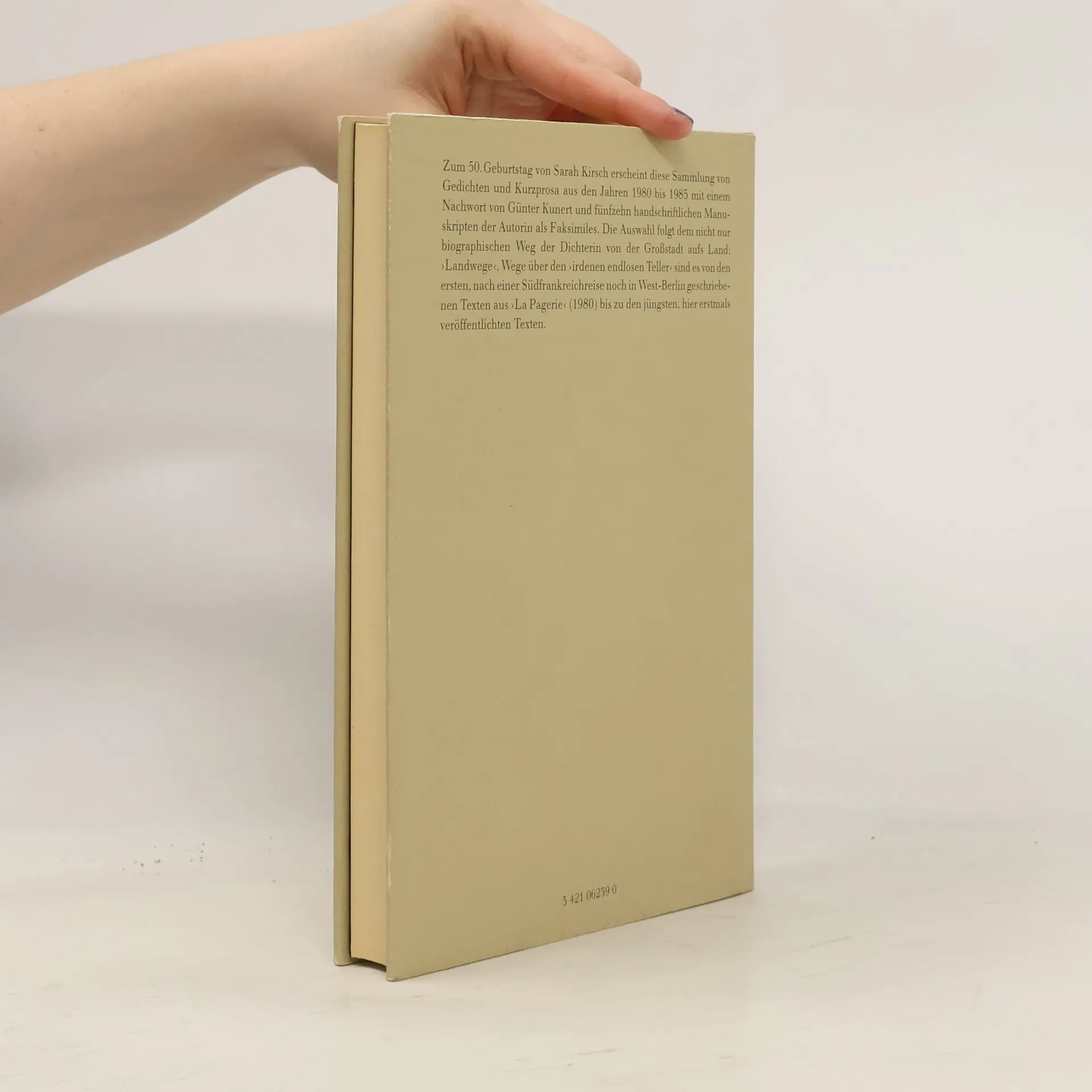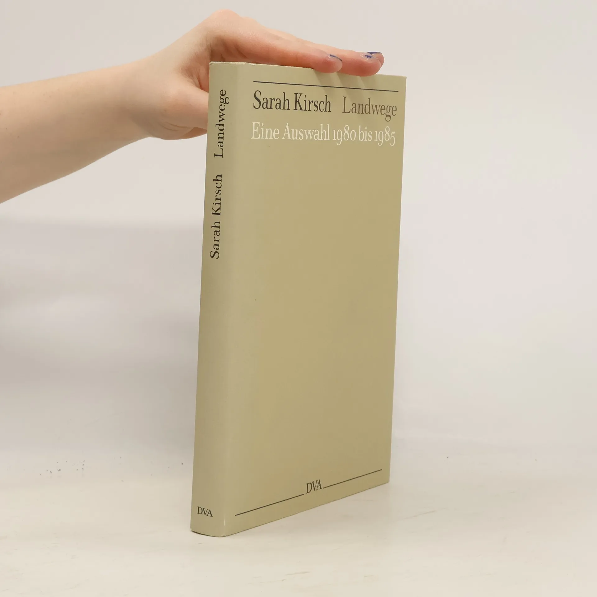 Sarah Kirsch: "Landwege. Eine Auswahl 1980-1985". Mit einem Nachwort von Günter Kunert und 15 faksimilierten Autographen. Deutsche Verlags-Anstalt, Stuttgart 1985. 175 S., geb., 26,- DM