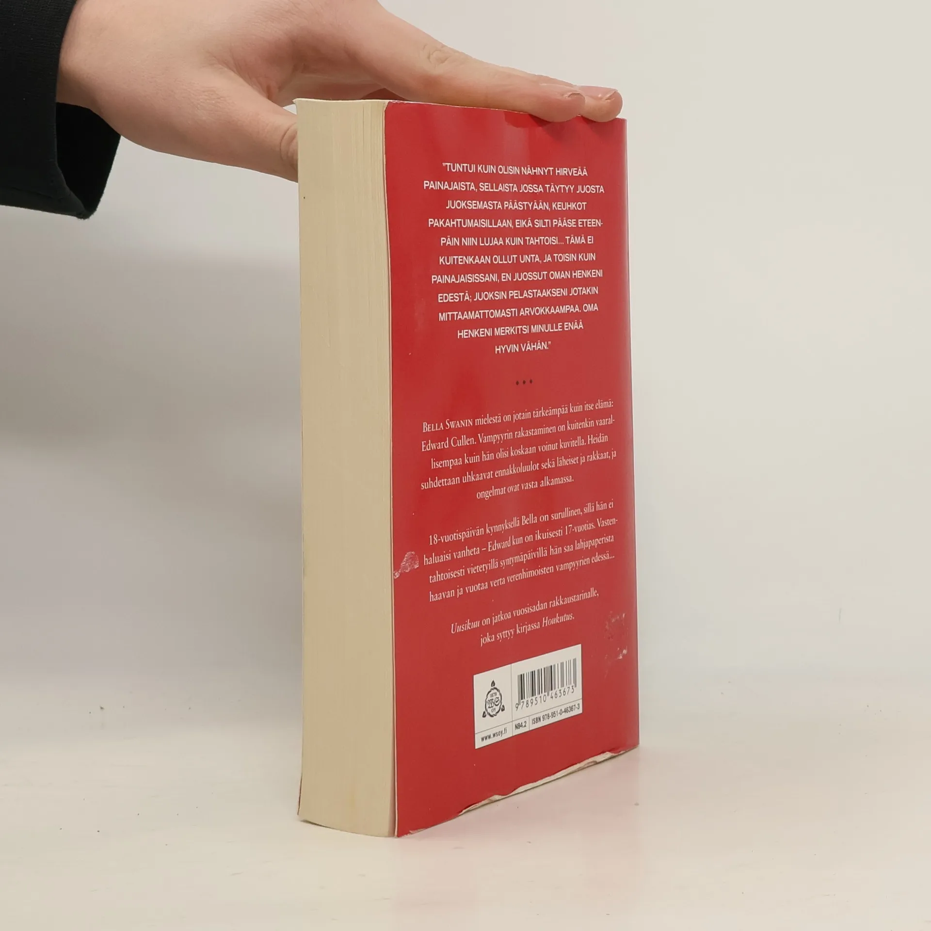 Suositun Twilight - Houkutus -kirjasarjan toinen osa! Bellan ja Edwardin rakkaustarina on vastustamaton yhdistelmä jännitystä, romantiikkaa ja yllättäviä käänteitä. Bellan ja Edwardin rakkaustarina on vastustamaton yhdistelmä jännitystä, romantiikkaa ja yllättäviä käänteitä. Bella Swanin mielestä on jotain tärkeämpää kuin itse elämä: Edward Cullen. Vampyyrin rakastaminen on kuitenkin vaarallisempaa kuin hän olisi koskaan voinut kuvitella. Heidän suhdettaan uhkaavat ennakkoluulot sekä läheiset ja rakkaat, ja ongelmat ovat vasta alkamassa. 18-vuotispäivän kynnyksellä Bella on surullinen, sillä hän ei haluaisi vanheta - Edward kun on ikuisesti 17-vuotias. Vastentahtoisesti vietetyillä syntymäpäivillä hän saa lahjapaperista haavan ja vuotaa verta verenhimoisten vampyyrien edessä...
