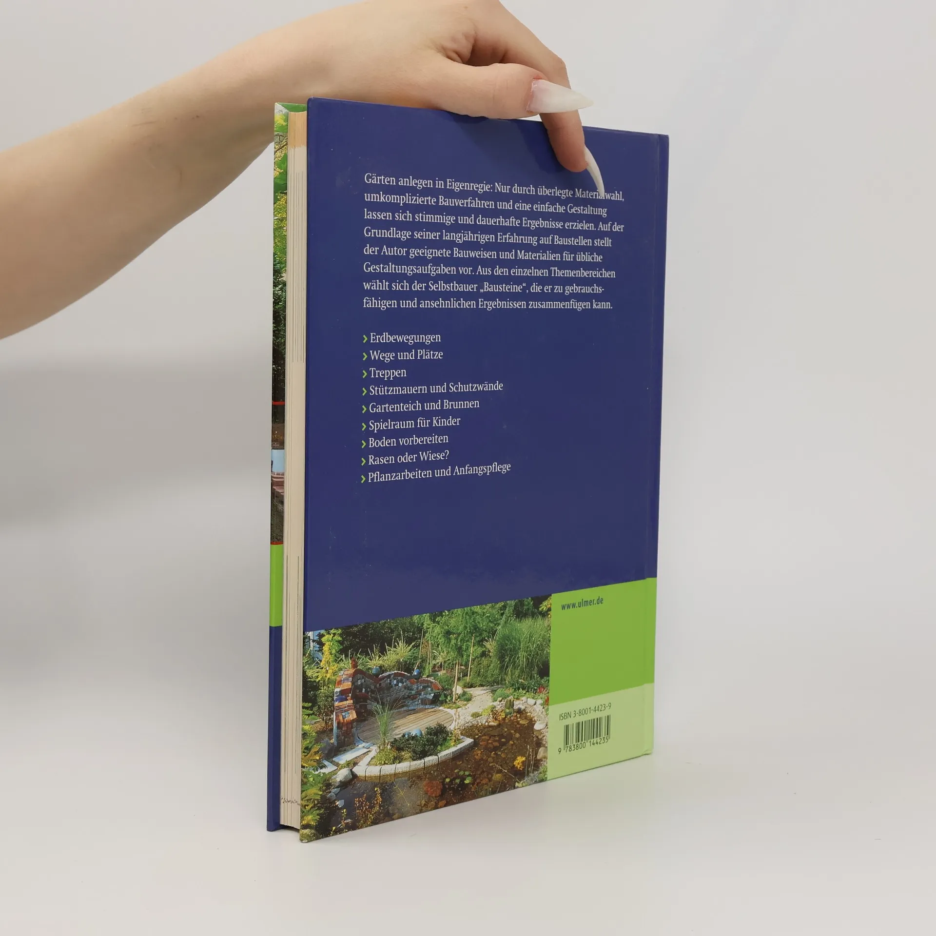 Das Buch gibt Ihnen eine sichere Hilfestellung für die wichtigsten Baumaßen bei der Neuanlage oder Umgestaltung von Gärten. Mit einfachen Mitteln, leichtem technischen Aufwand und mit wenigen Hilfskräften ist bei den beschriebenen Verfahren ein Bau in Eigenregie möglich. Auf der Grundlage seiner langjährigen Erfahrung als Gartenarchitekt stellt der Autor die besten Materialien für einfache Gestaltungsaufgaben vor. Bei den gebauten Elementen wie Treppen, Mauern und Gartenteich berücksichtigt er stets den begrenzten Raum der Hausgärten. Aus den einzelnen Themenbereichen können Sie sich als Selbstbauer „Bausteine“ auswählen, die Sie zu ansehnlichen Ergebnissen führen. Sämtliche Anleitungen sind in jahrelanger Anwendung erprobt und optimiert und hier in prägnanten Farbfotos dargestellt. Schwerpunkte des Bandes sind der Umgang mit Erde, Stein und Holz, die Anlage von Rasen oder Wiese sowie die Anfangspflanzung.