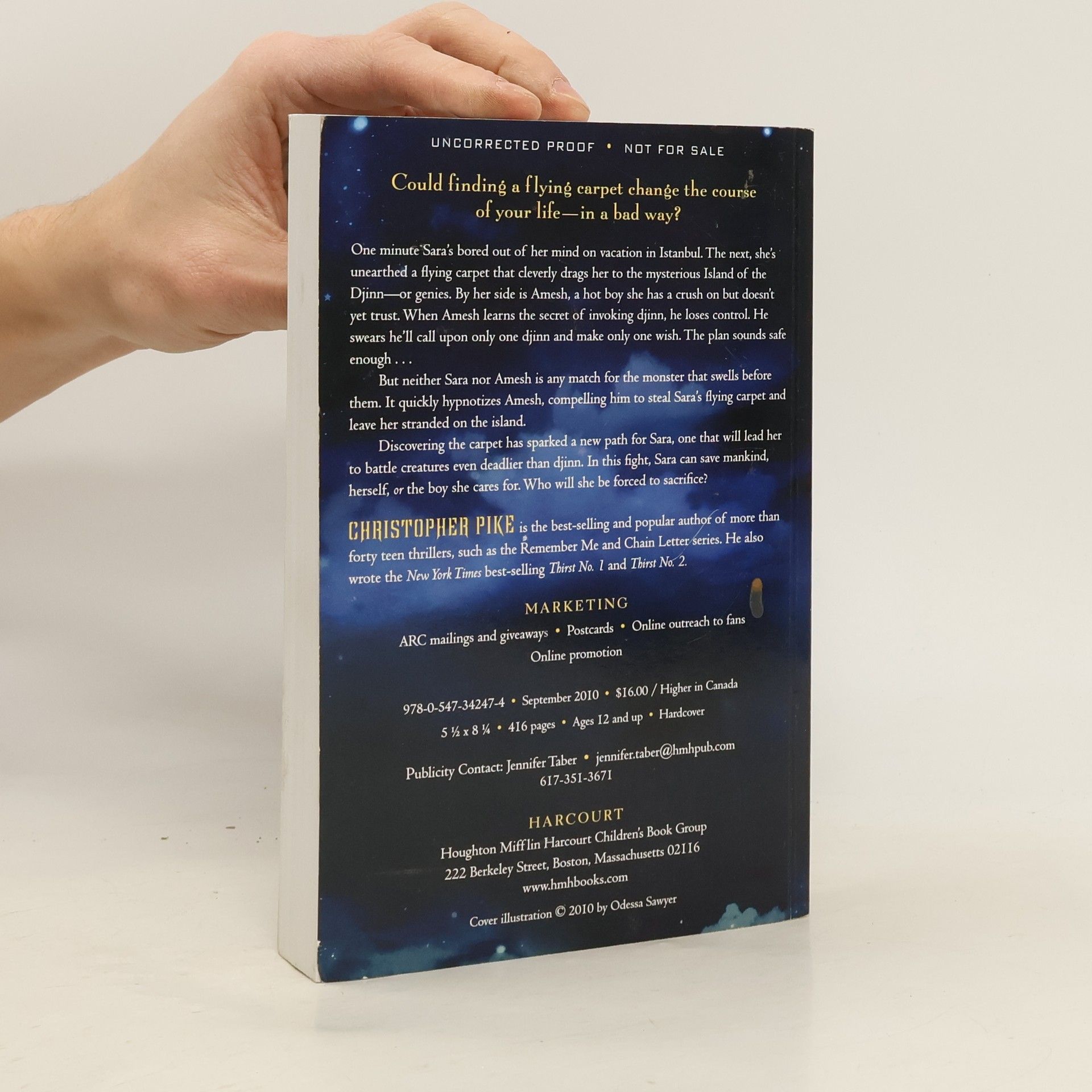 One minute Sara's bored on vacation in Istanbul. The next, she's unearthed a flying carpet that cleverly drags her to the mysterious Island of the Djinn—or genies. By her side is Amesh, a hot boy she's starting to love but doesn't yet trust. When Amesh learns the secret of invoking djinn, he loses control. He swears he'll call upon only one djinn and make one wish. The plan sounds safe enough. But neither Sara nor Amesh are any match for the formidable monster that that swells before them. It hypnotizes Amesh, compelling him to steal Sara’s flying carpet—the ancient Carpet of Ka—and leave her stranded.Discovering the Carpet of Ka has sparked a new path for Sara, one that will lead her to battle creatures even deadlier than djinn. In this fight, Sara can save mankind, herself, or the boy she loves. Who will she be forced to sacrifice?